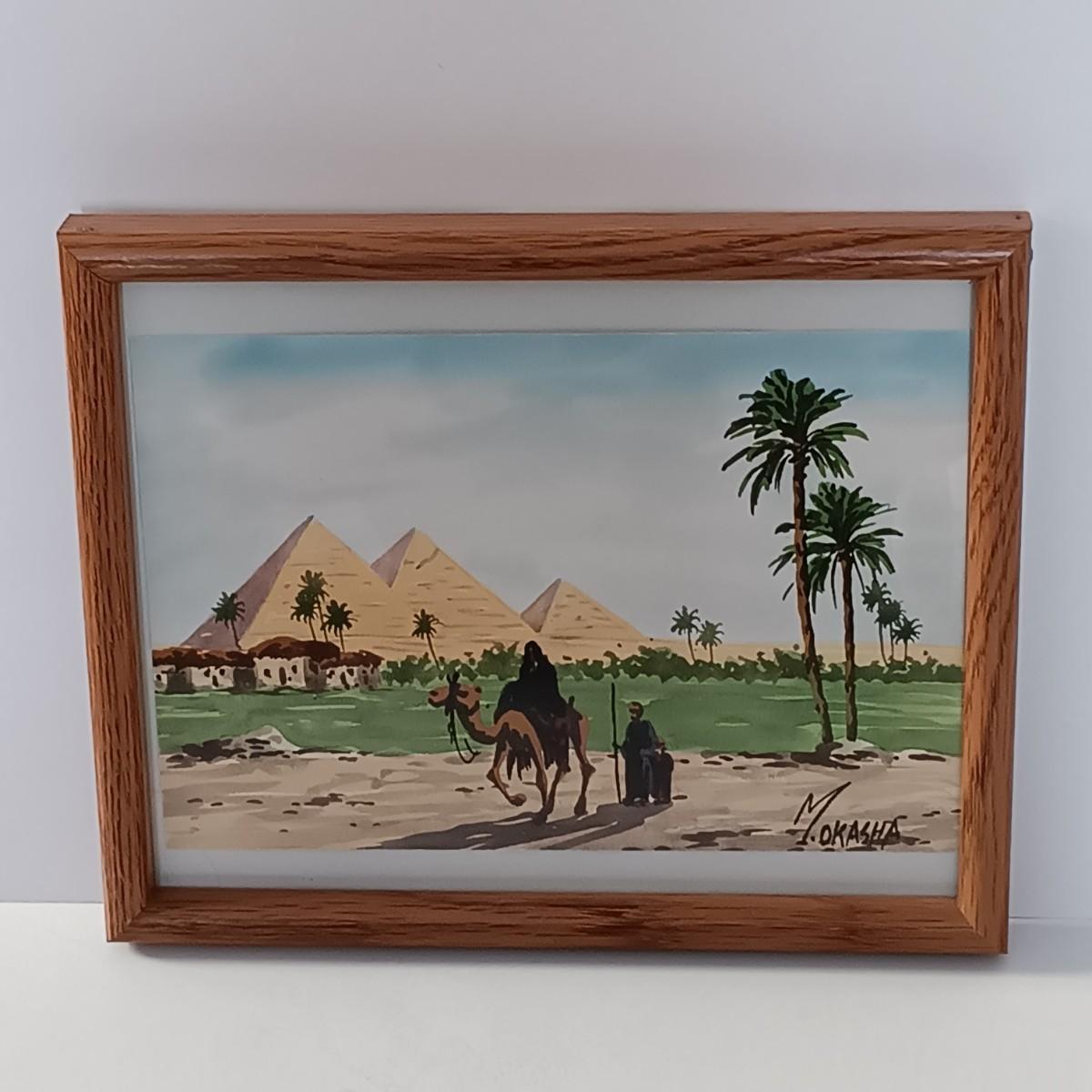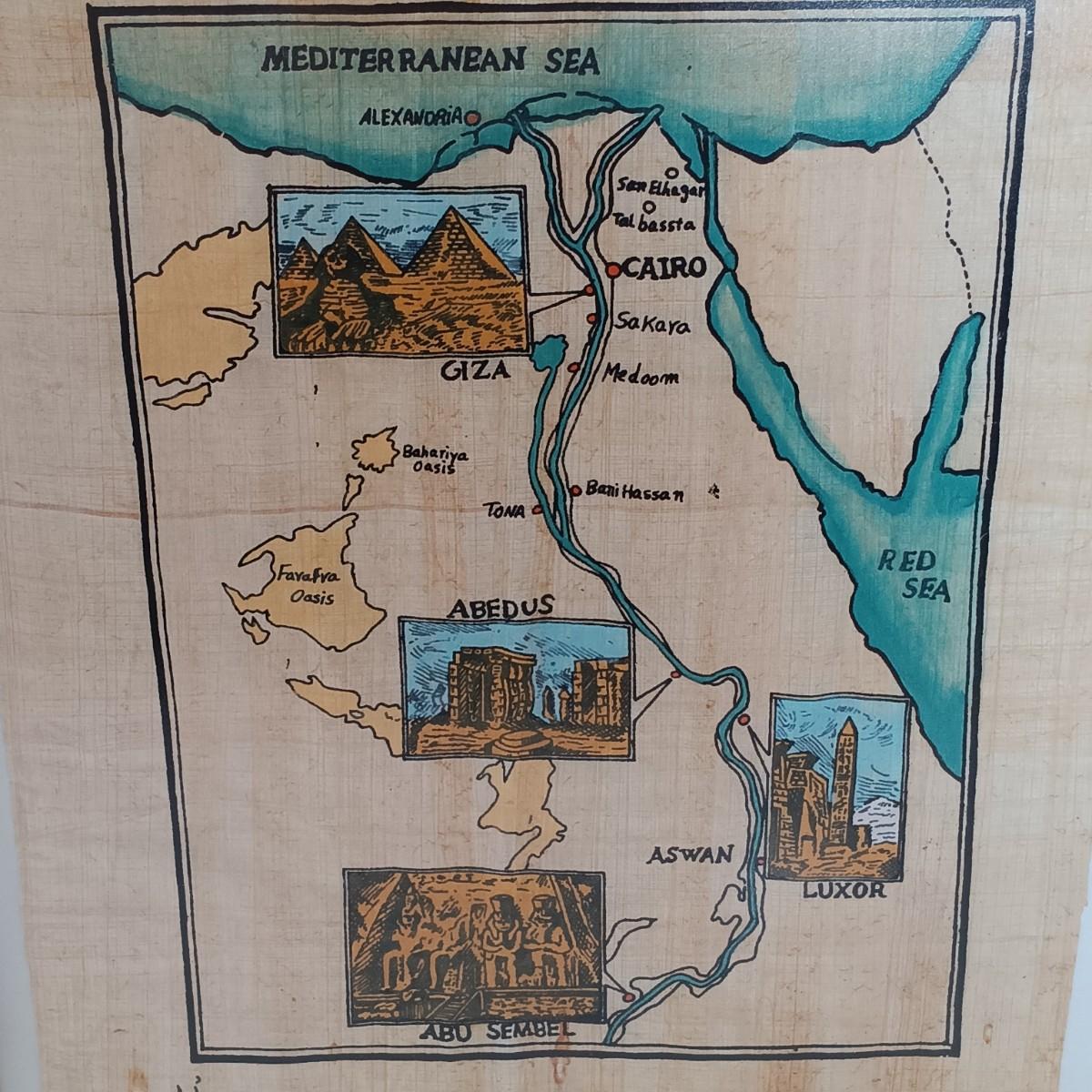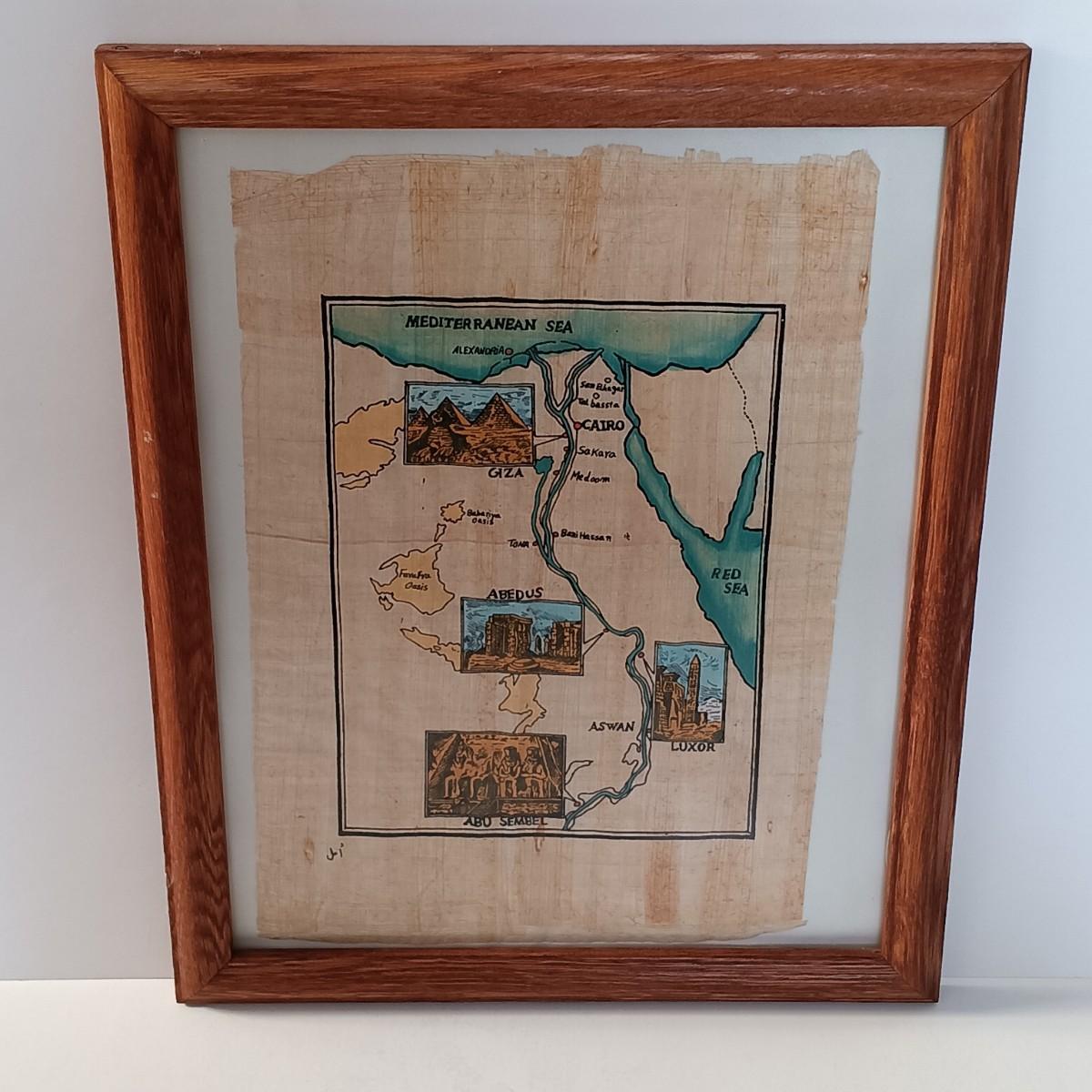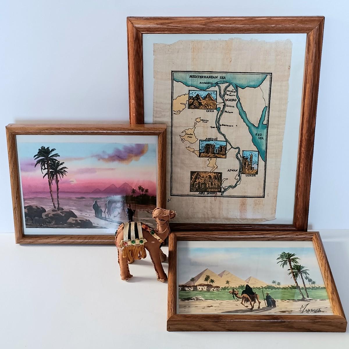 LOT 52L: Egypt Collection- Vintage Handpainted/Signed Papyrus Map, 2 M. Okasha Prints & Handstitched Leather Camel