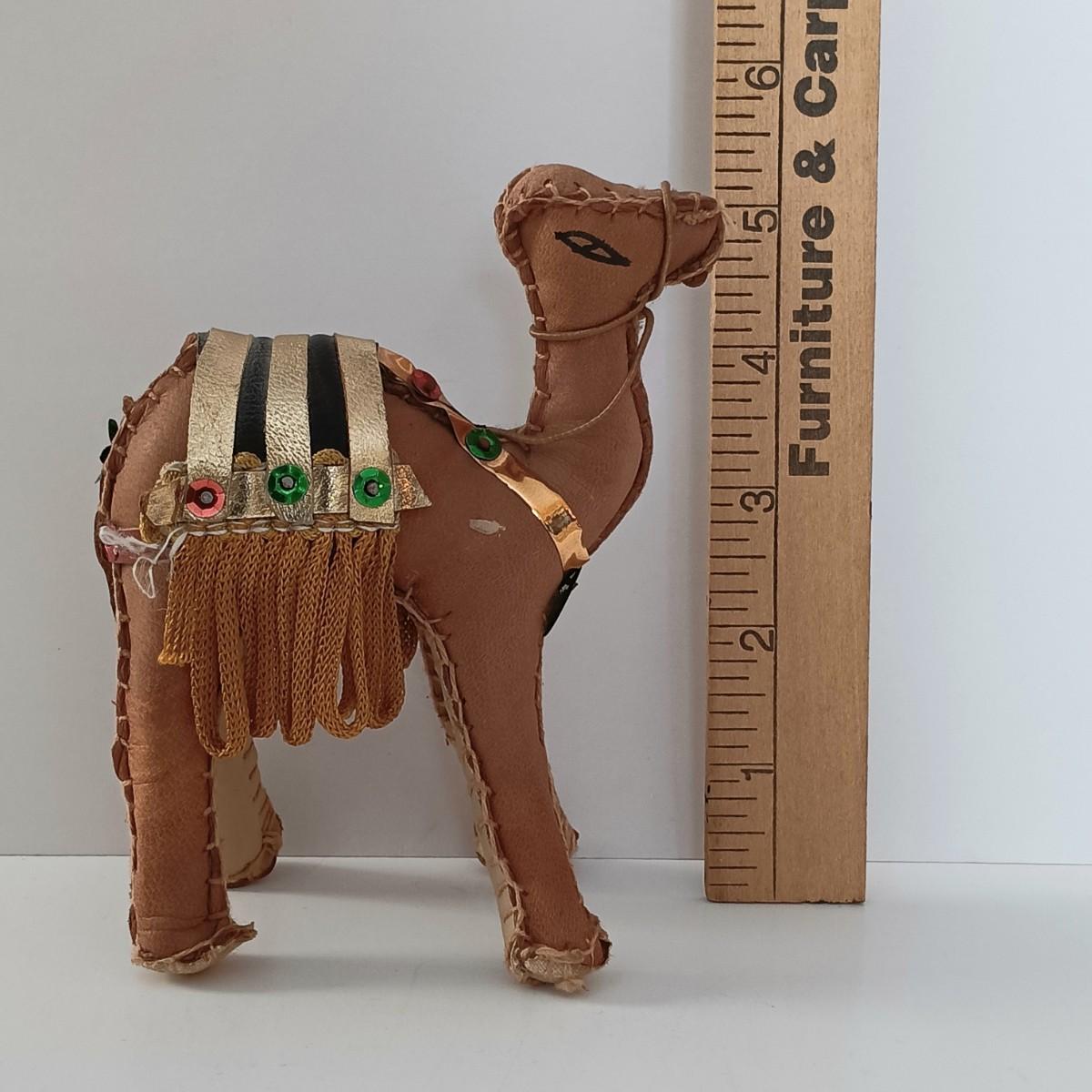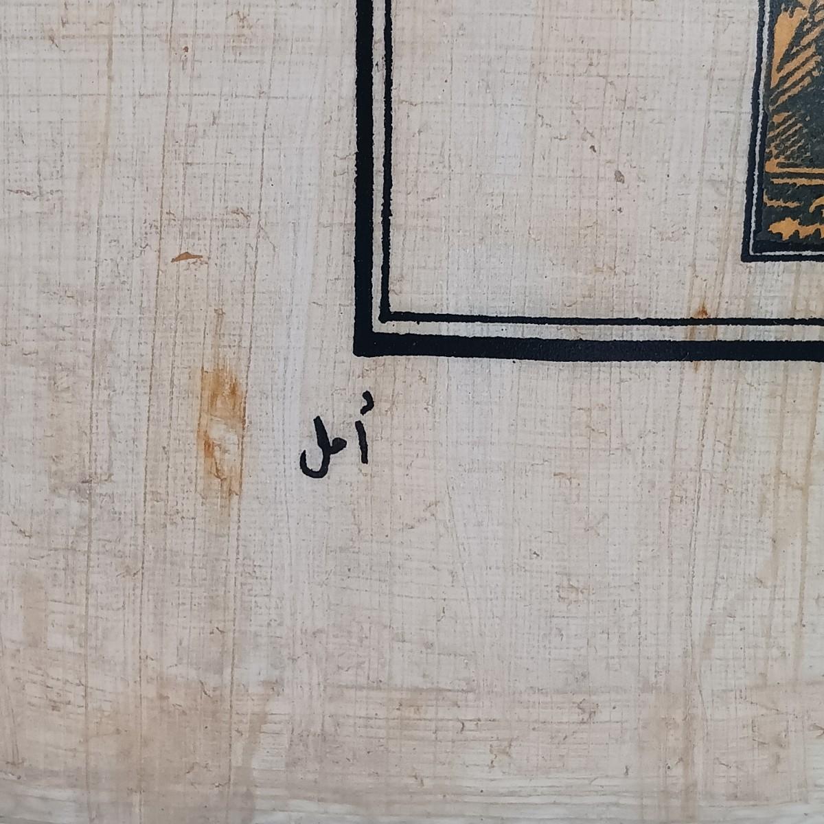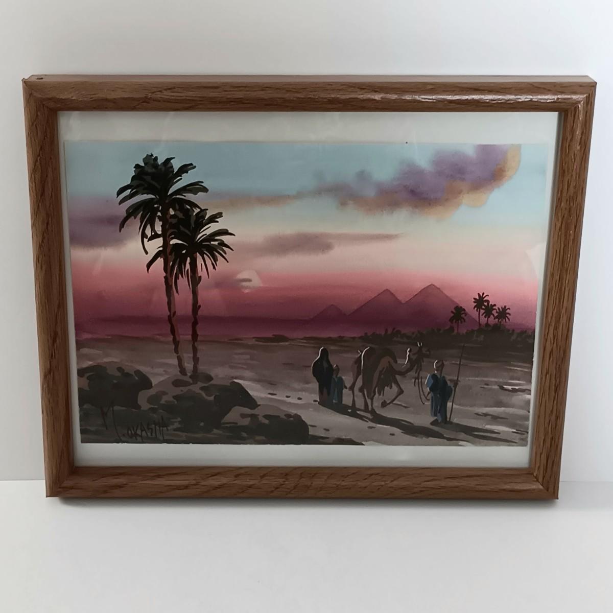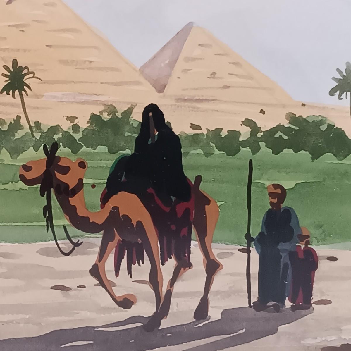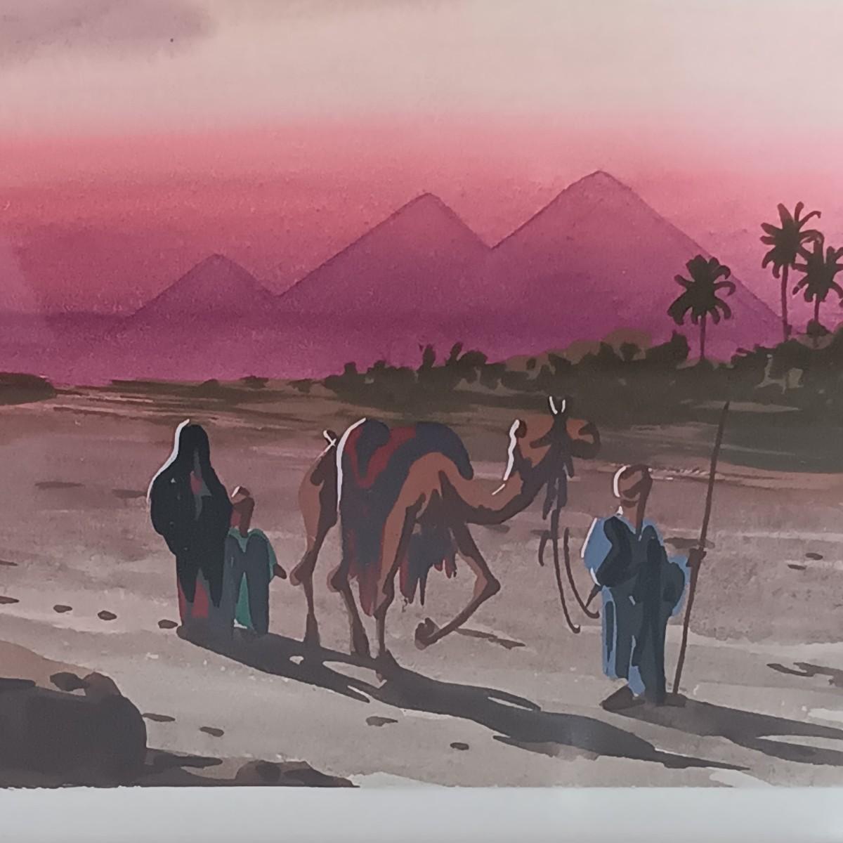 LOT 52L: Egypt Collection- Vintage Handpainted/Signed Papyrus Map, 2 M. Okasha Prints & Handstitched Leather Camel