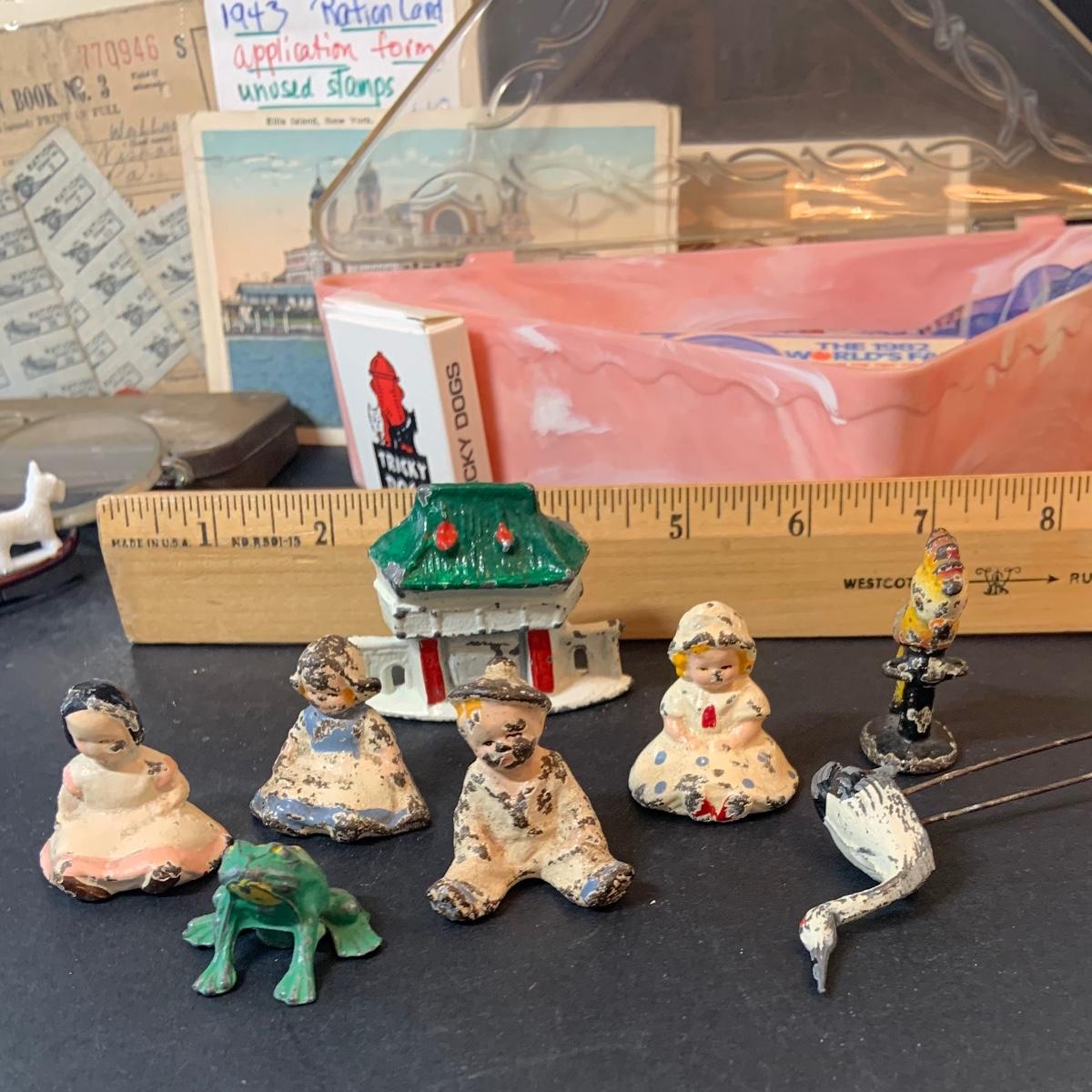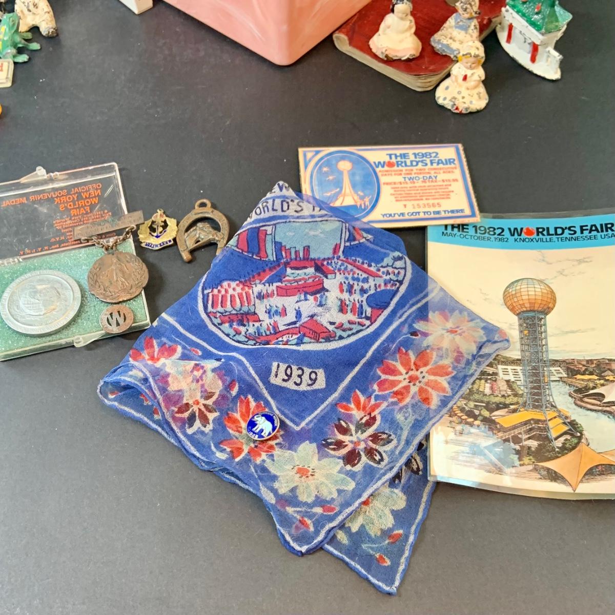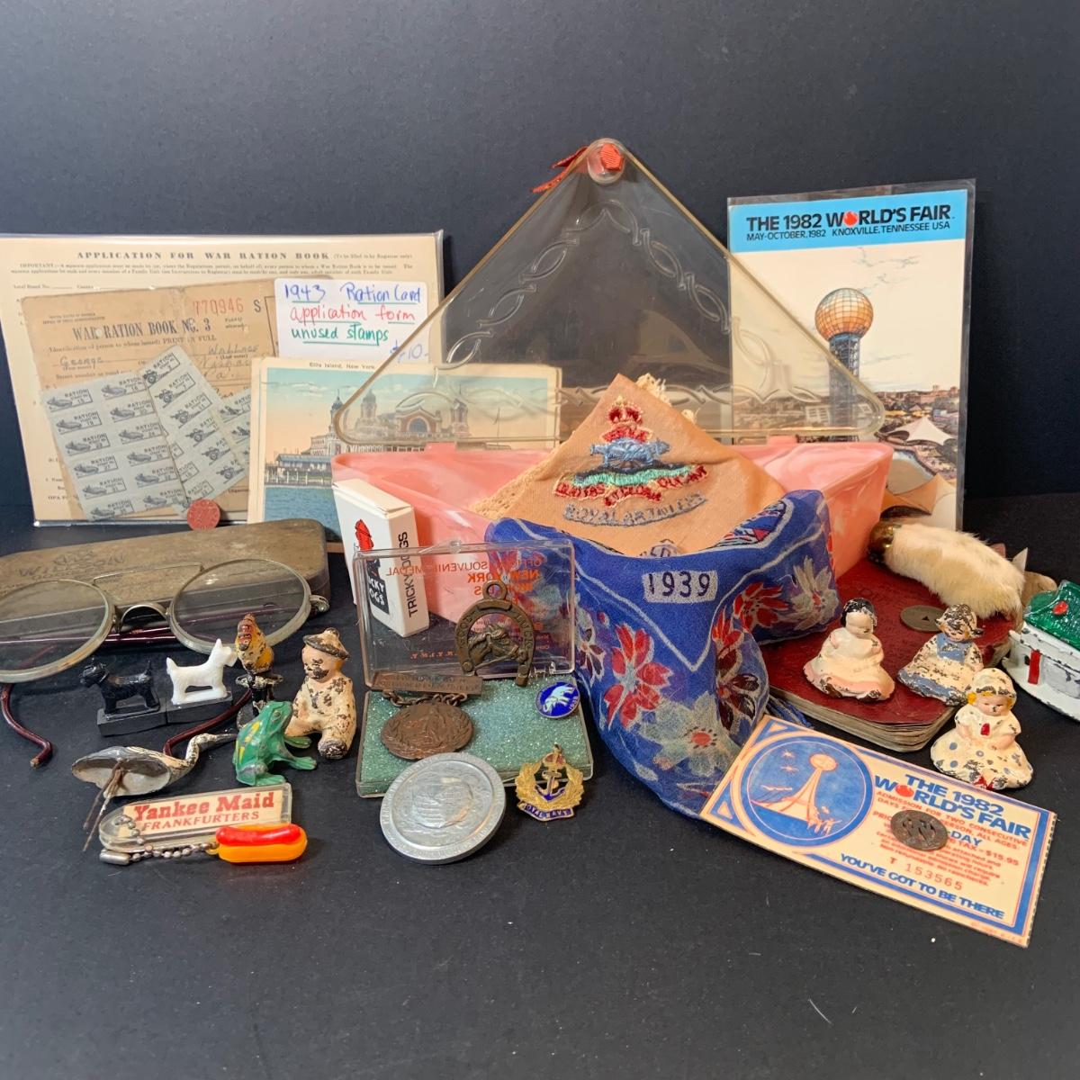 LOT:79: Collection of Vintage Memorabilia from the Worlds Fairs, WW II Ration Books Vintage Glasses, Metal Toys and More