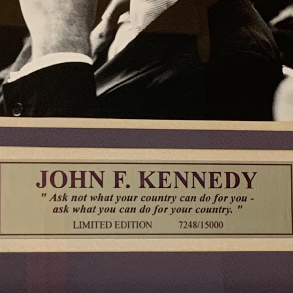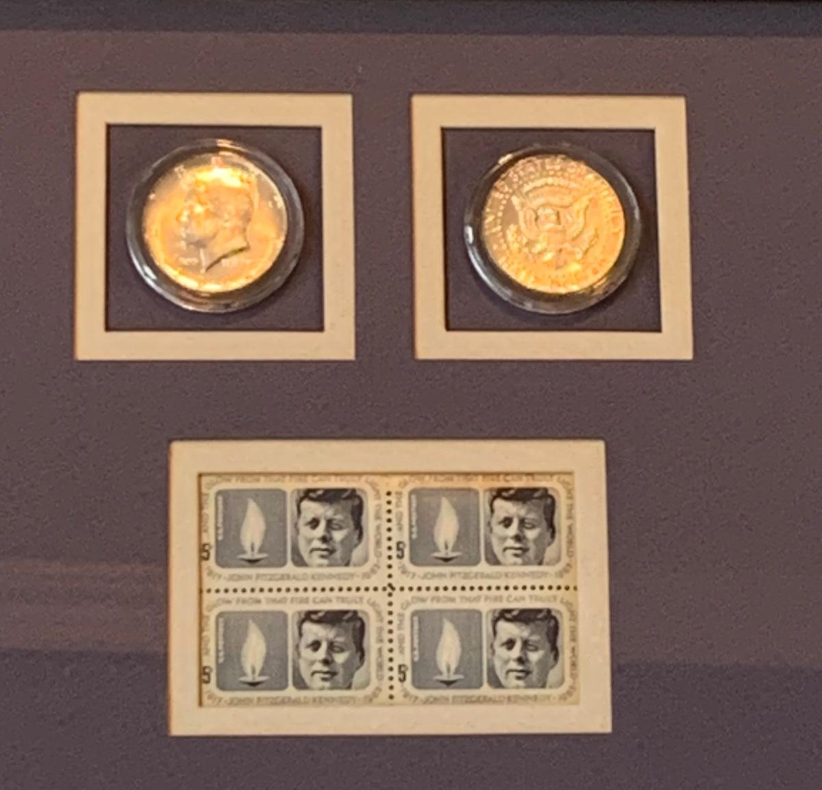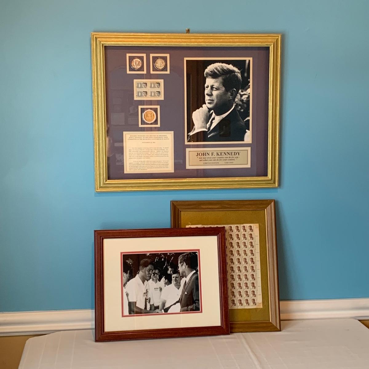 LOT 98L: John F. Kennedy Framed Collectible w/COA, Framed JFK Stamps, Vintage Photograph of JFK with young Bill Clinton, c1960
