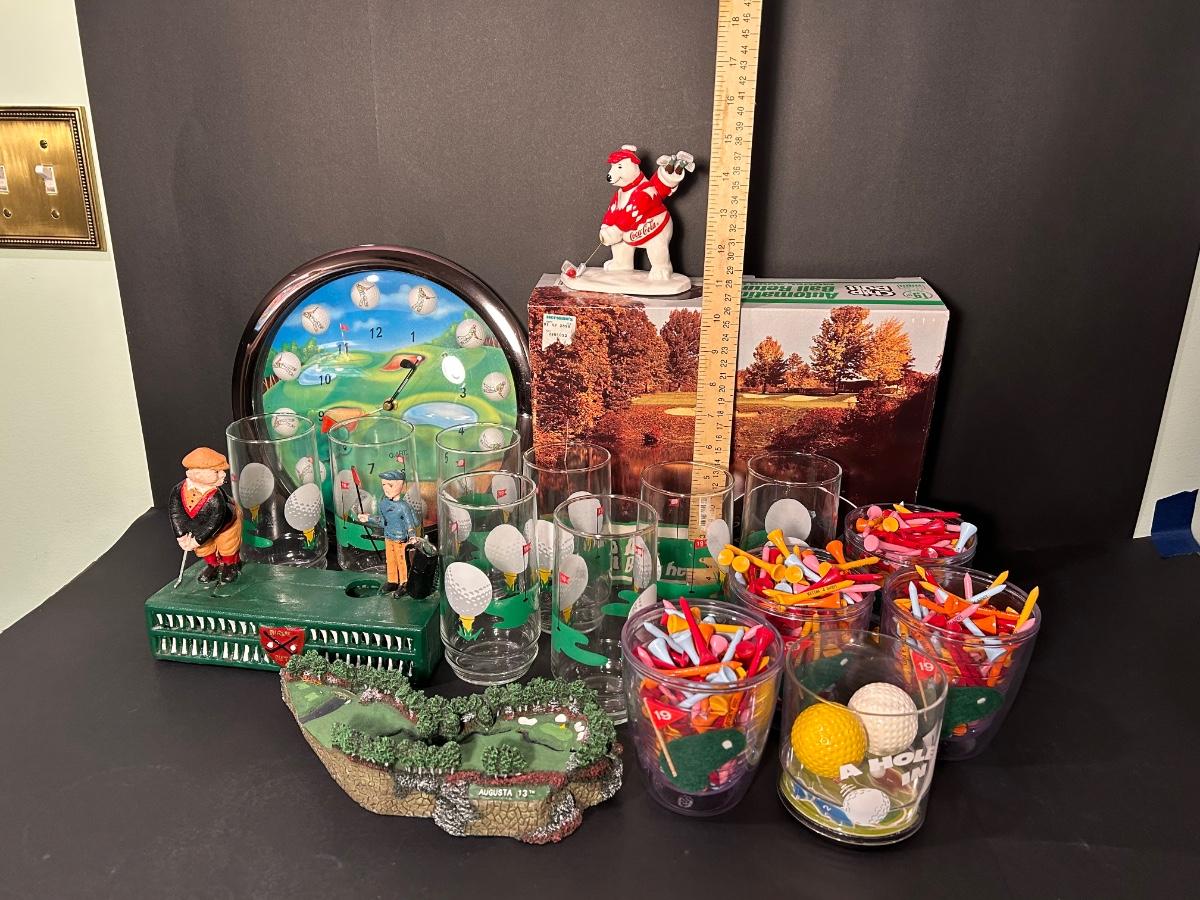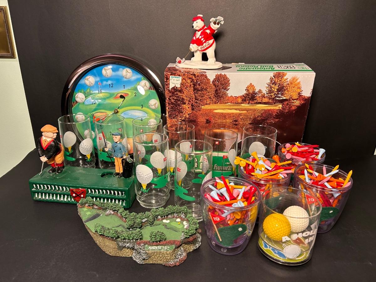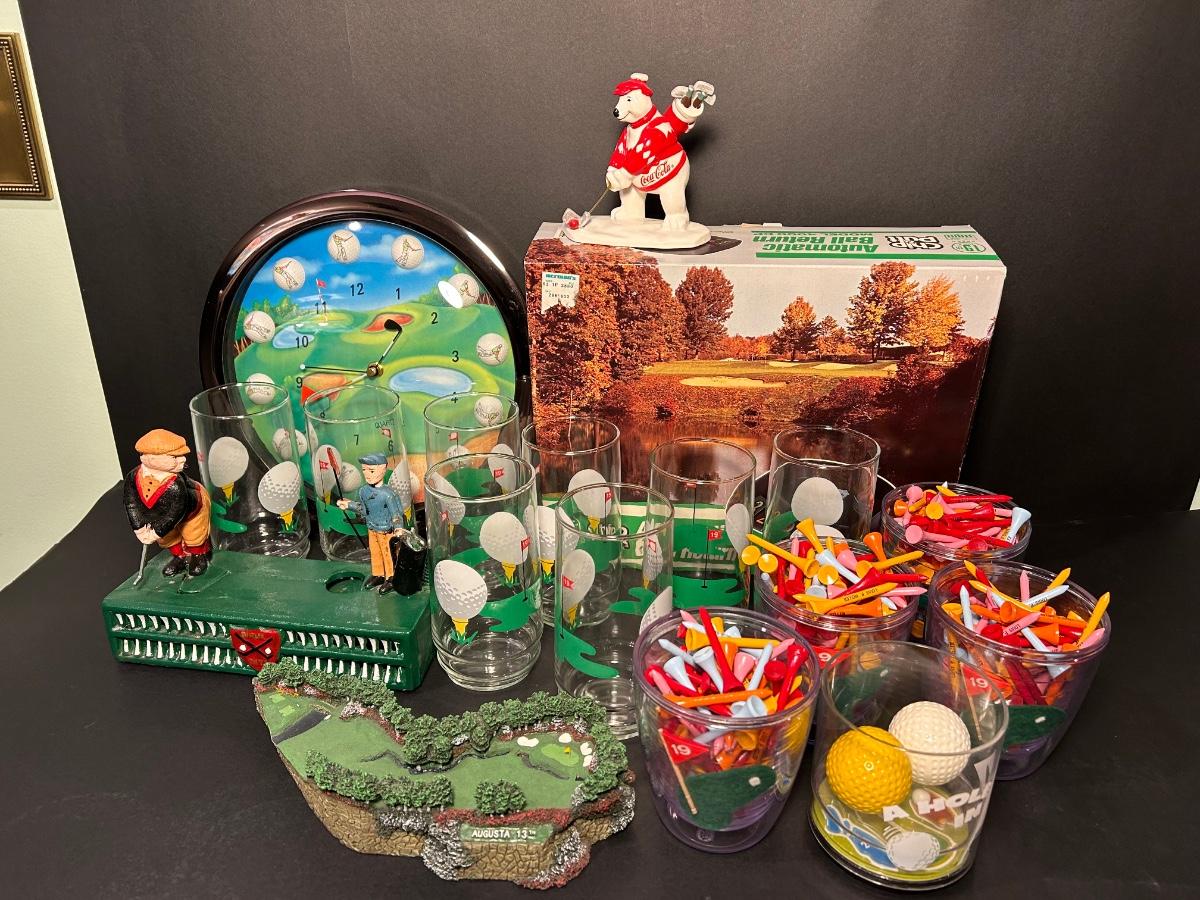 LOT 115FB: Golf Collection: Cast Iron Bank, Clock, Tumblers & More