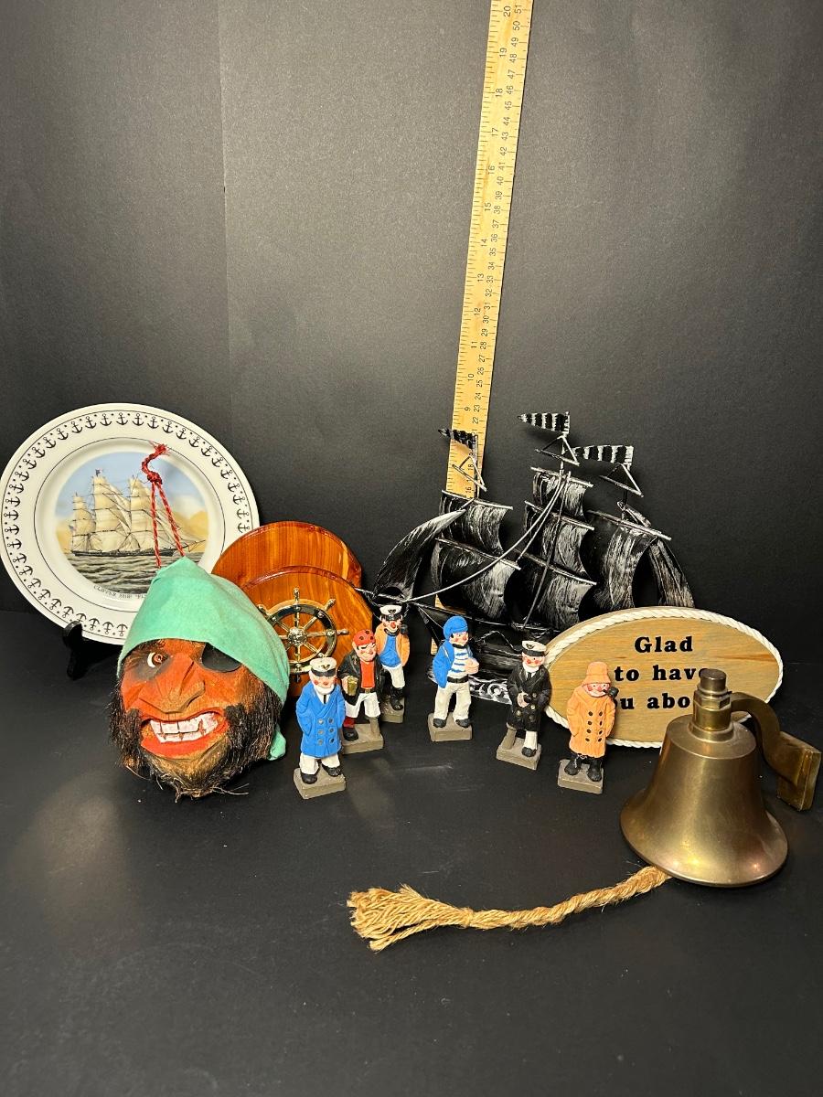 LOT 116FB: Nautical Collection: Pirate Coconut, Brass Ships Bells, Old Salt Figures & More