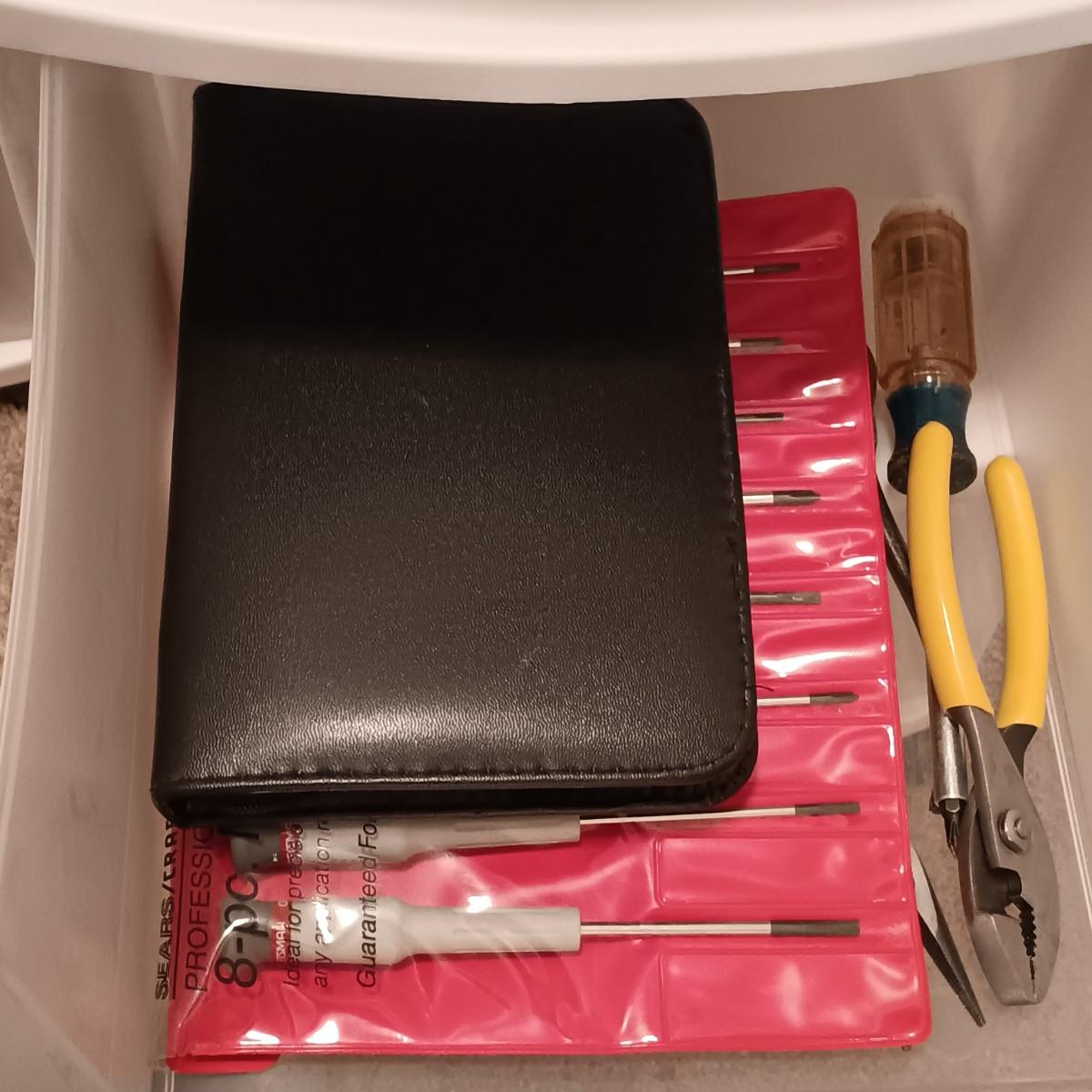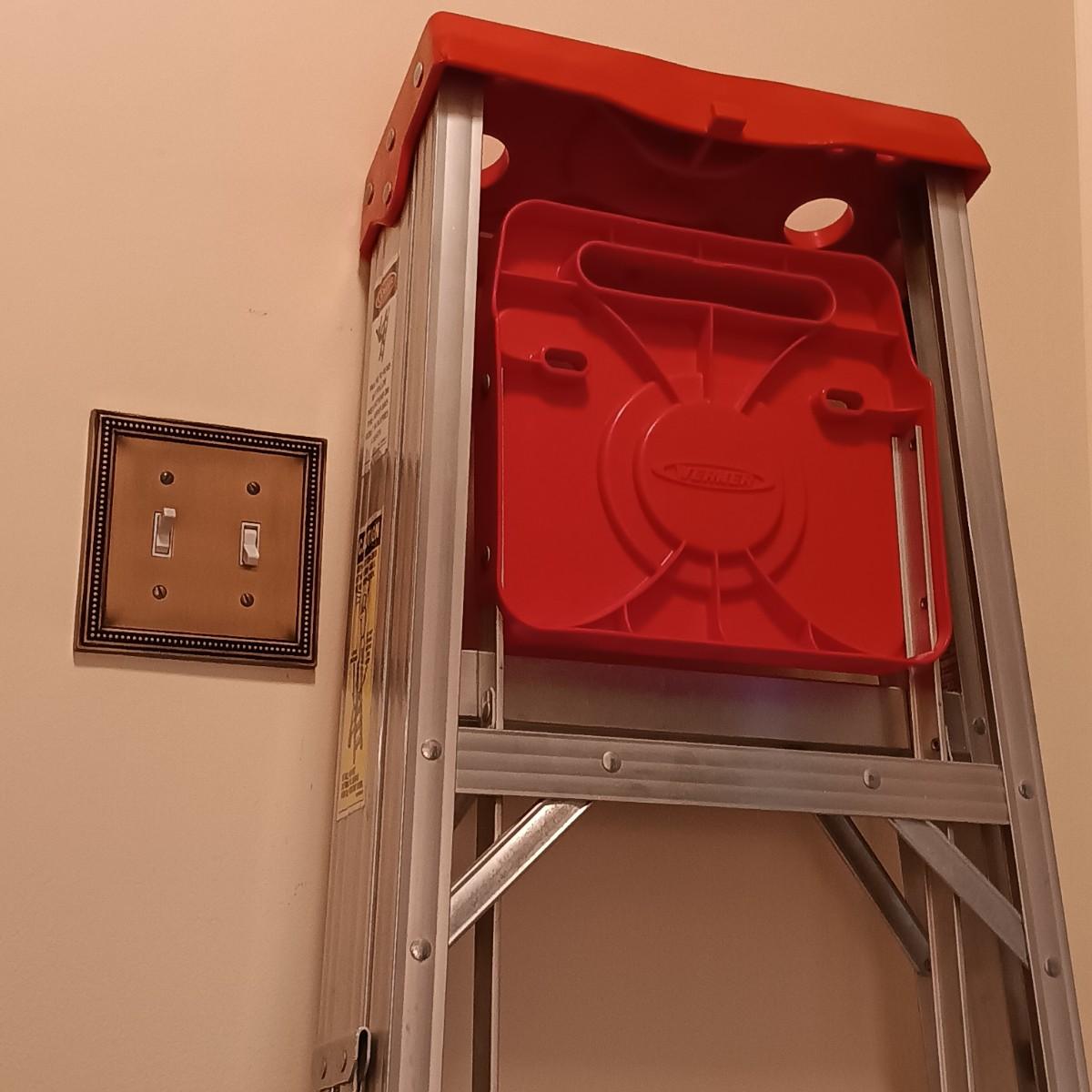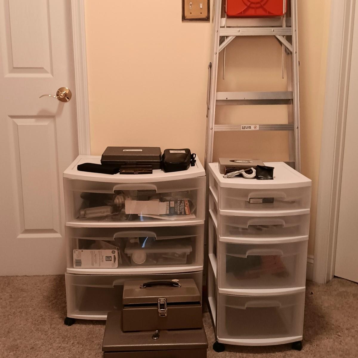 LOT 154UB: Handyman Lot- Assortment of Tools, Storage Bins, Light Bulbs, Ladder & More