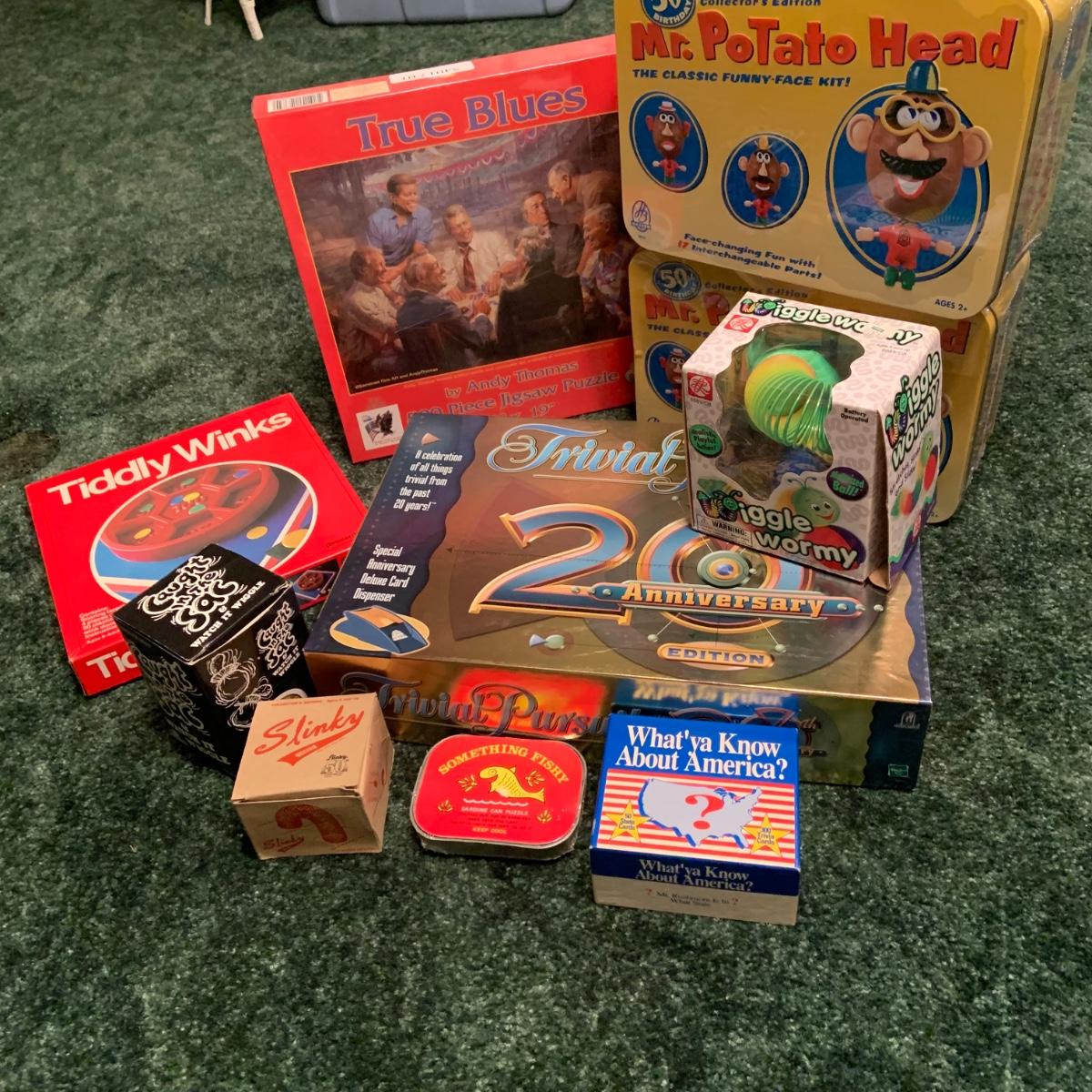 LOT::204 Lot of Games Featuring 2 Unopened Tins of Mr. Potato Head and True Blues Puzzle along with Other Games and Toys
