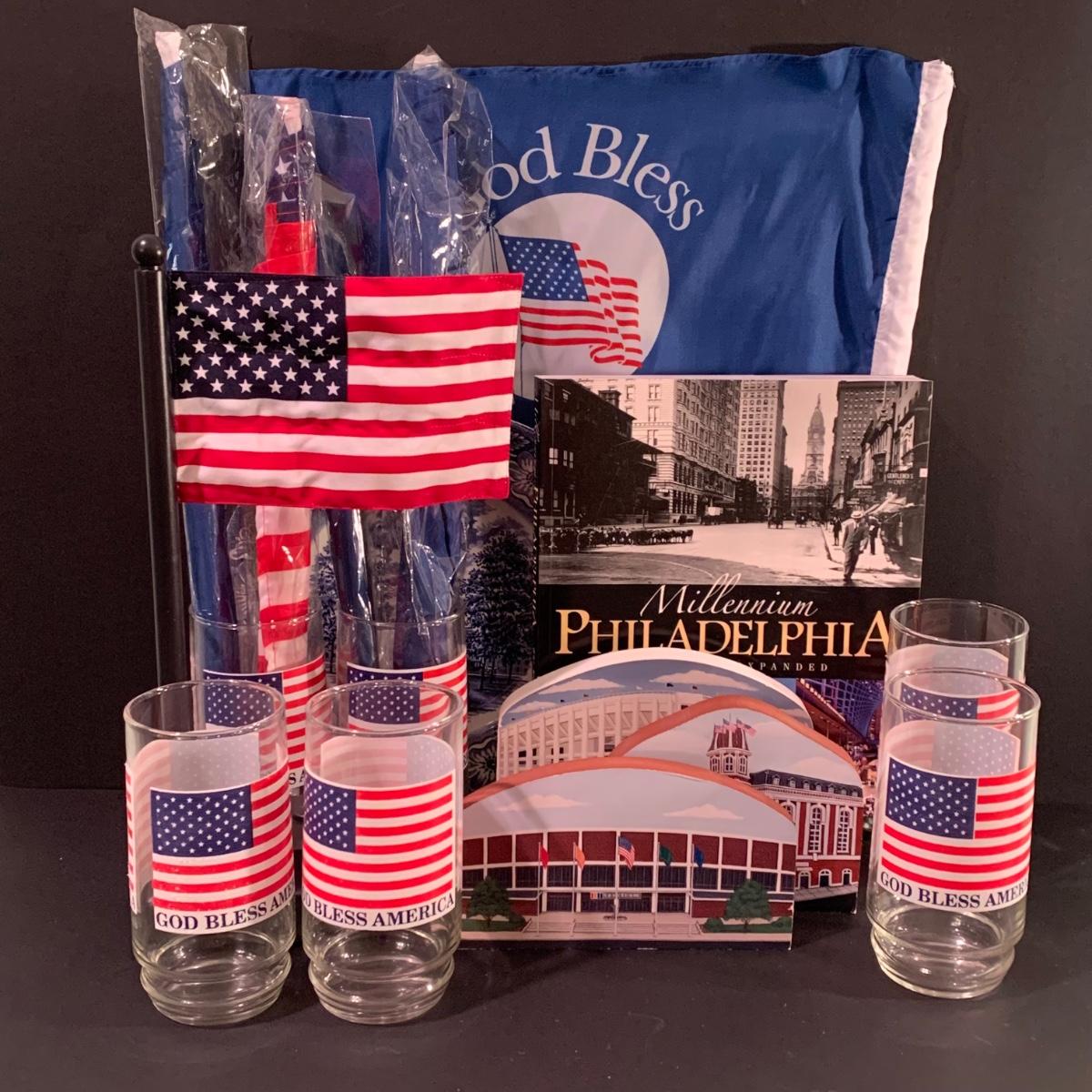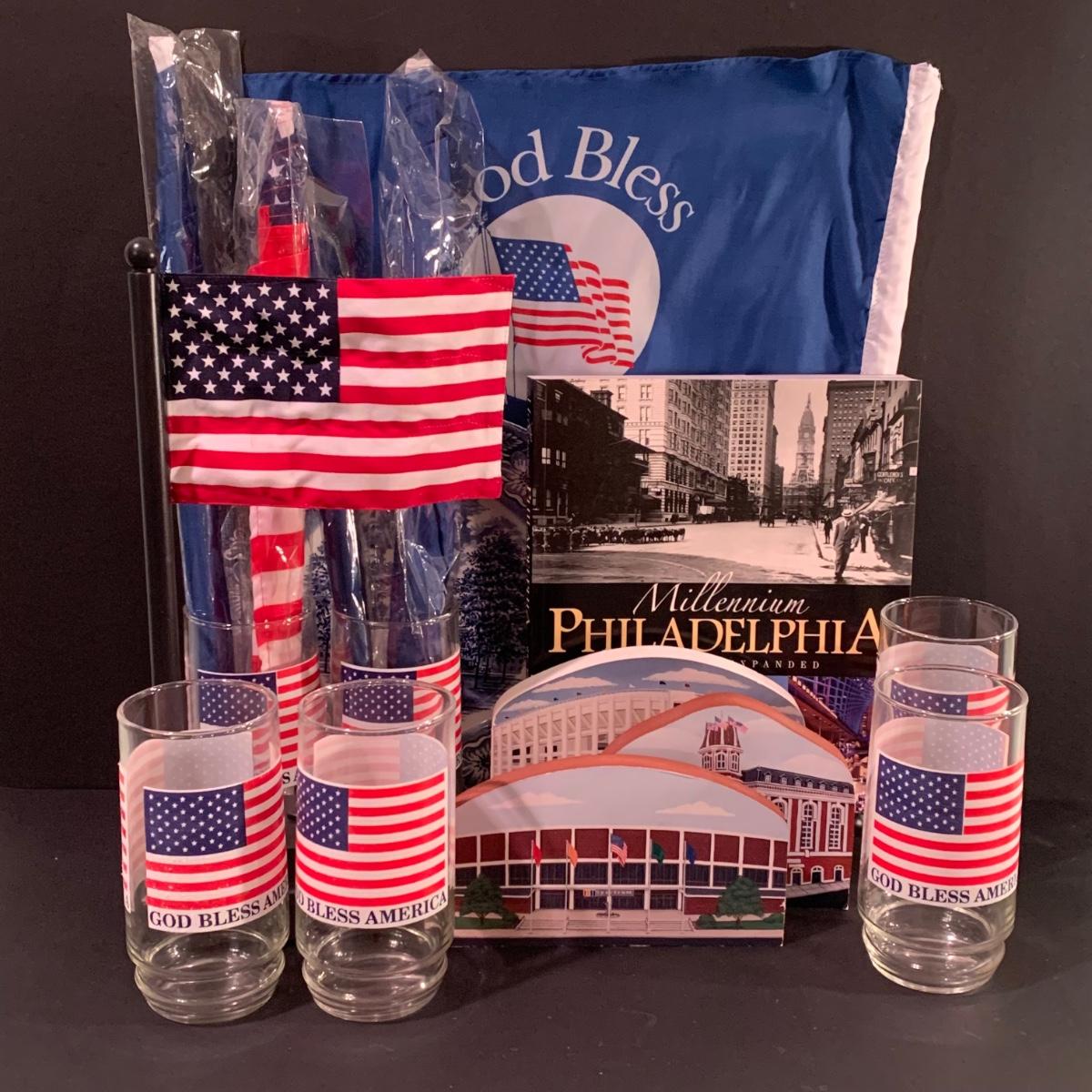 LOT 220FB: Vintage God Bless America Glasses Tumblers (6), Ron Edelheiser's Illusion Studio Philadelphia Stadium Replicas & More