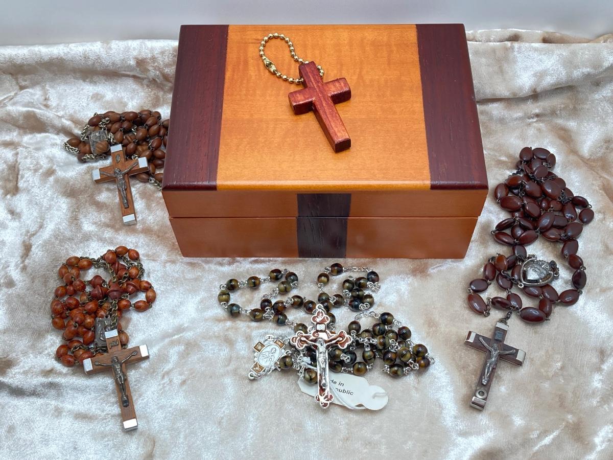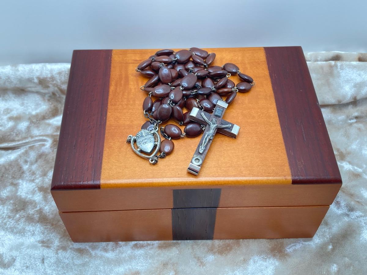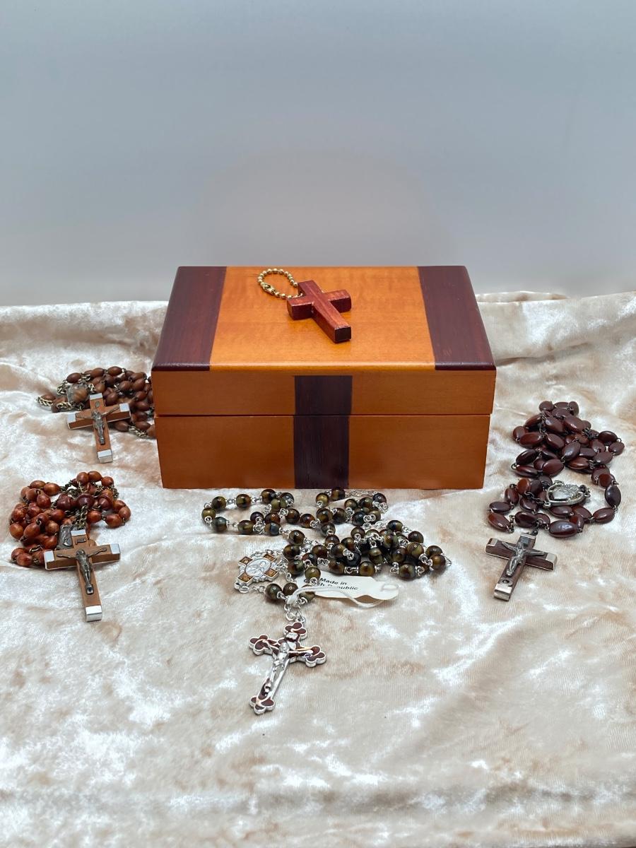 LOT 244J: Wooden Box with Collection of Rosary Beads and More