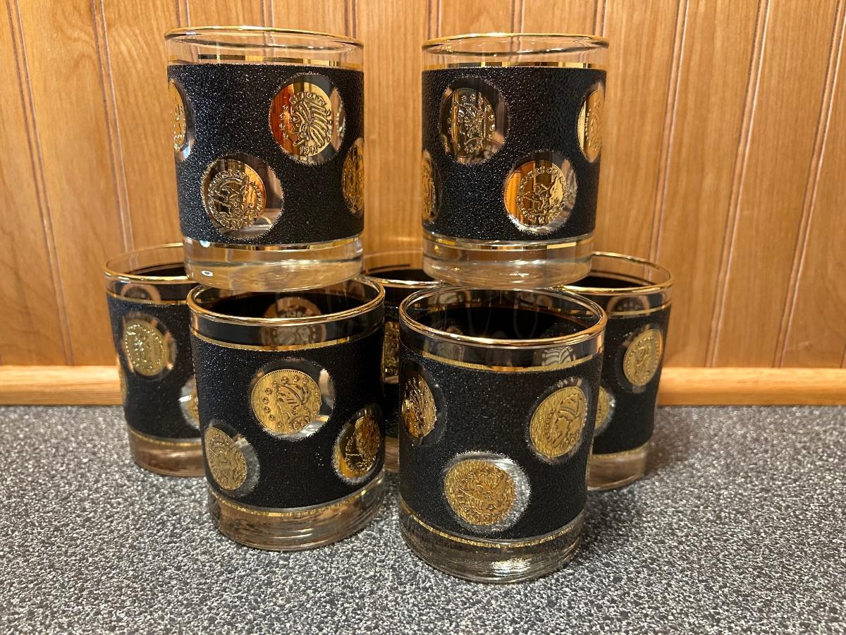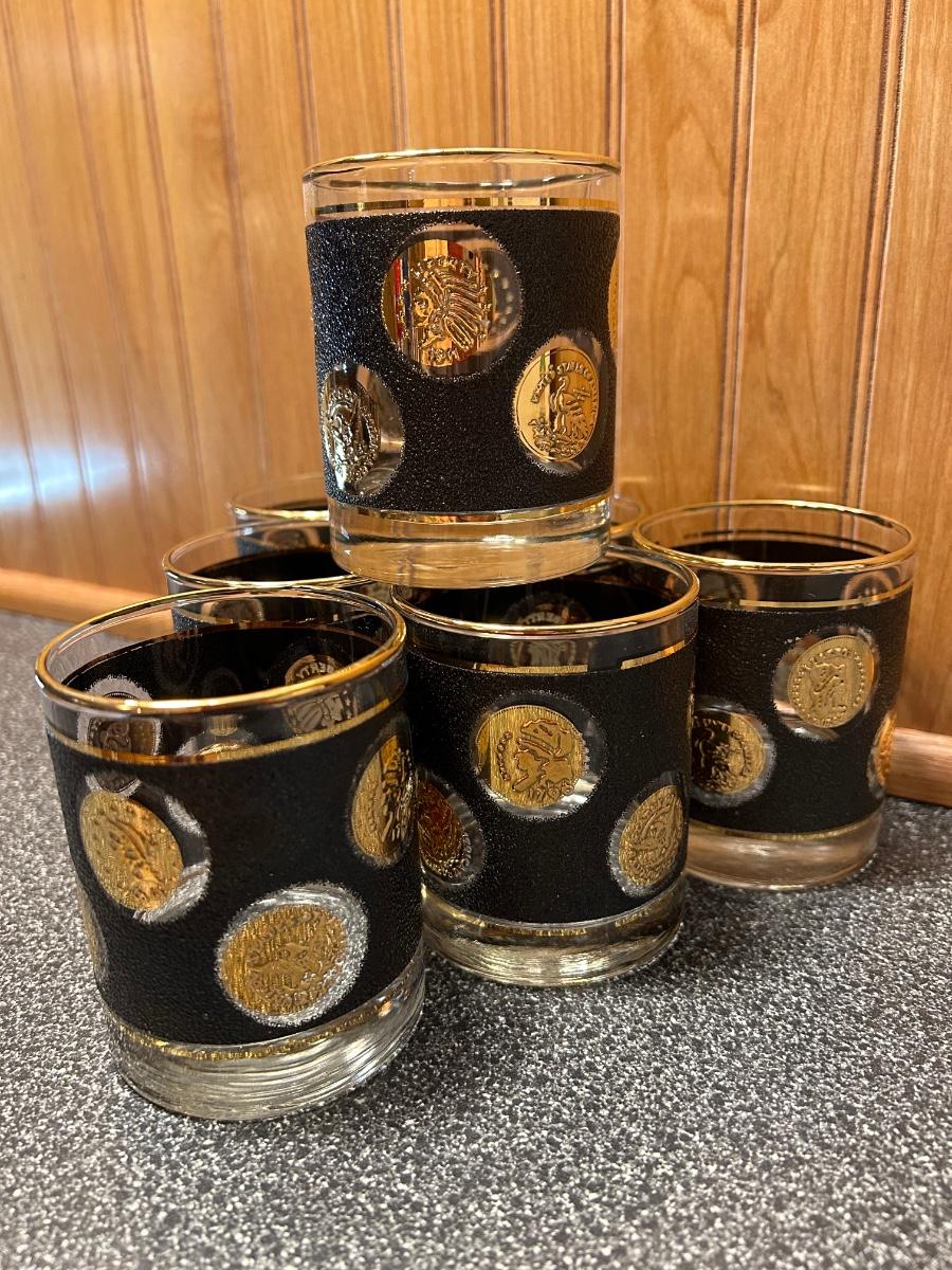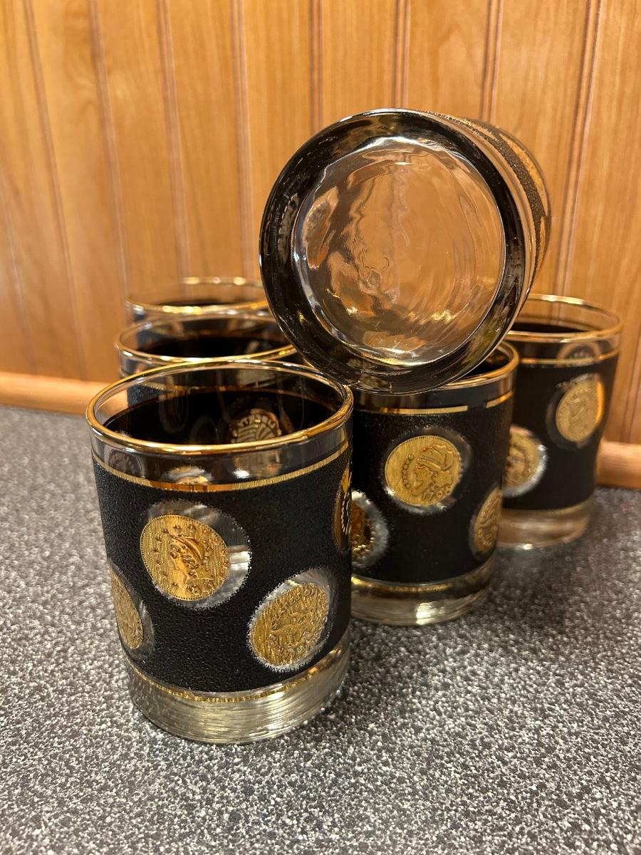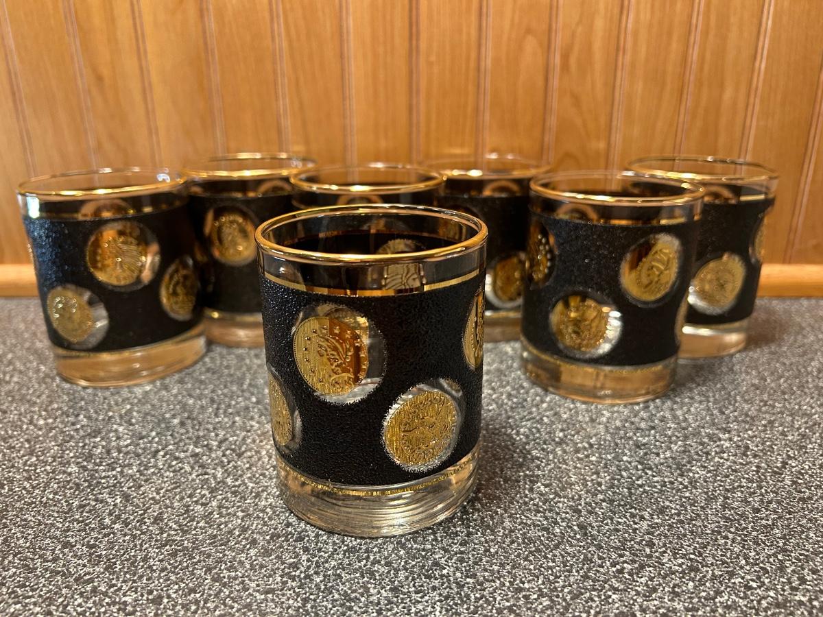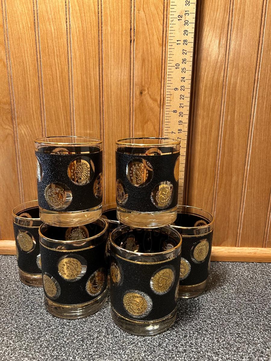 LOT 298FB: Vintage Black & Gold Coin Barware Glasses