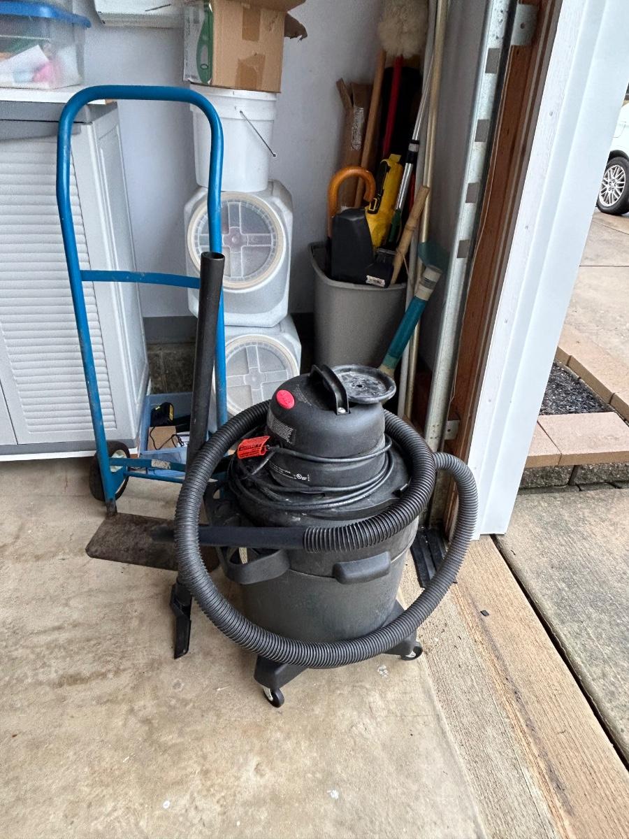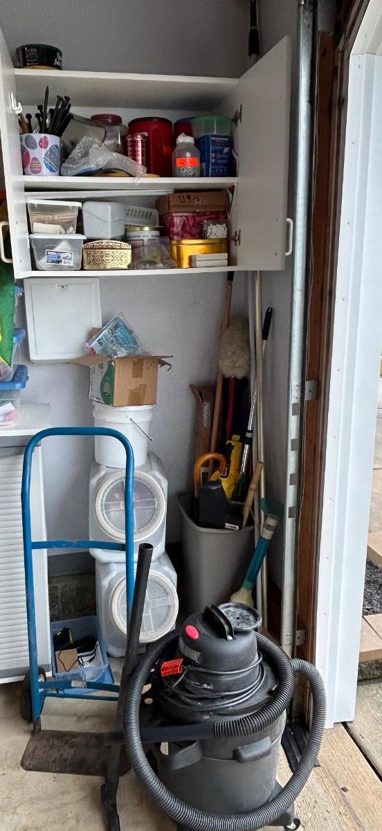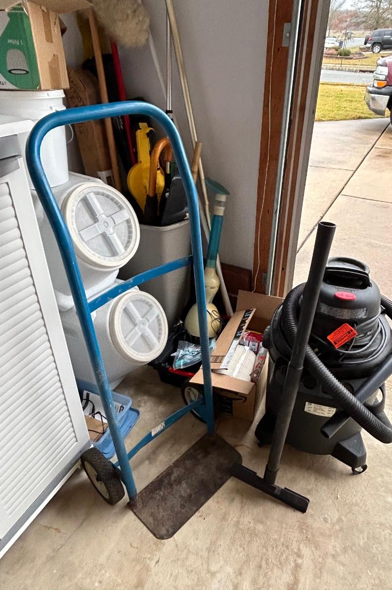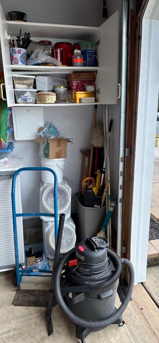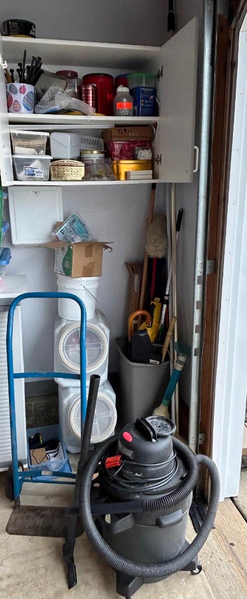 LOT G304: Garage Corner Lot- Hand Truck, Wet Vac And Replacement Filters, Contents Of Cabinet And Bucket Filled With Yard And House Supplies