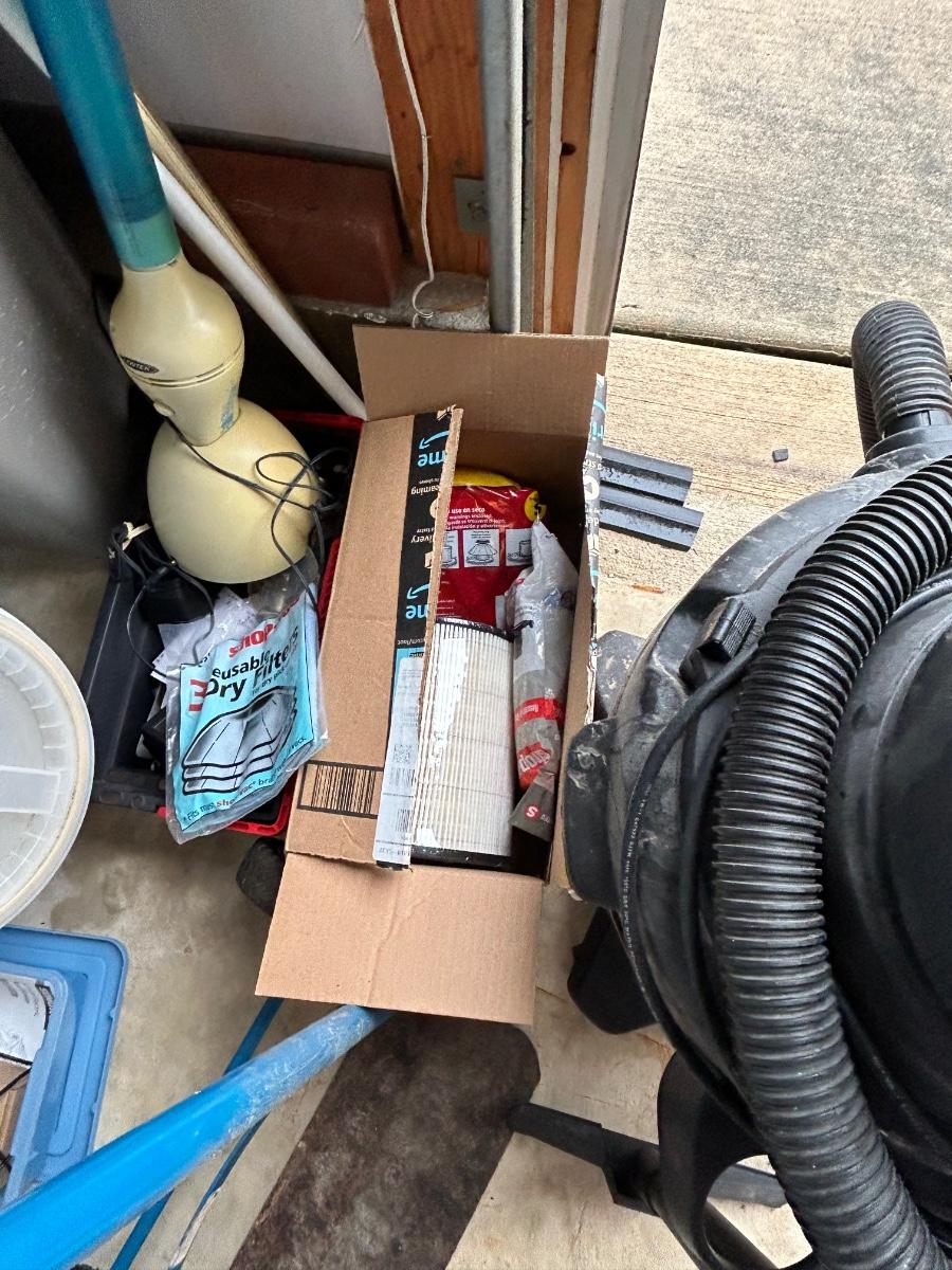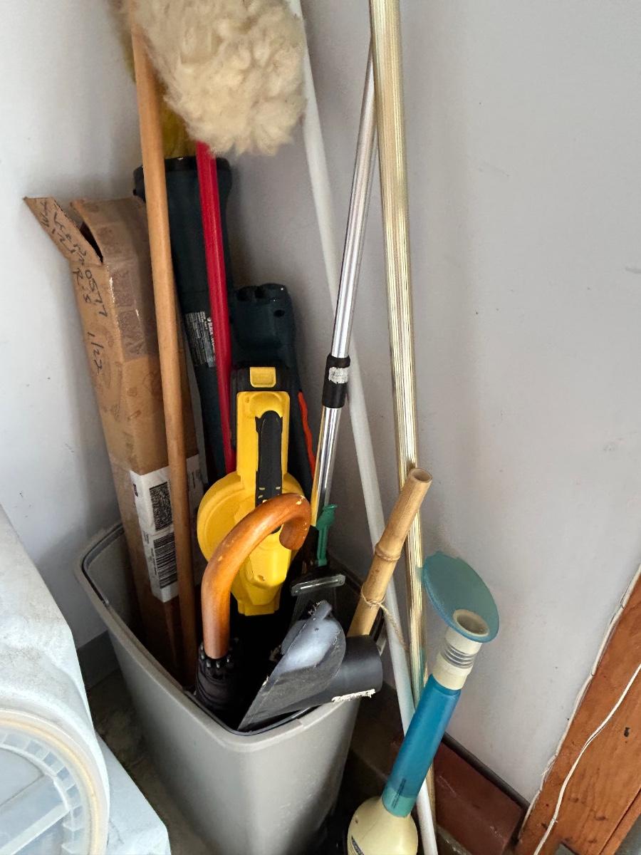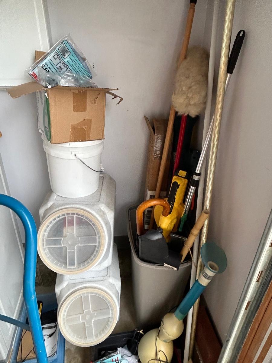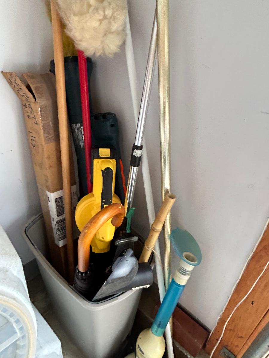 LOT G304: Garage Corner Lot- Hand Truck, Wet Vac And Replacement Filters, Contents Of Cabinet And Bucket Filled With Yard And House Supplies