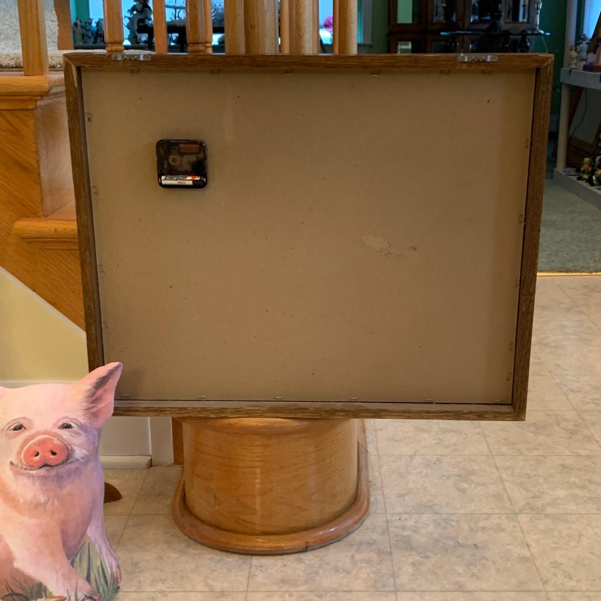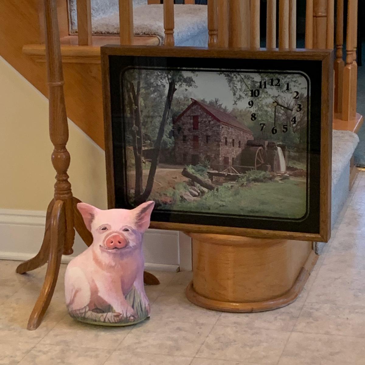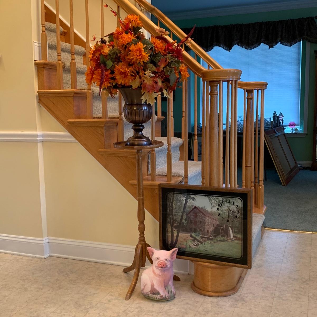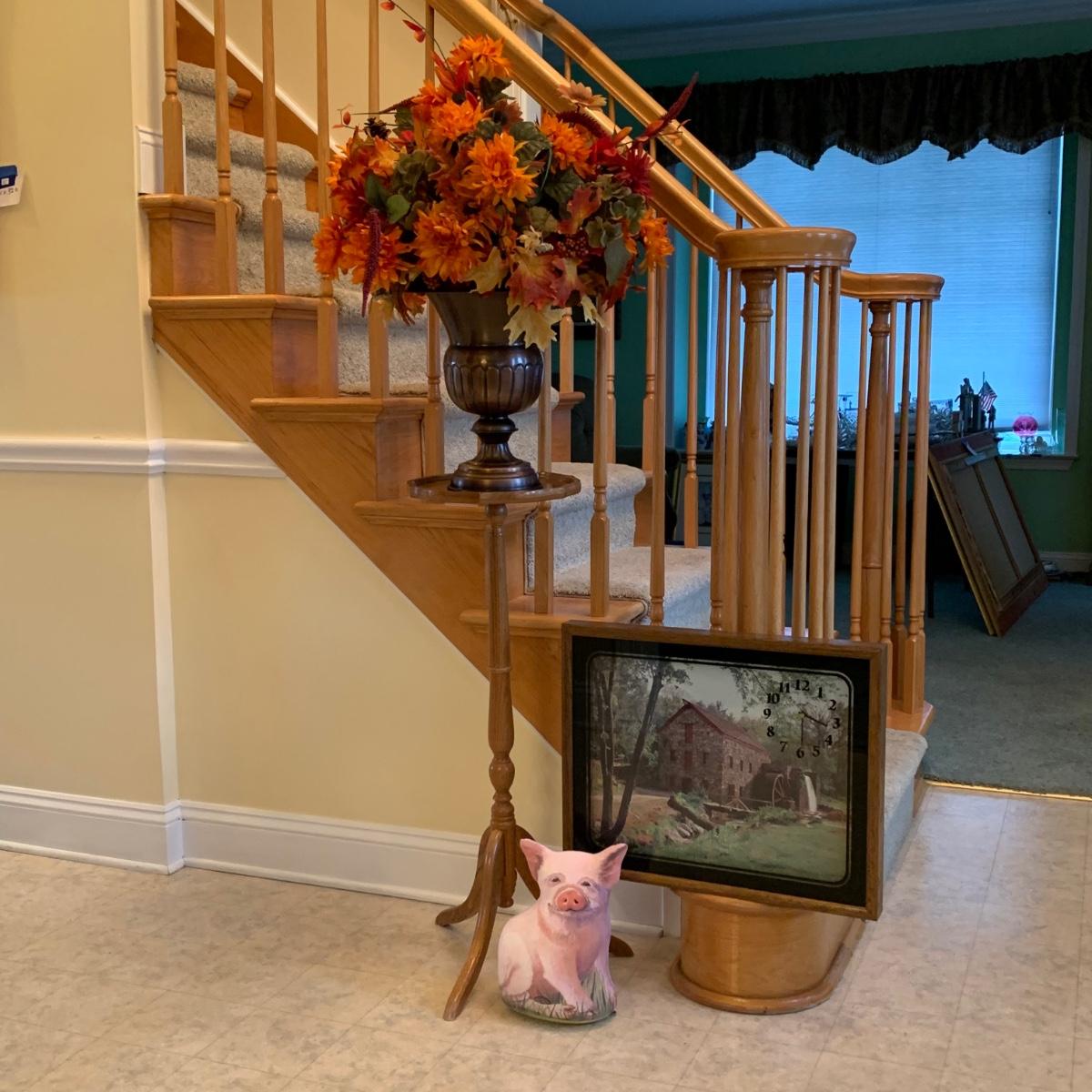 LOT 312L: Vintage Shadow Box Style Wall Clock, Cloth Pig Doorstop, Plant Stand, Fall Floral Arrangement