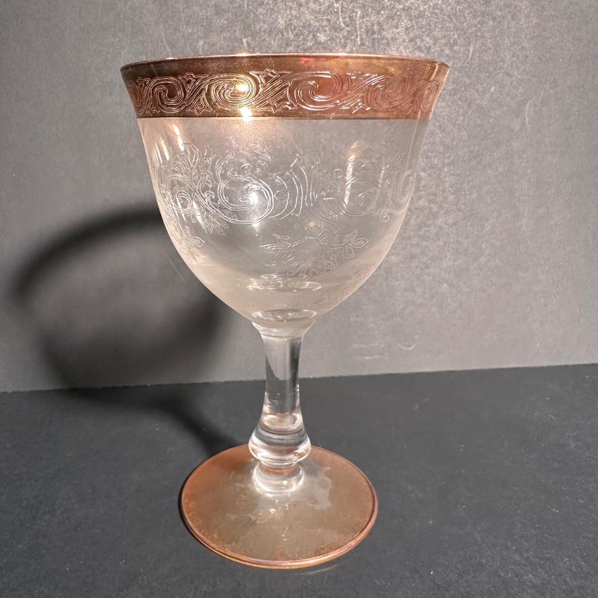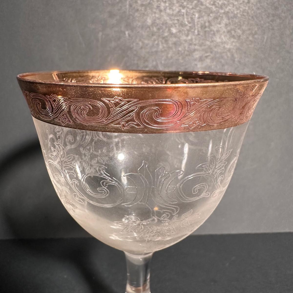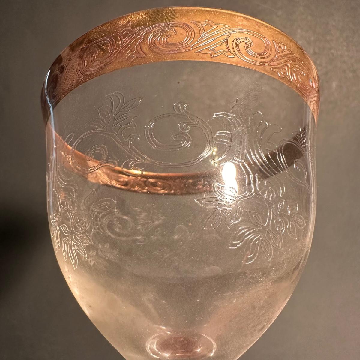 LOT 6L: Vintage Gold Trim Etched Crystal Wine Goblets/Glasses