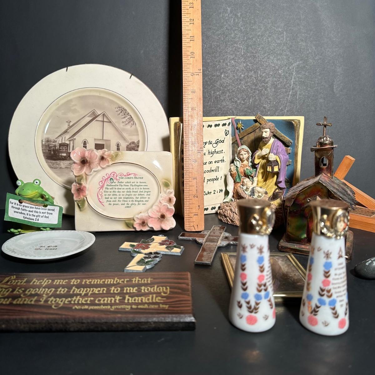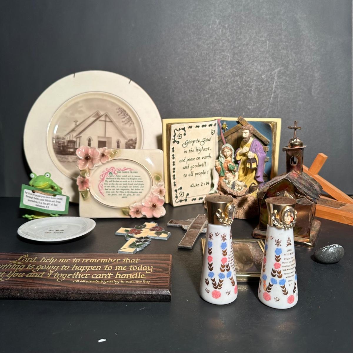 LOT 23L: Religious Collection- Decor, Shakers, Music Box & More