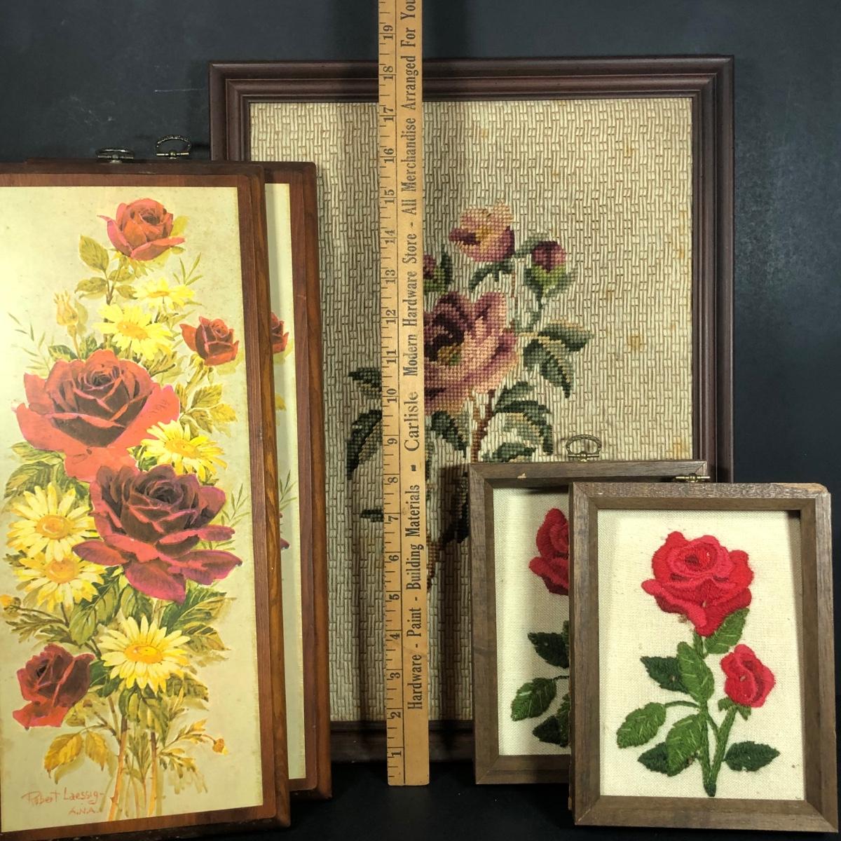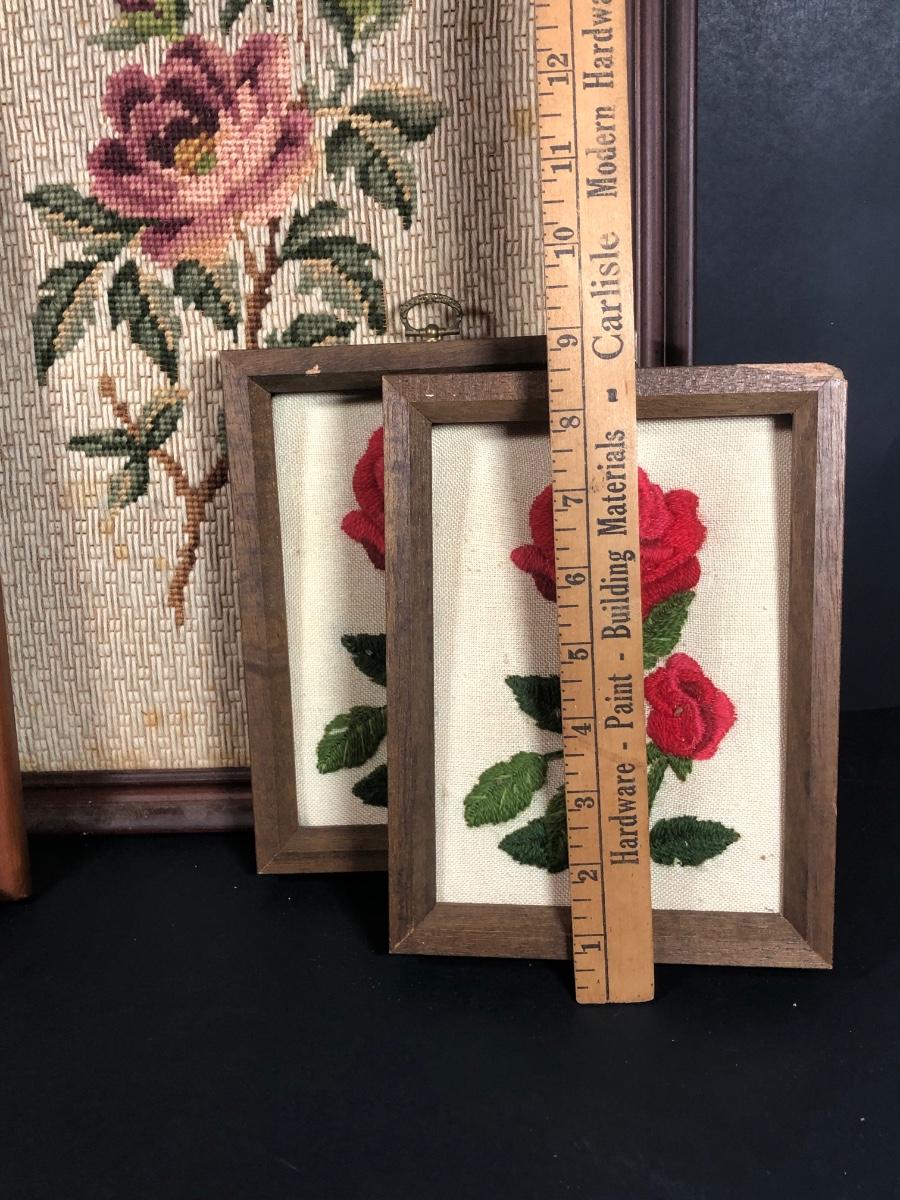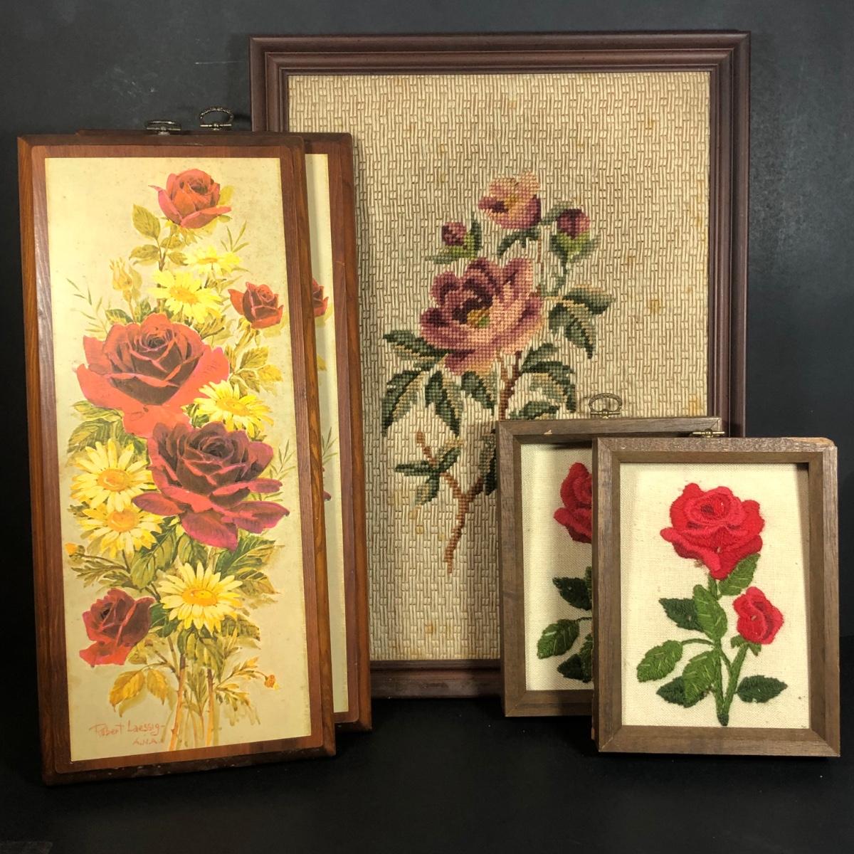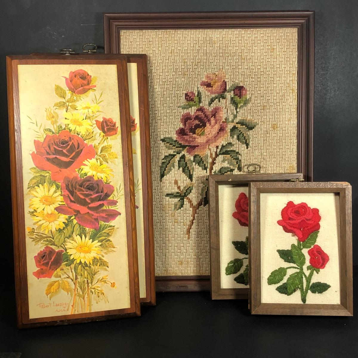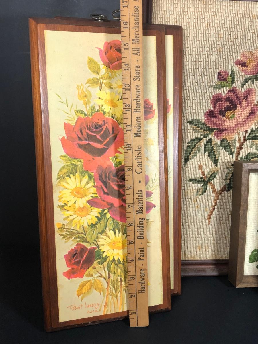 LOT 48L: Vintage Floral Wall Decor - Embroidery, Needlepoint & Wood Panels signed Robert Laessig