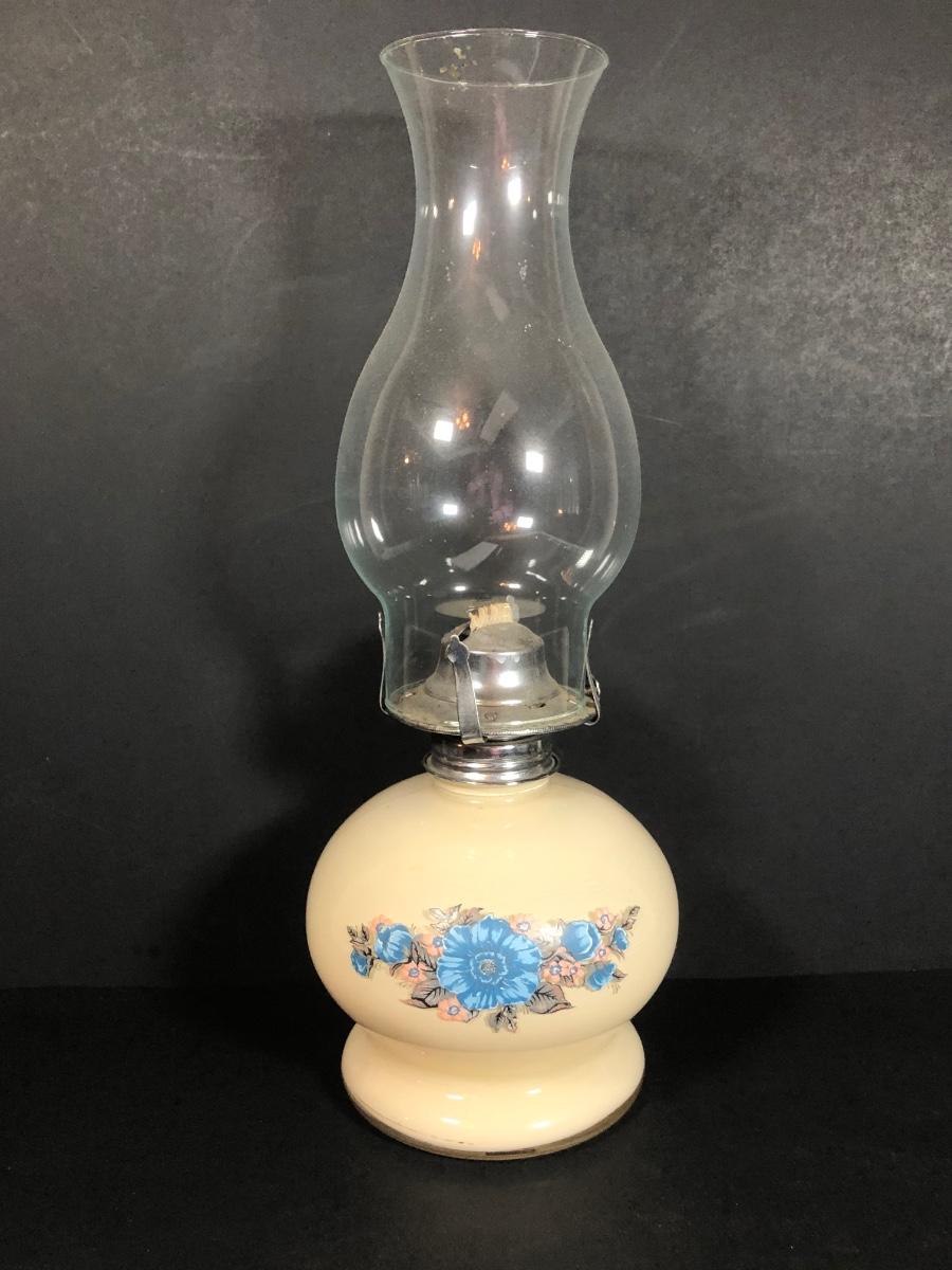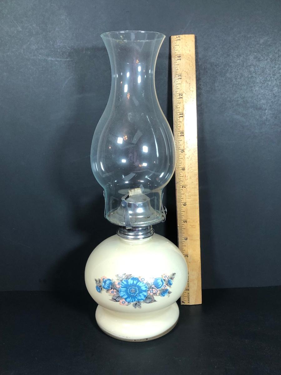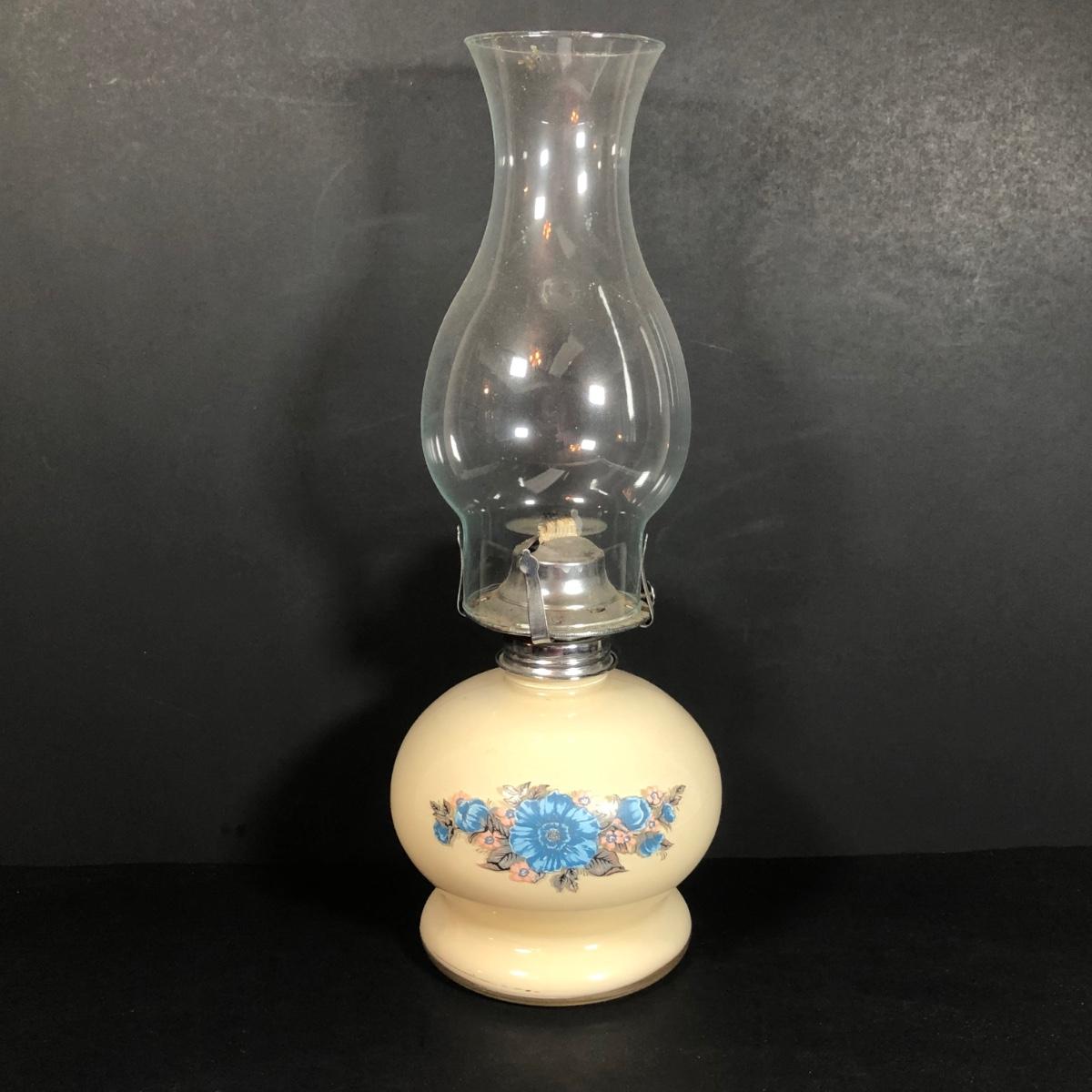 LOT 58L: Vintage Lamplight Farms White Floral Print Glass Oil Lamp