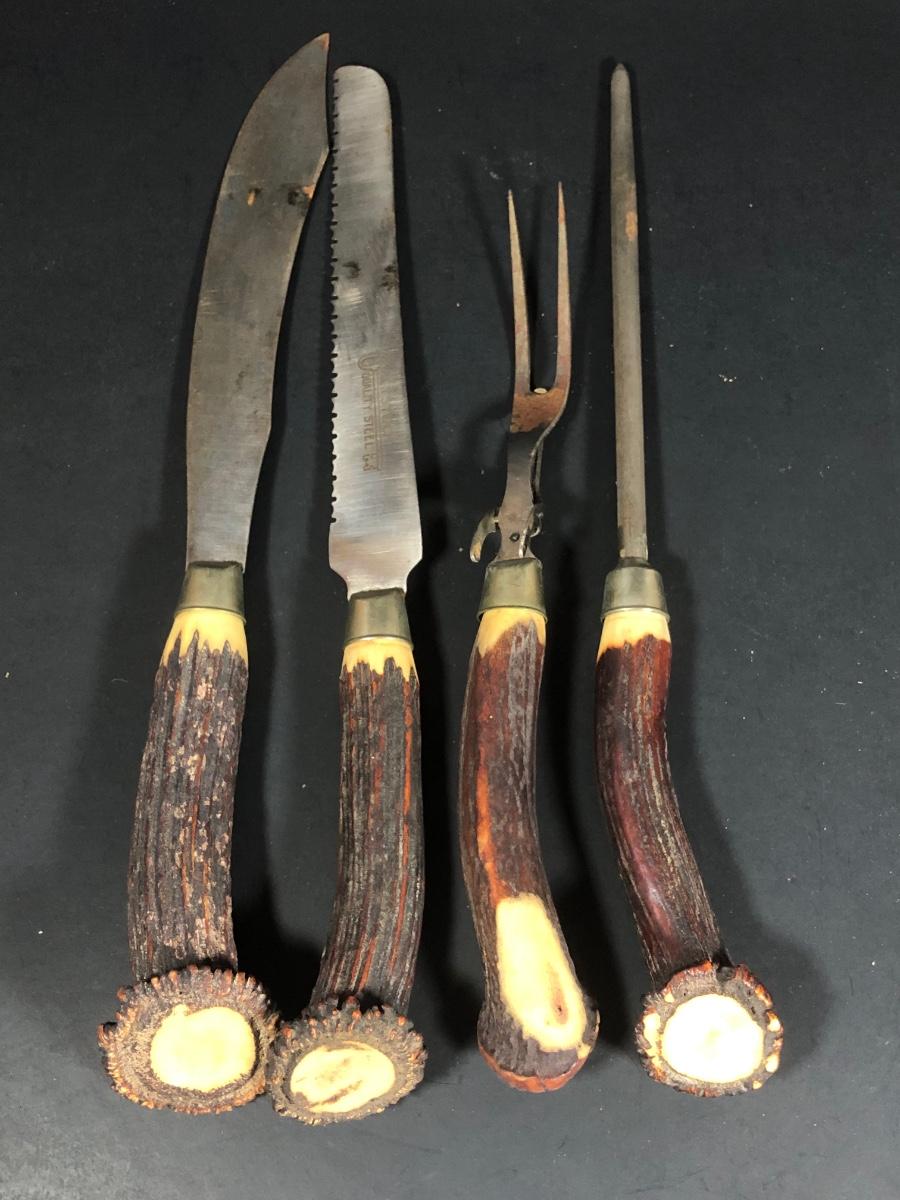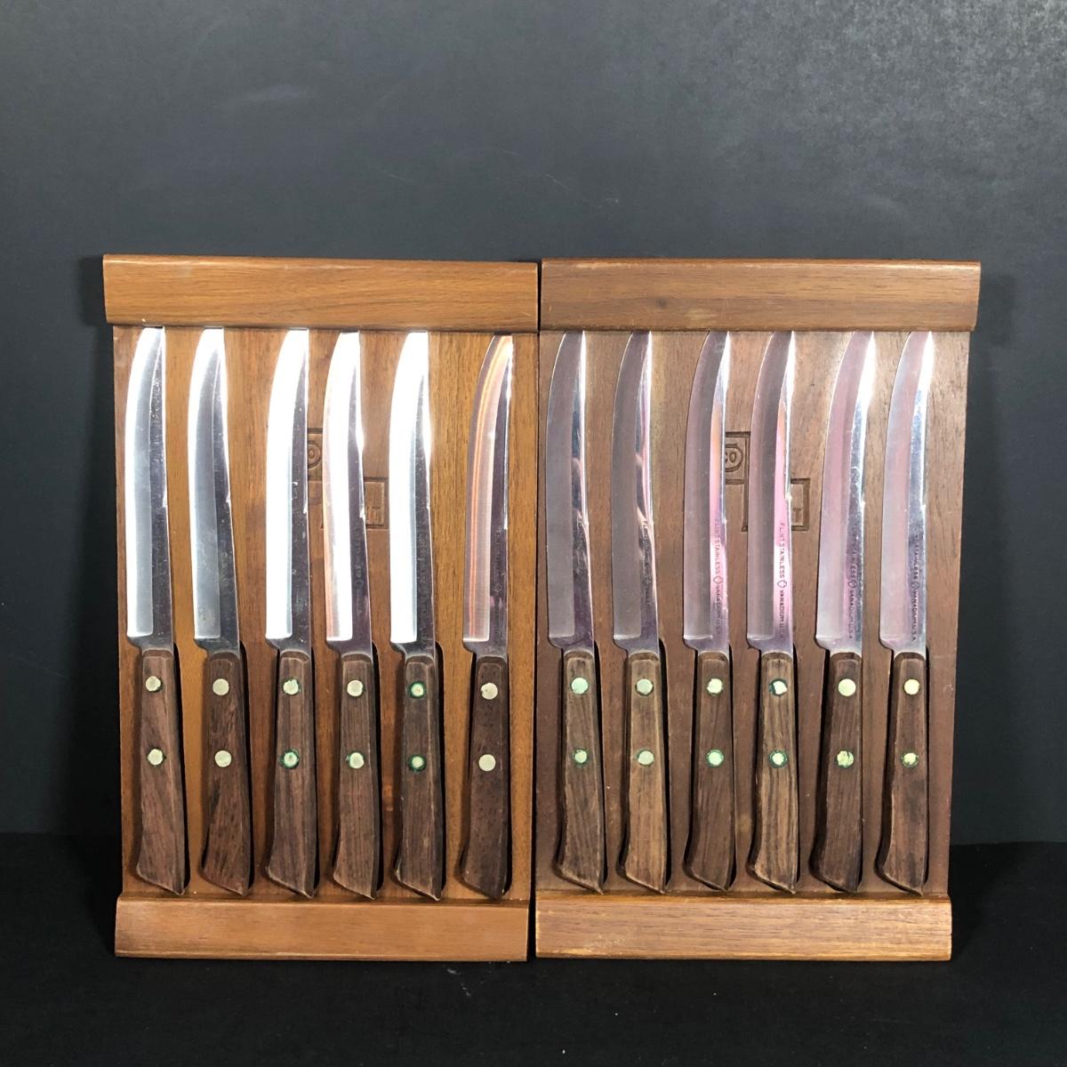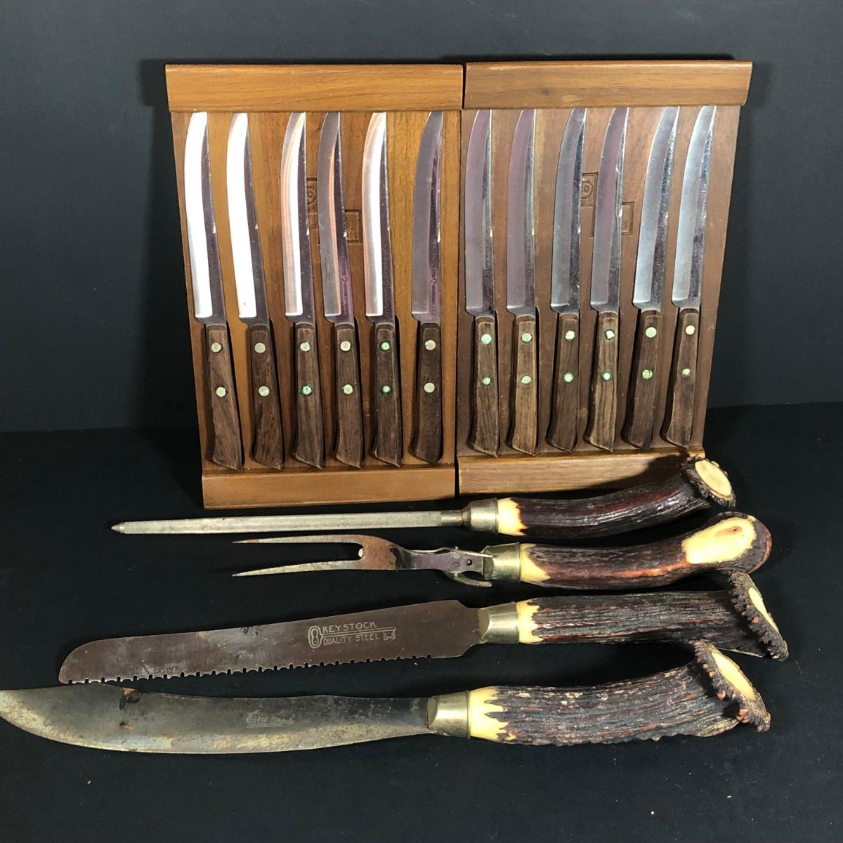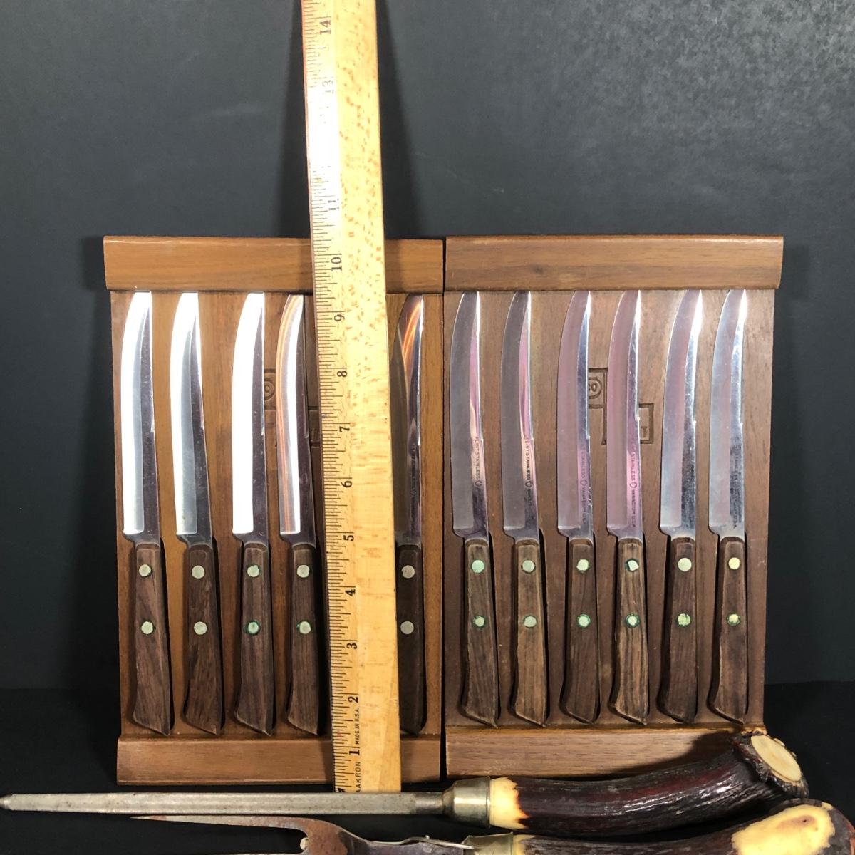 LOT 61L: Unique Handle Raw Wood Carving Set & Ecko Flint Stainless Steel Steak Knives