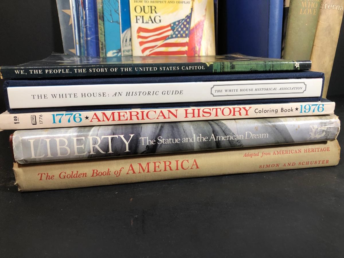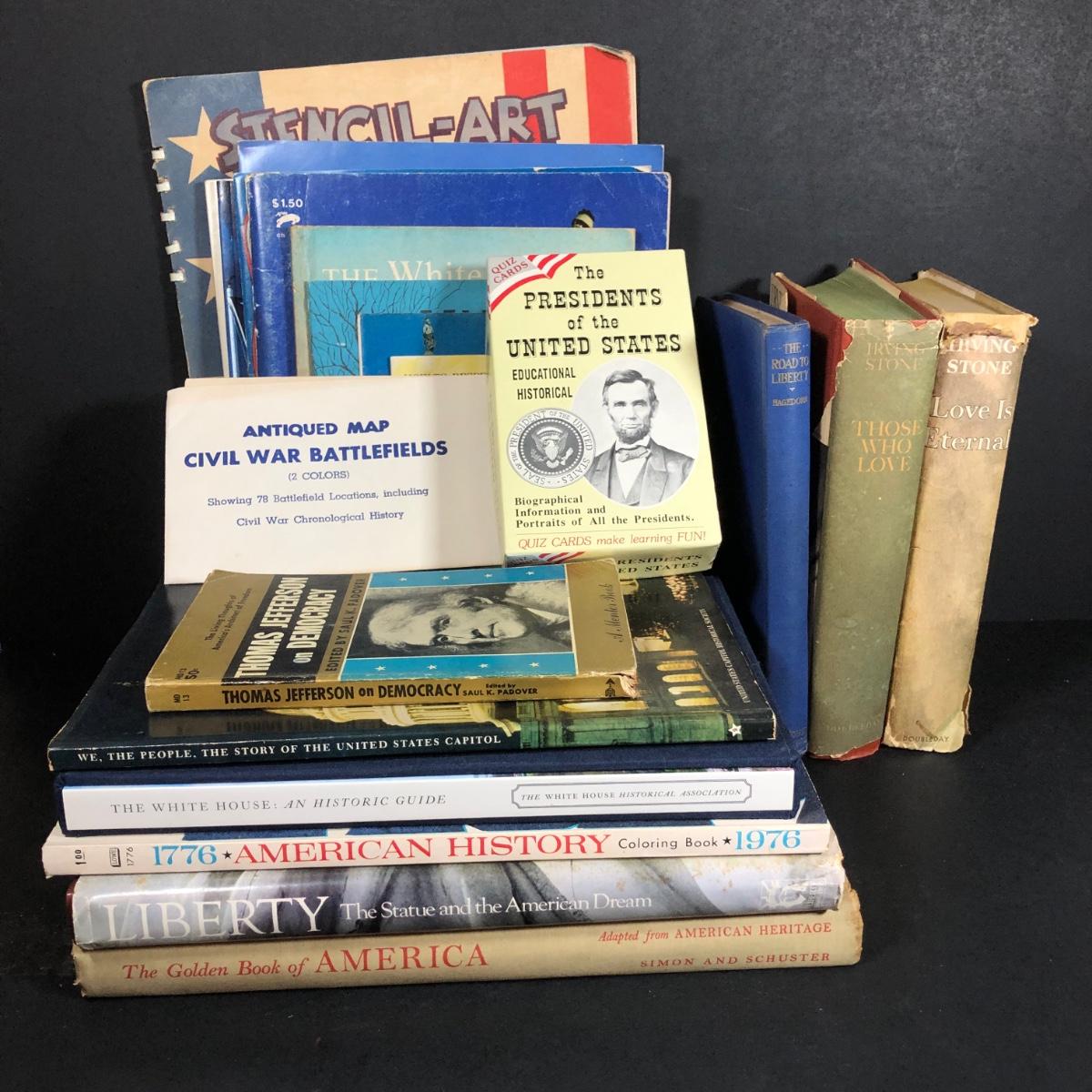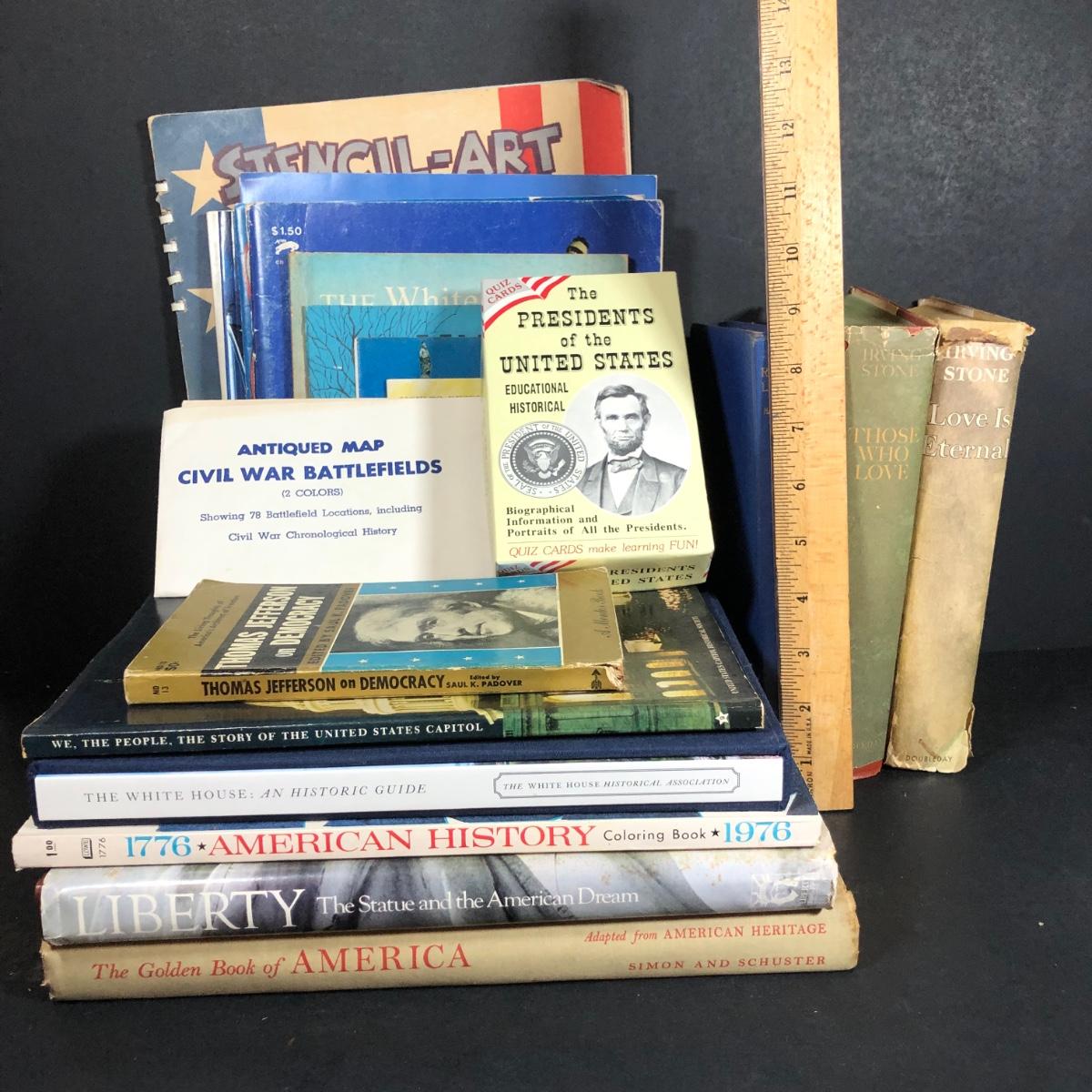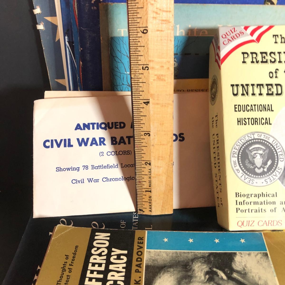 LOT 76L: Vintage Presidential / US History Books w/ Antiqued Civil War Map & Punishment in Colonial Times Poster