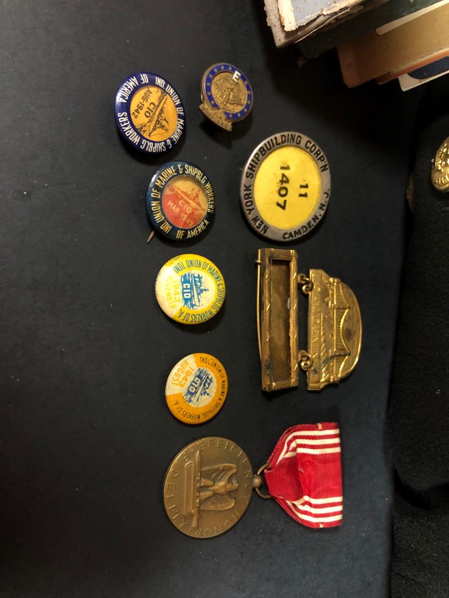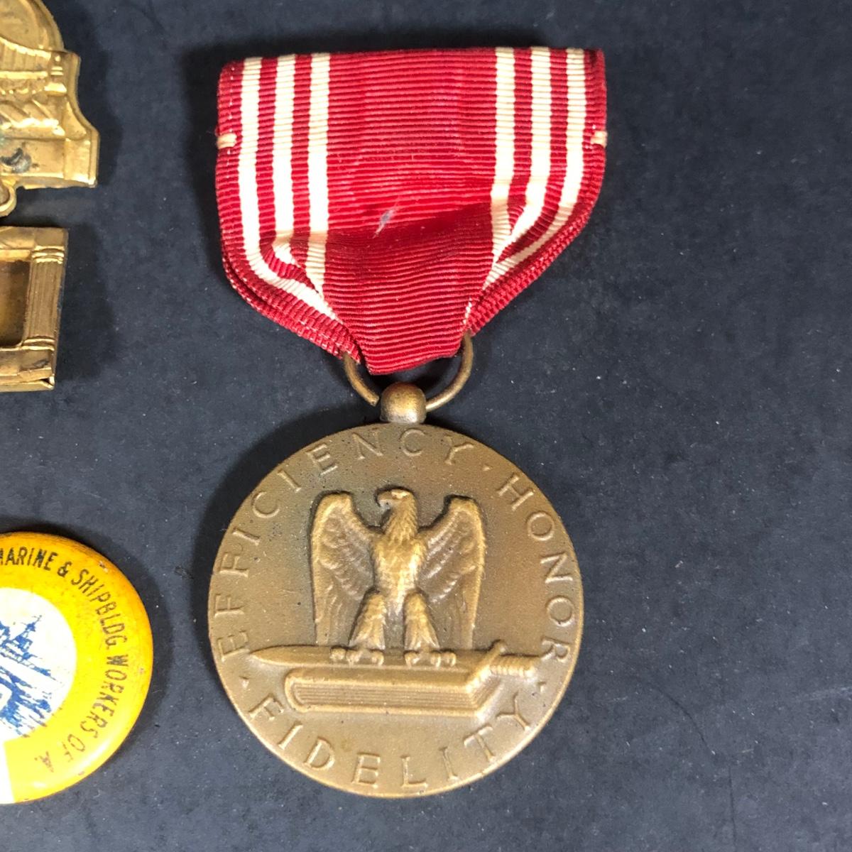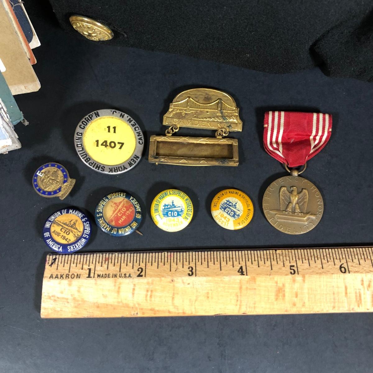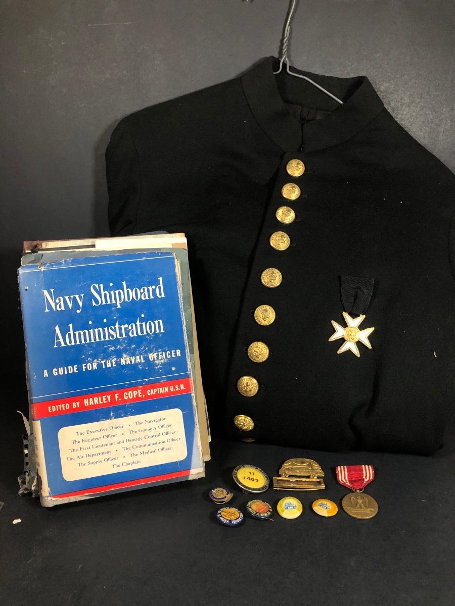LOT 79L: Vintage US Navy Jacket w/ Shipbuilding Books & Medals / Pins