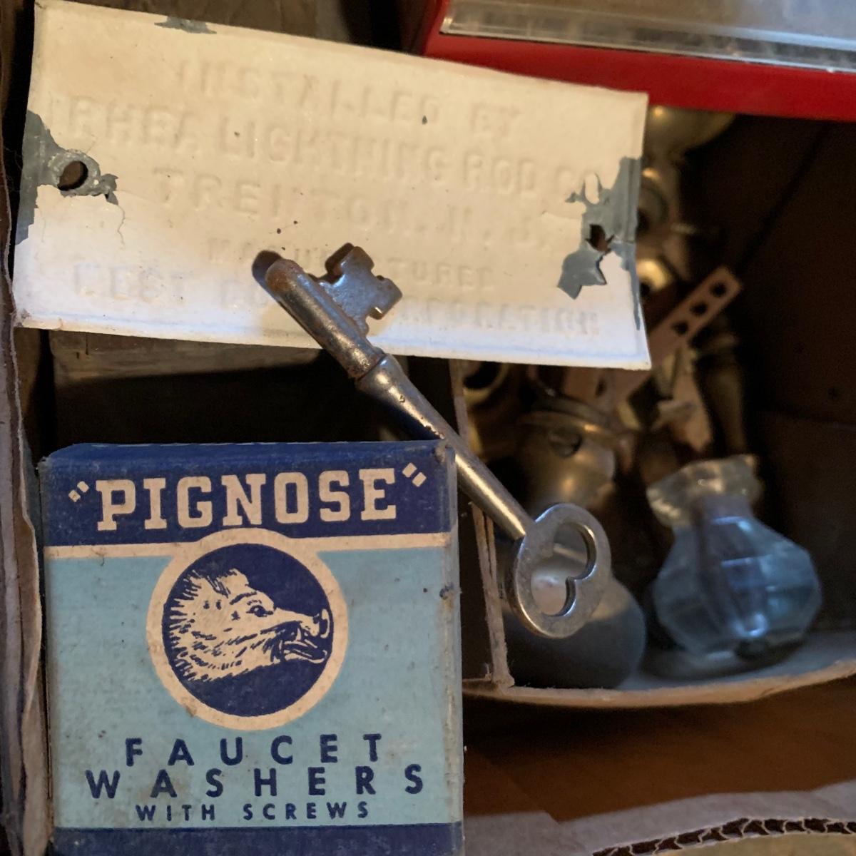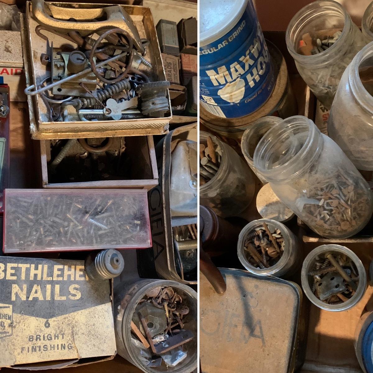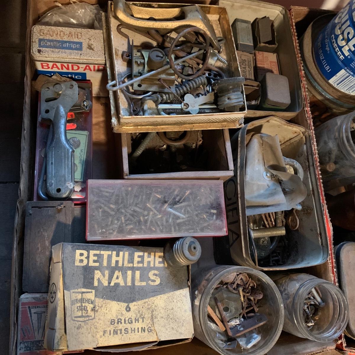 LOT 81 B: Little Tool Lot - Vintage Nails, Hinges, Drill Bits, Keys, Some Original Packaging, & More
