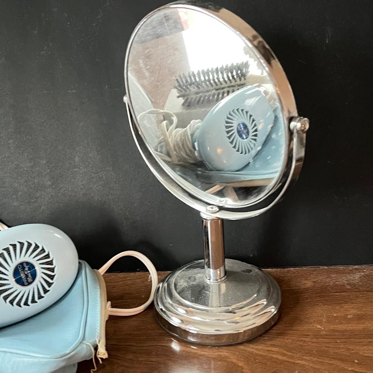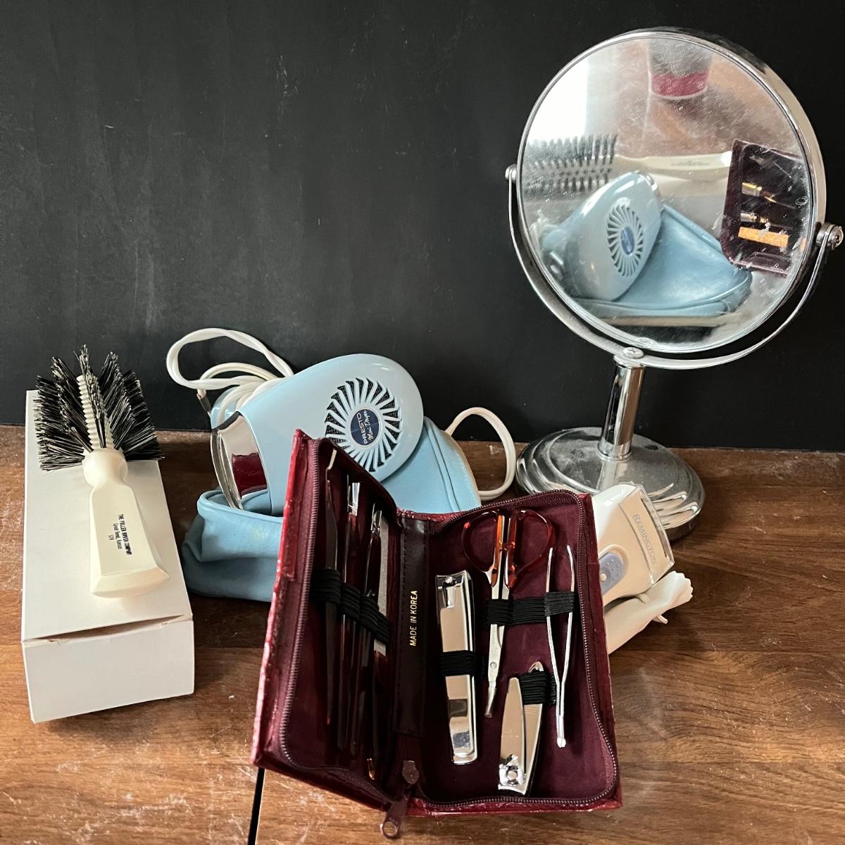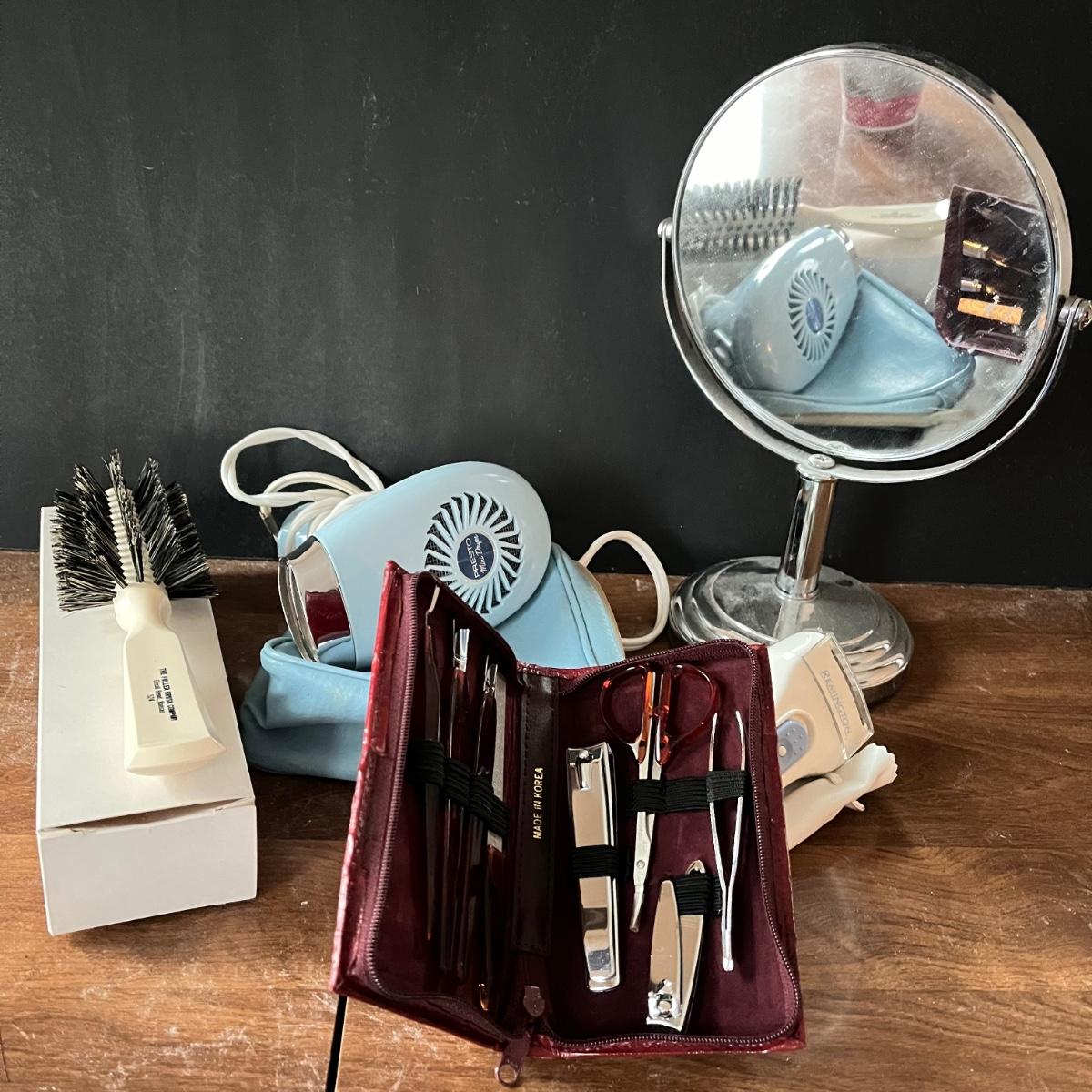 LOT 142Z: Women's Vanity Items, Makeup Mirror, Vintage Razor, Hairdryer and More