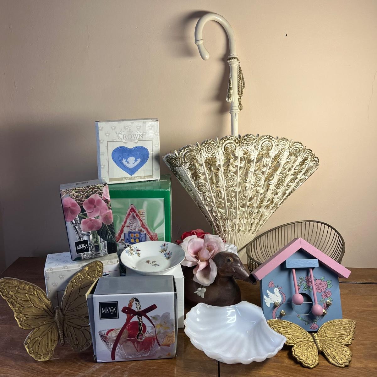 LOT 143Z: Home Decor - Vintage Umbrella Wall Pocket, Homco Butterflies, Silverplate Basket and More