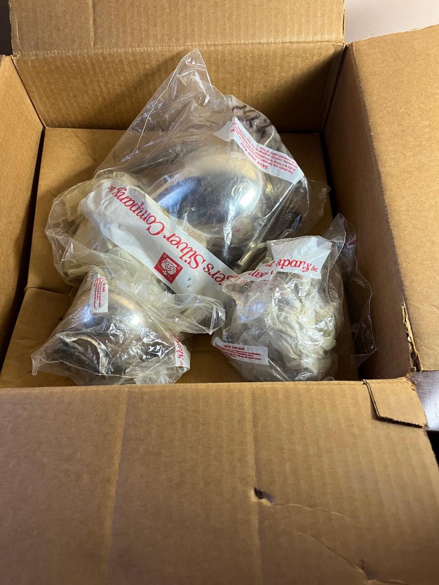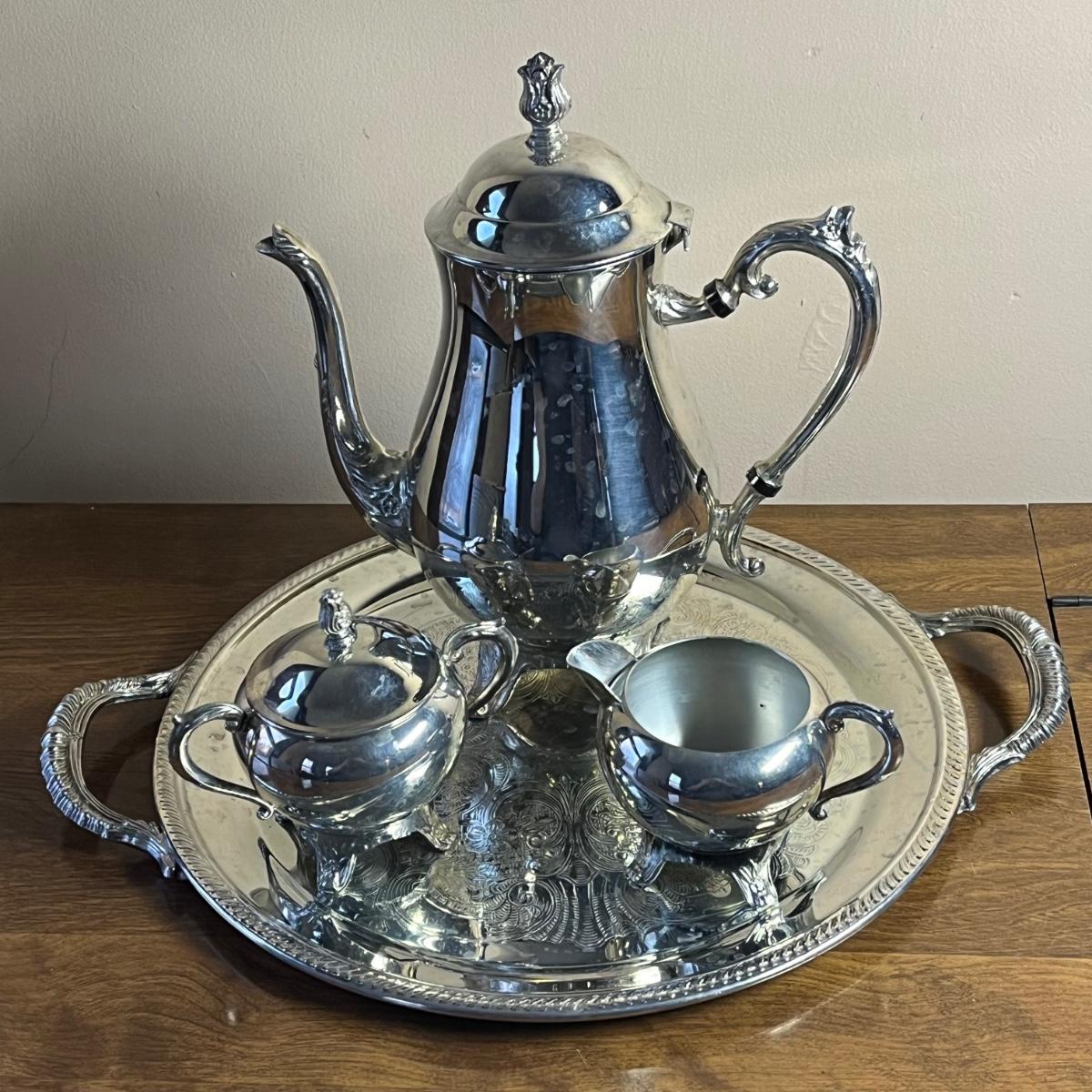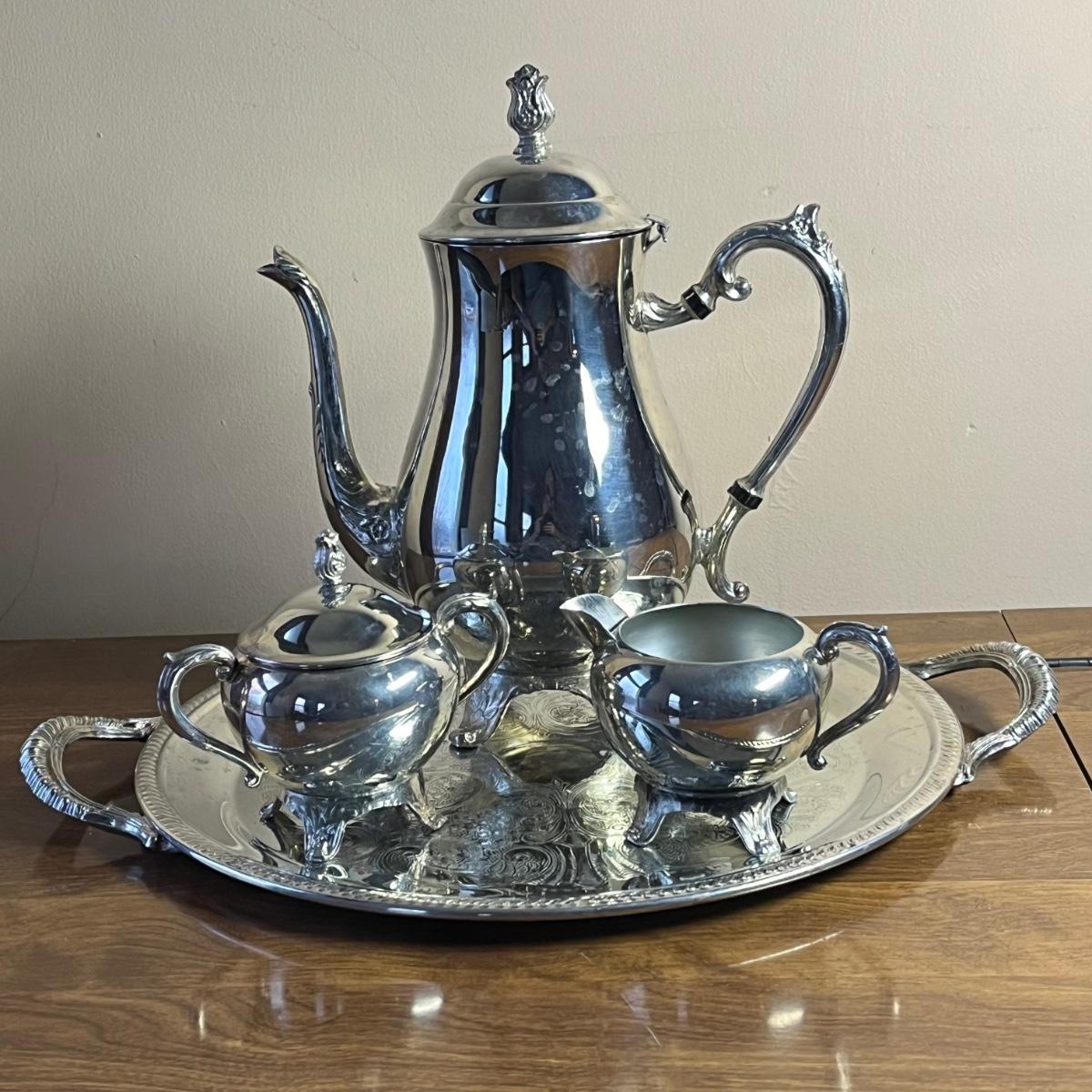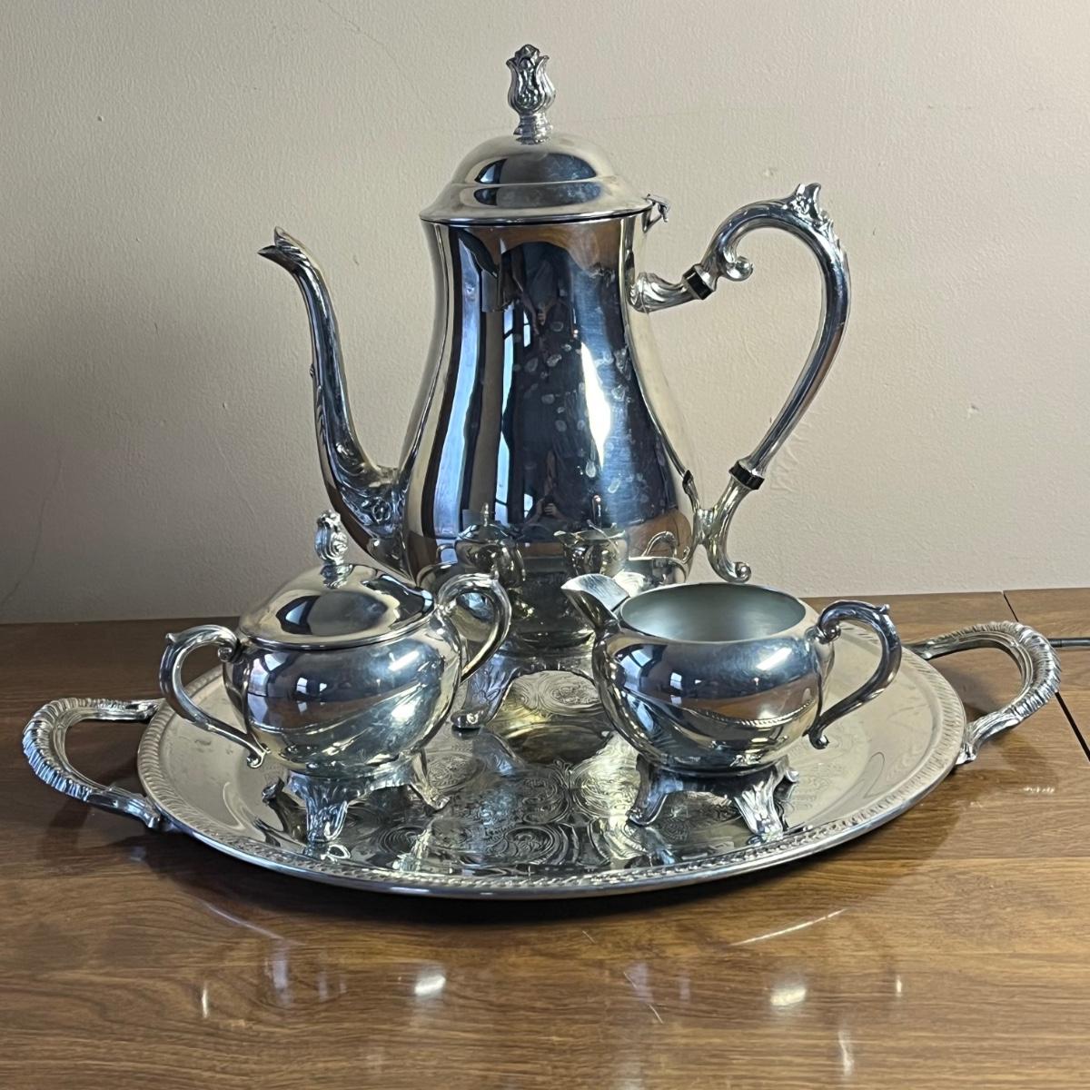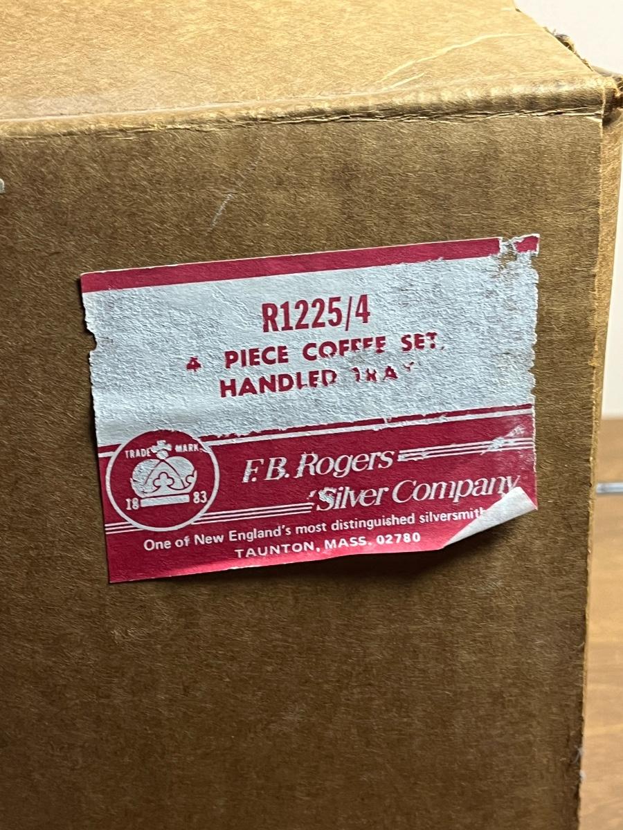 LOT 156Z: Rogers Silver Plate Coffee Set - Coffee Pot, Creamer, Sugar Bowl, Tray in Original Packaging