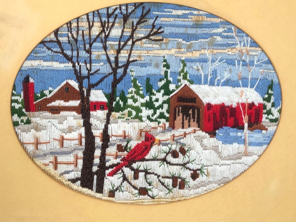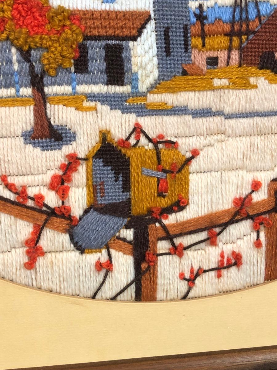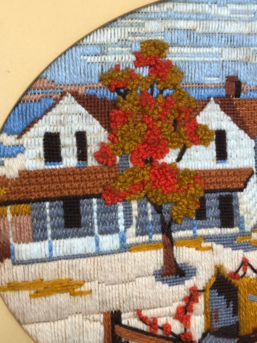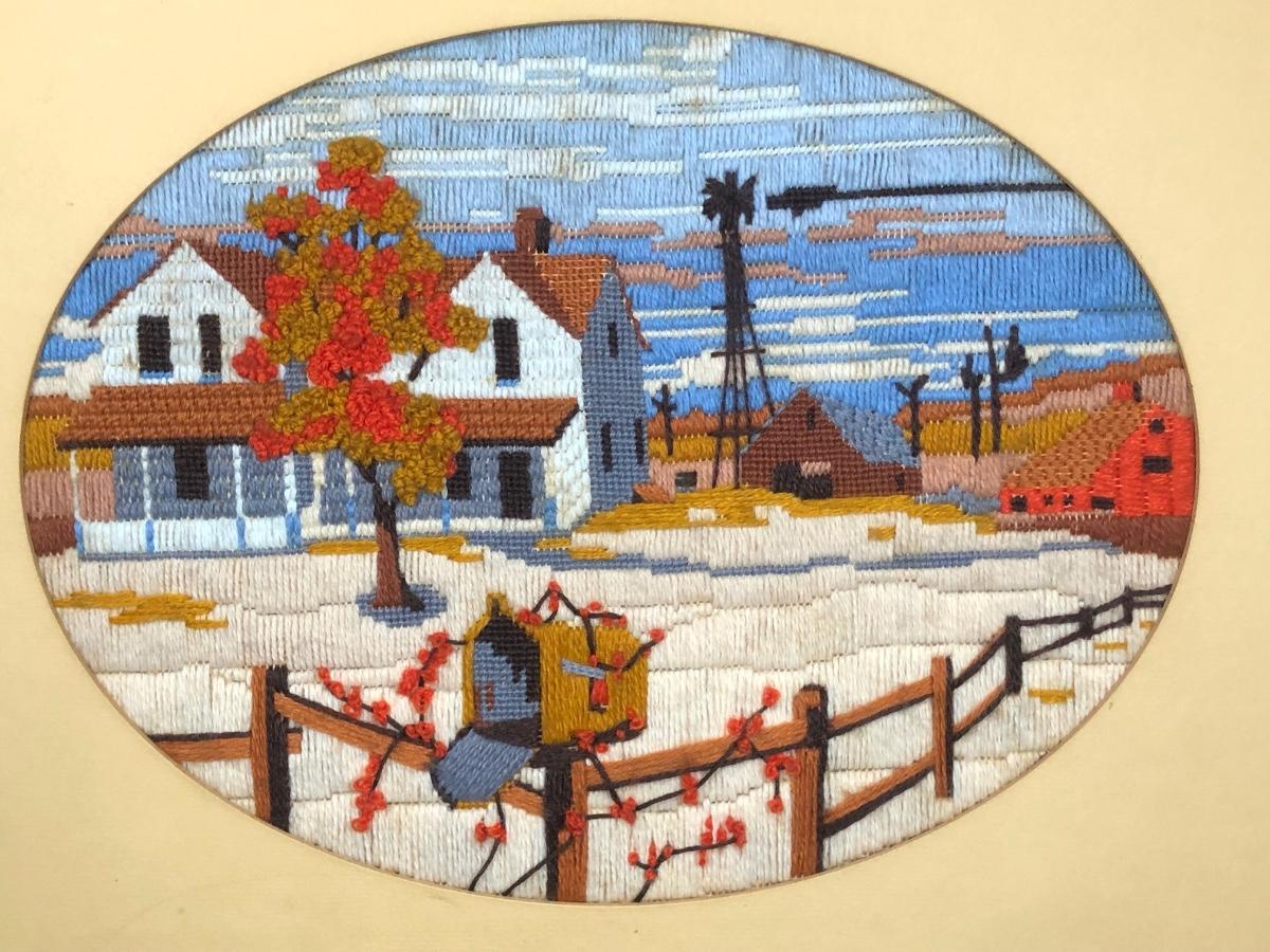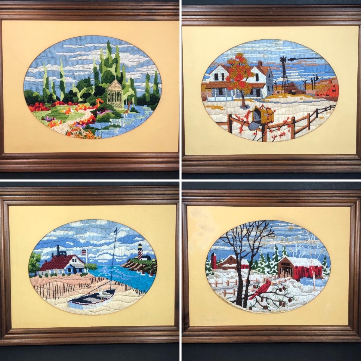 LOT 164L: Four 1980s Seasonal Landscape Embroidered / Needlepoint Art by Janet Davis