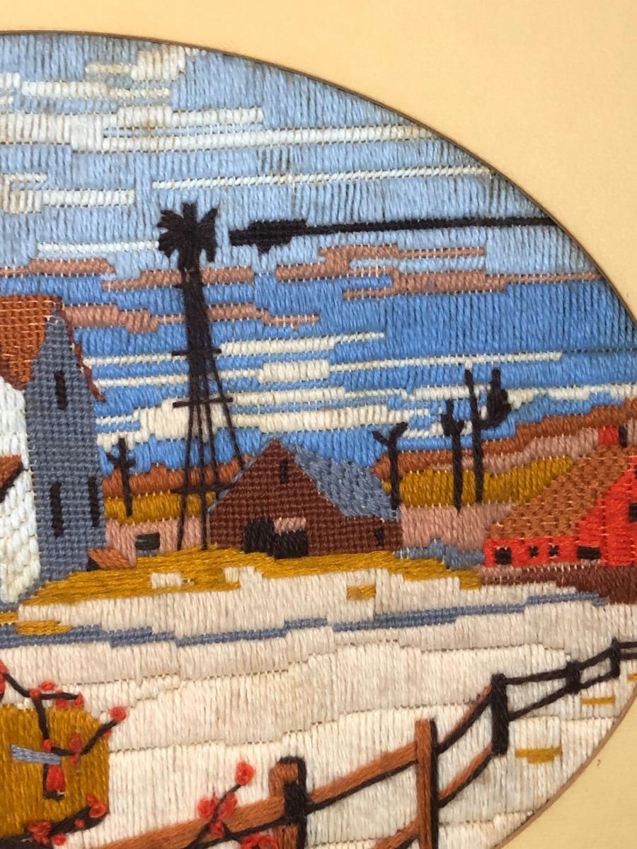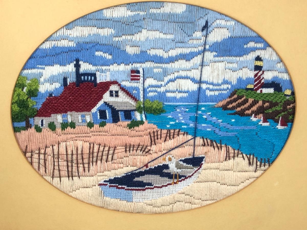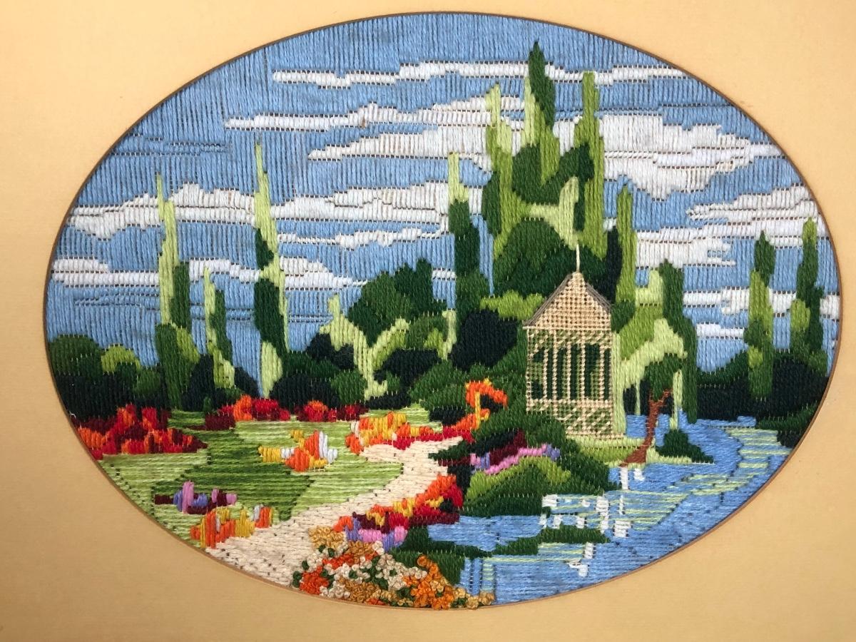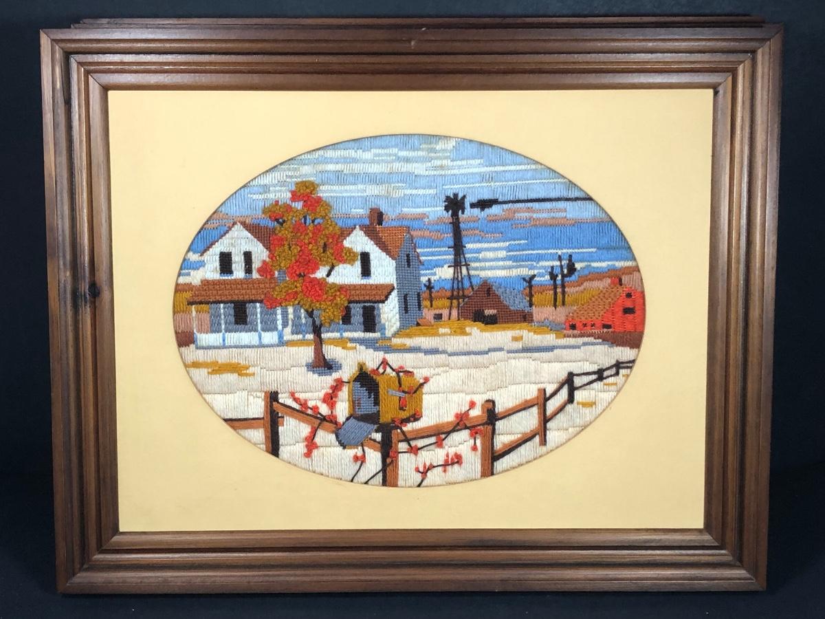 LOT 164L: Four 1980s Seasonal Landscape Embroidered / Needlepoint Art by Janet Davis