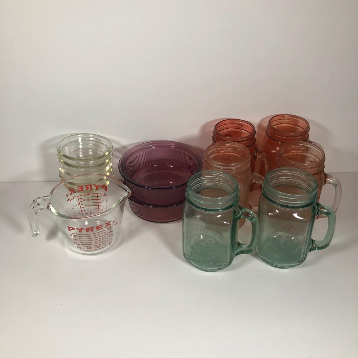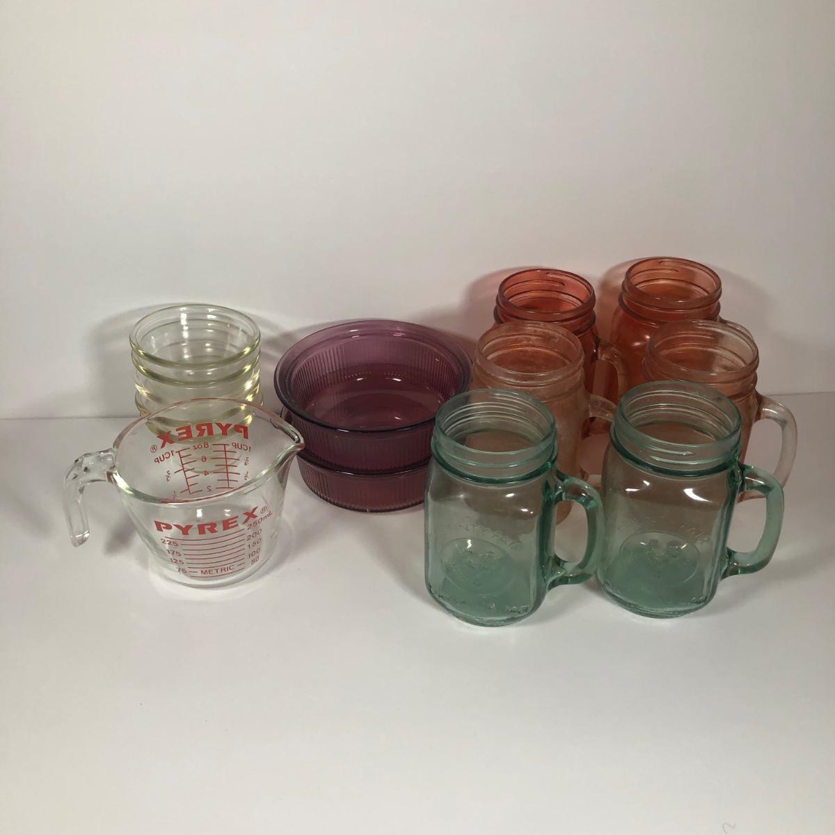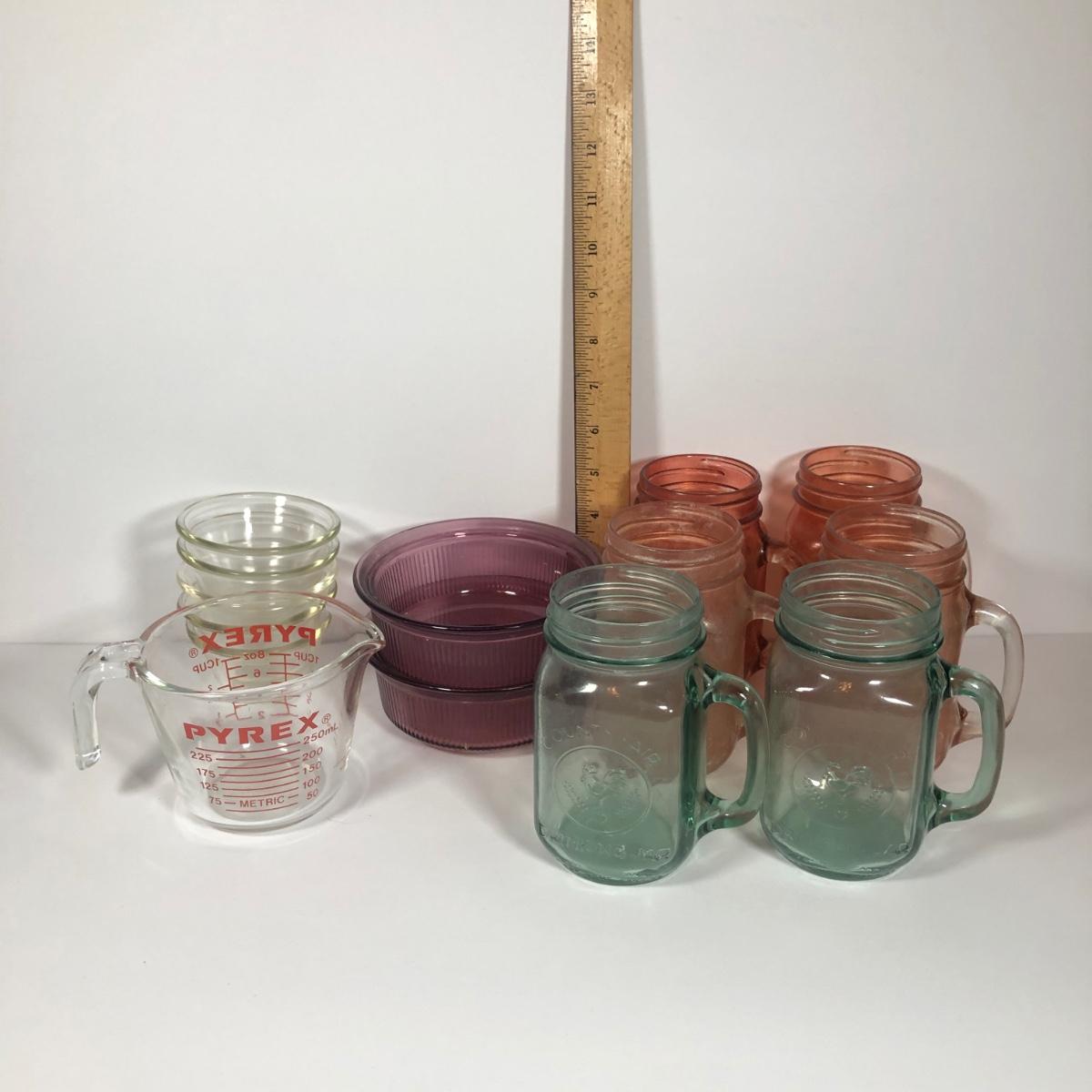 LOT 172K: Pink Glass Corning Dishes, Pyrex Custard Cups, County Fair Drinking Jars (Canada) & More