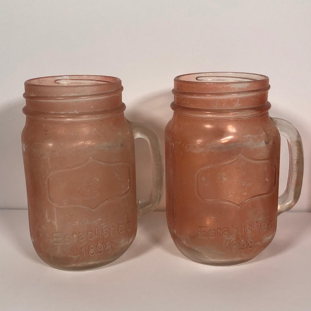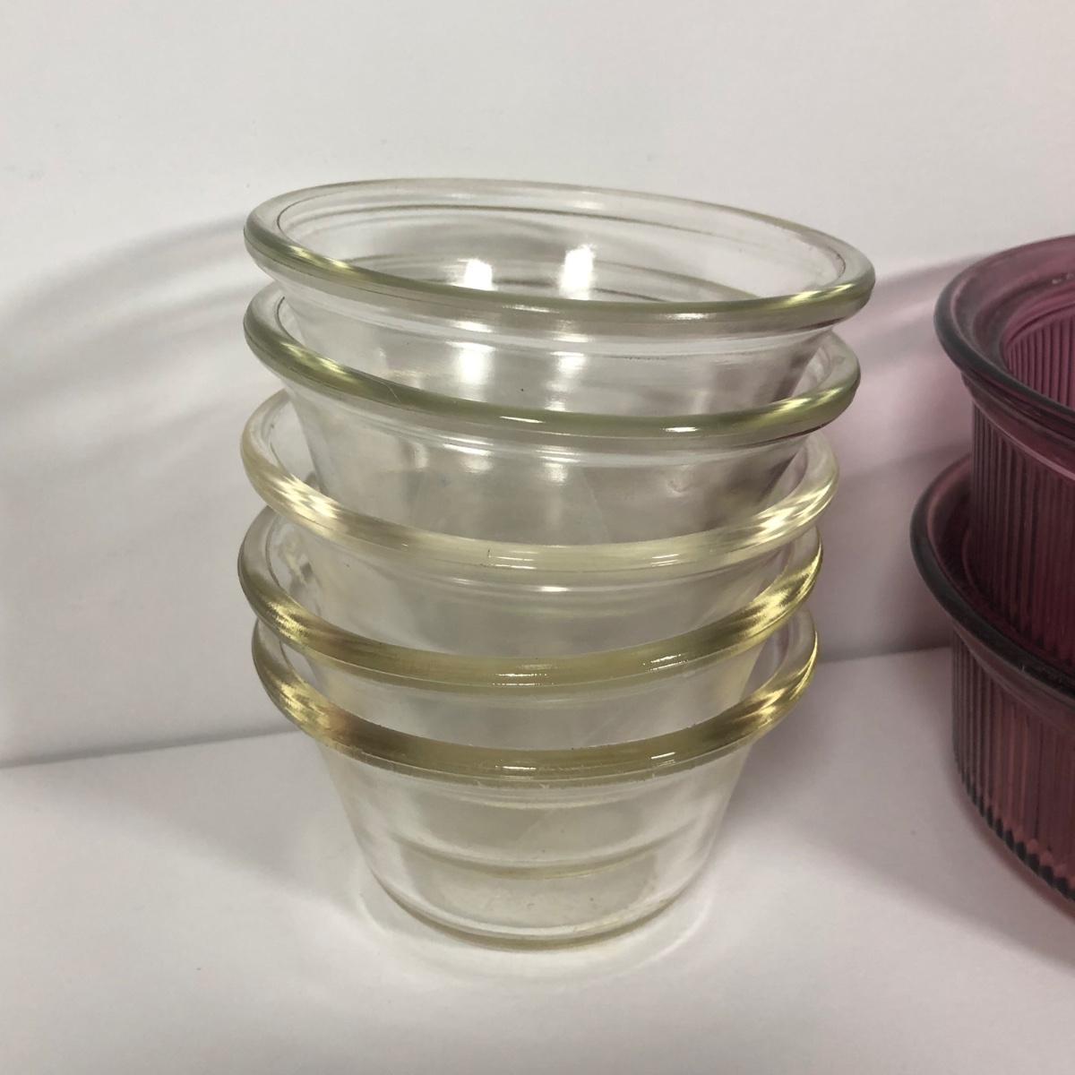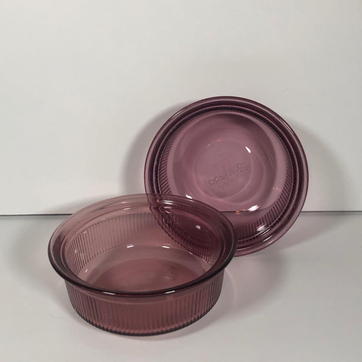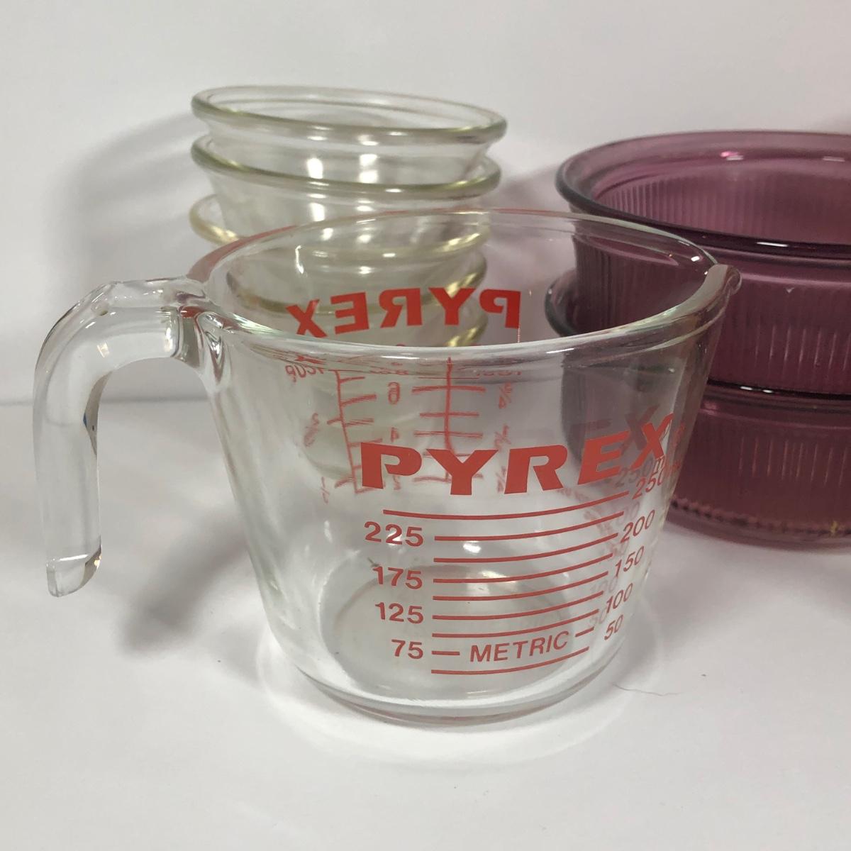 LOT 172K: Pink Glass Corning Dishes, Pyrex Custard Cups, County Fair Drinking Jars (Canada) & More