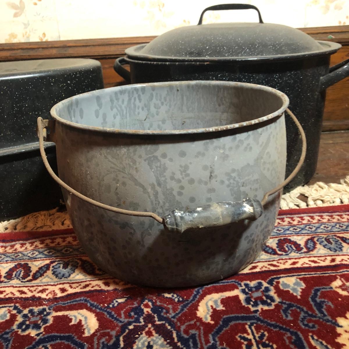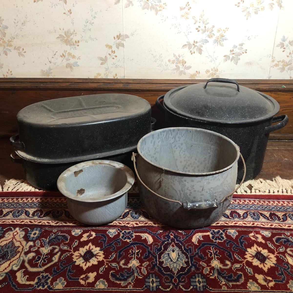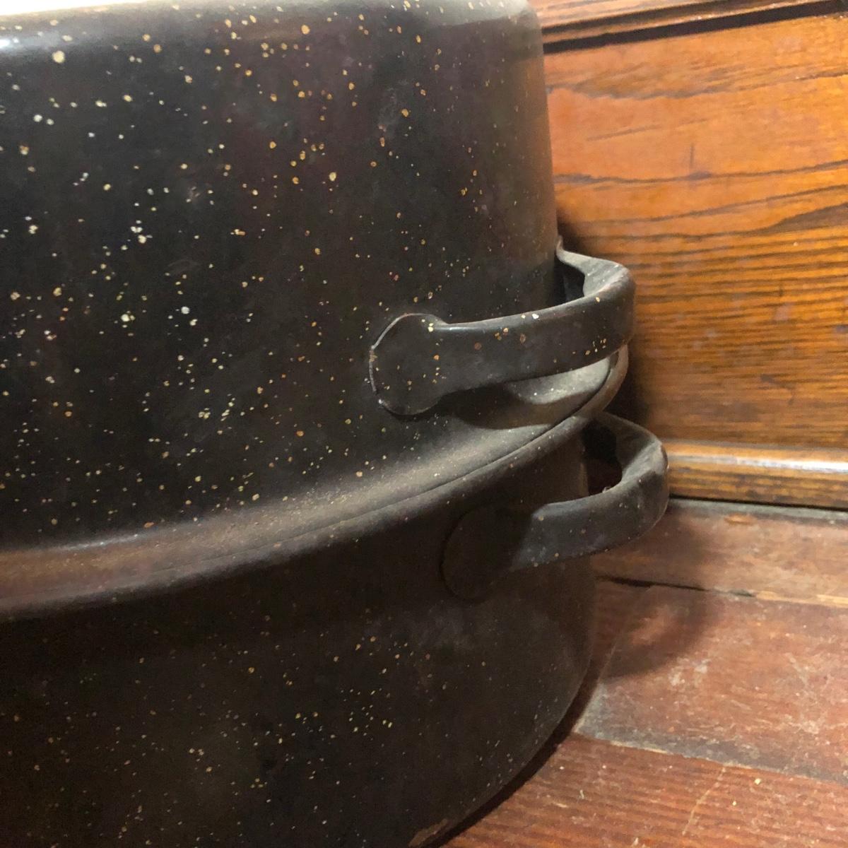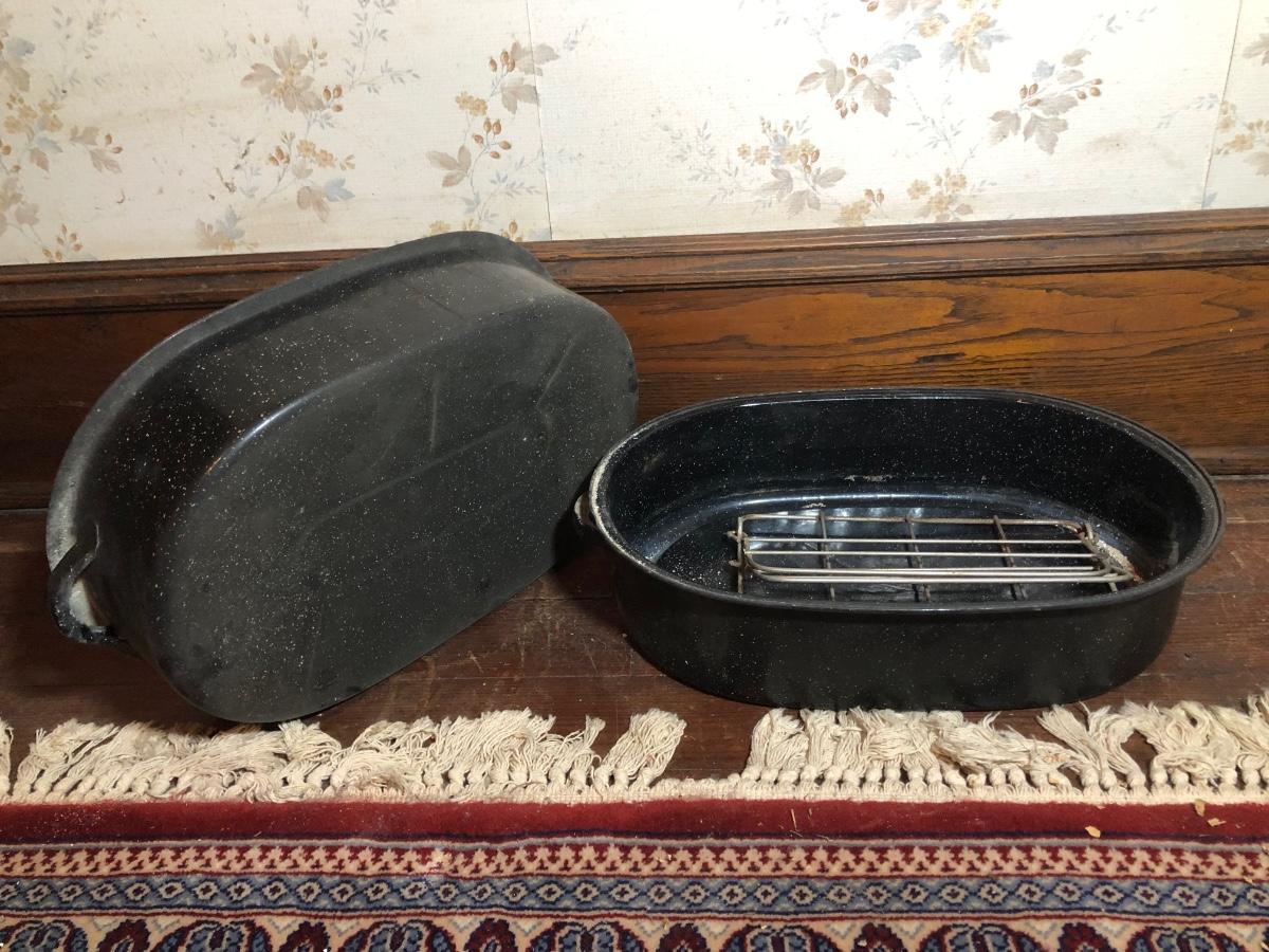 LOT 208L: Black Speckled Enamel Roasting Pan & Pot w/ Lid & More