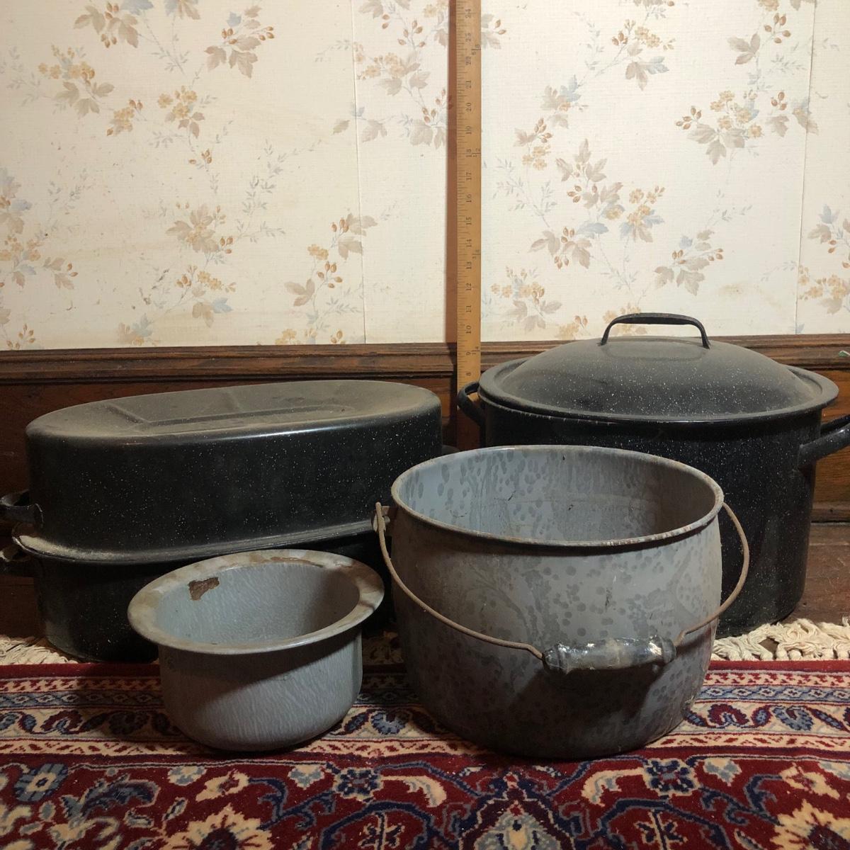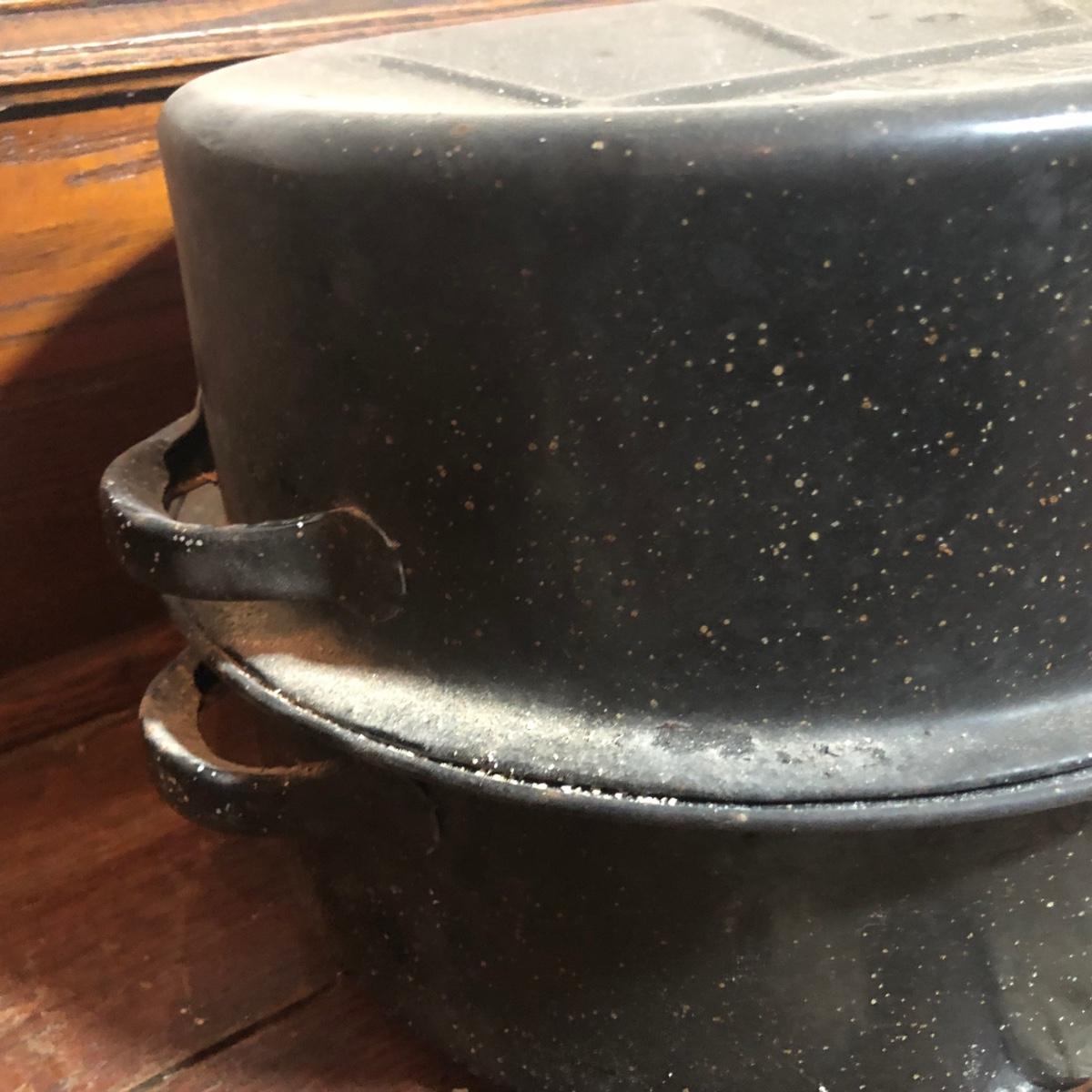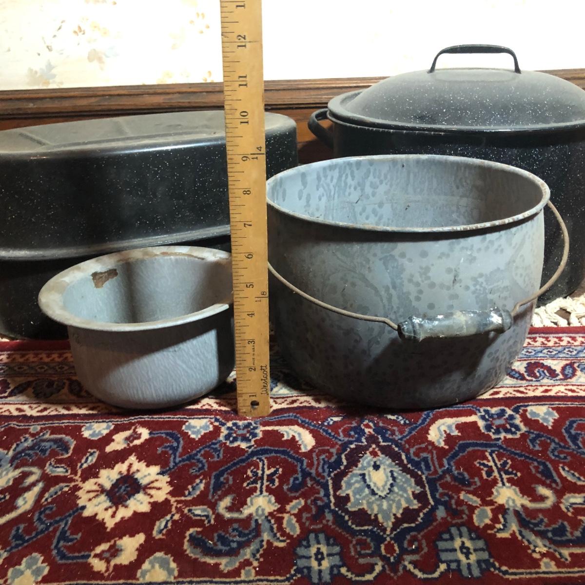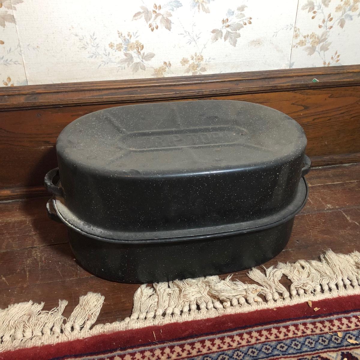 LOT 208L: Black Speckled Enamel Roasting Pan & Pot w/ Lid & More