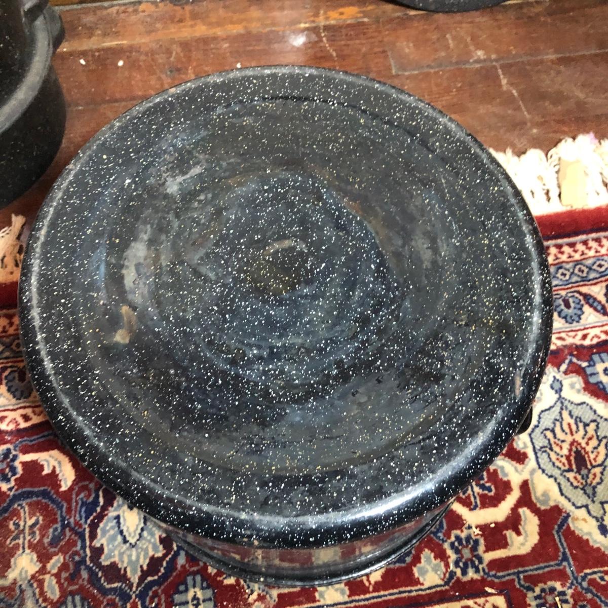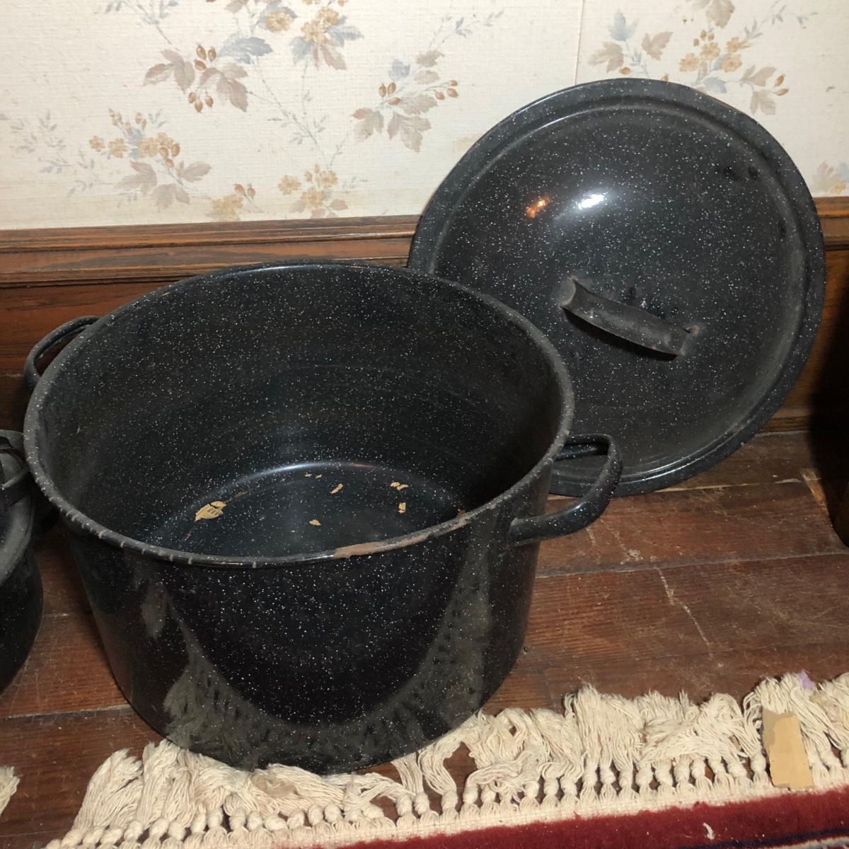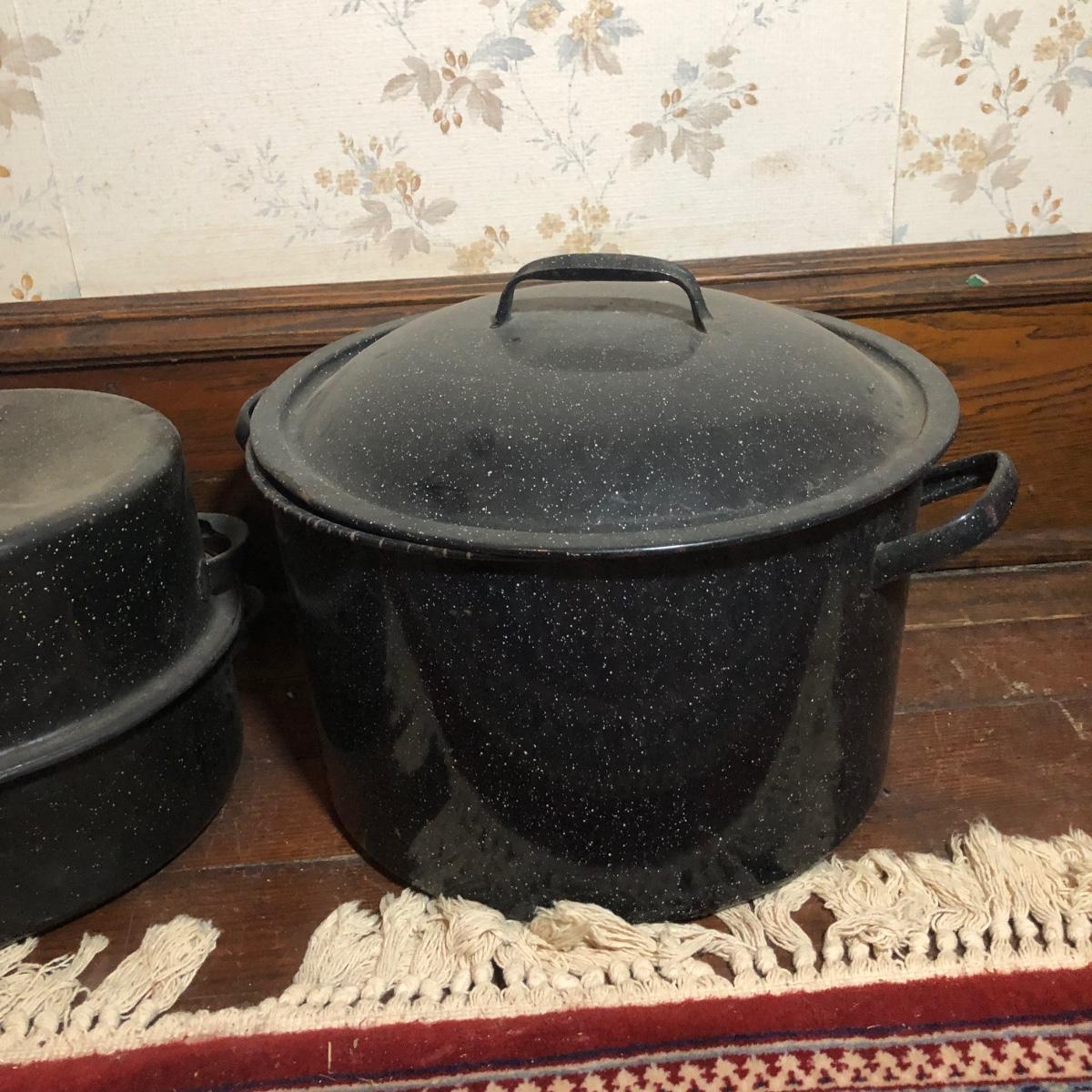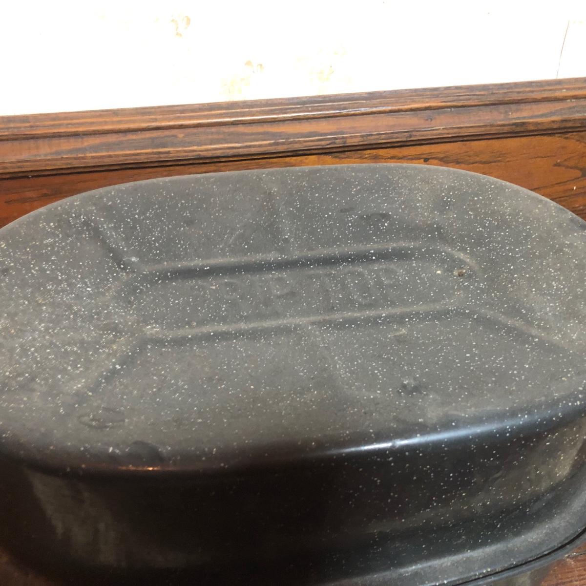 LOT 208L: Black Speckled Enamel Roasting Pan & Pot w/ Lid & More