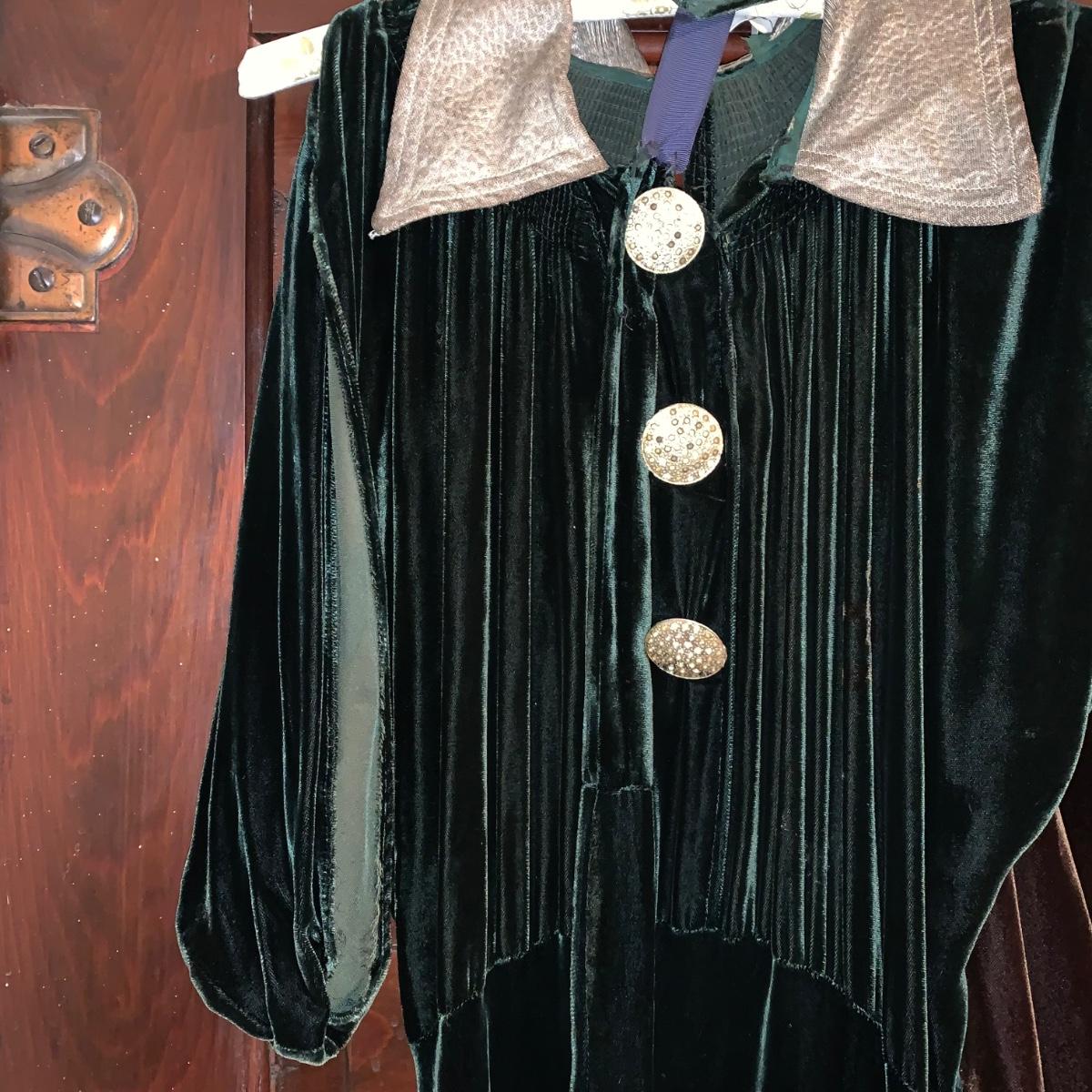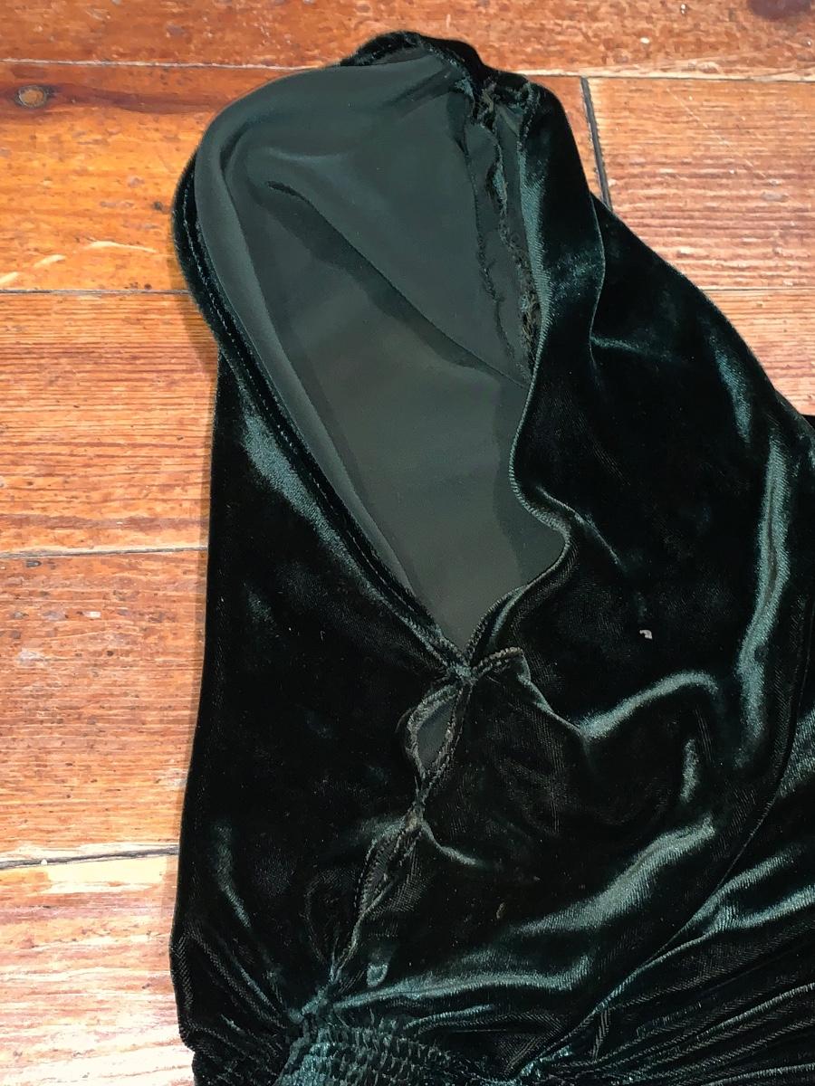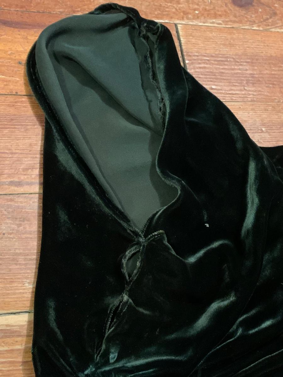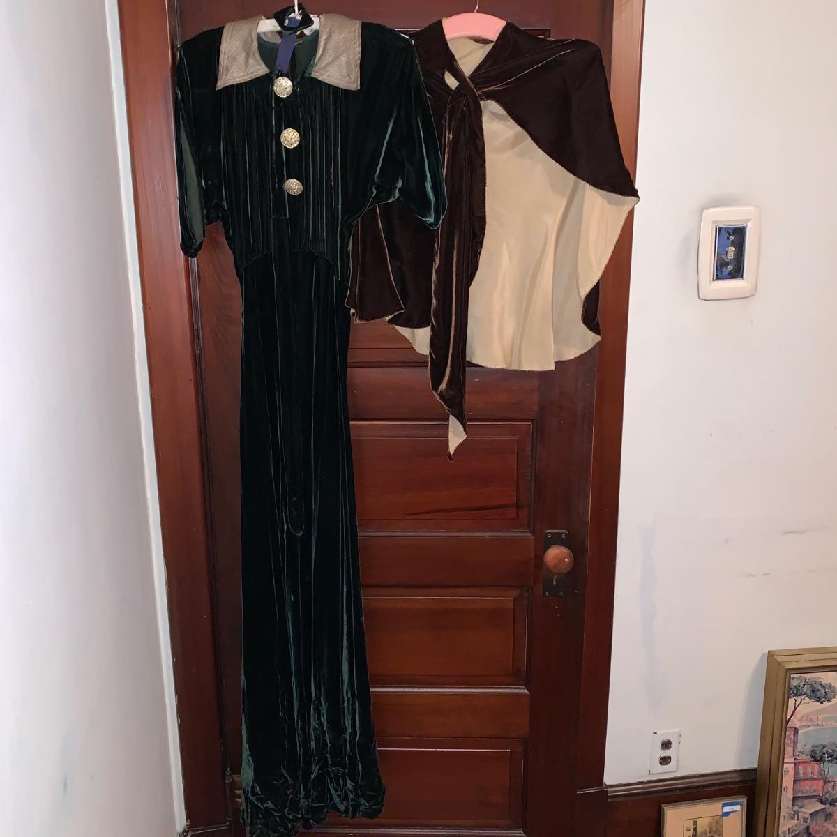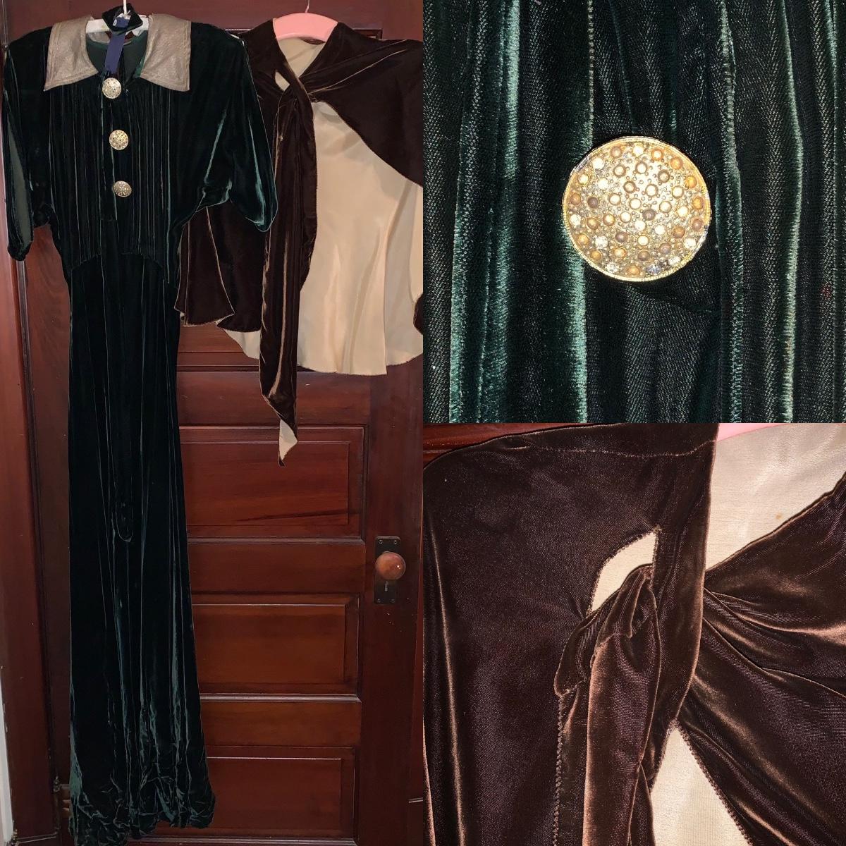 LOT 223 Y: Vintage Women's Emerald Velvet Dress W/ Belt & Dark Brown Shawl Wrap