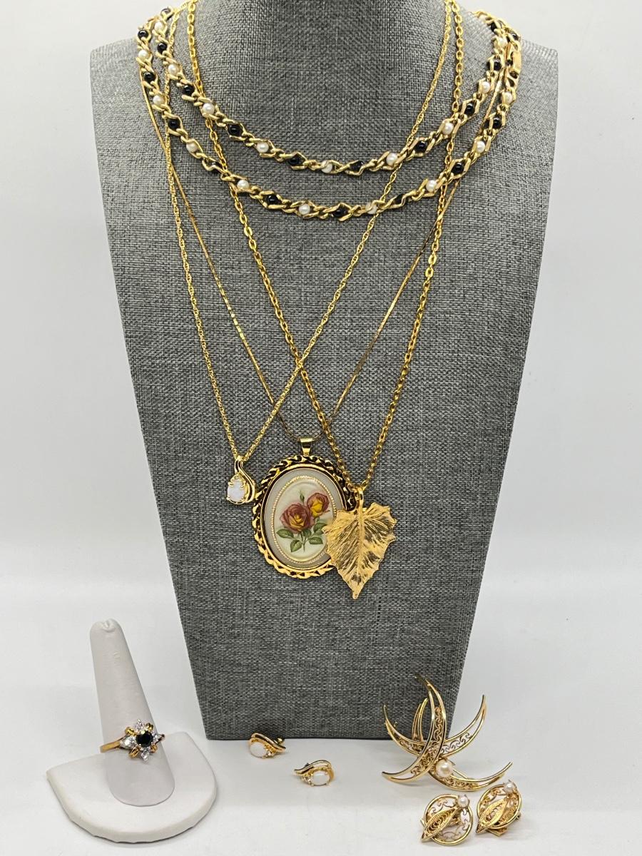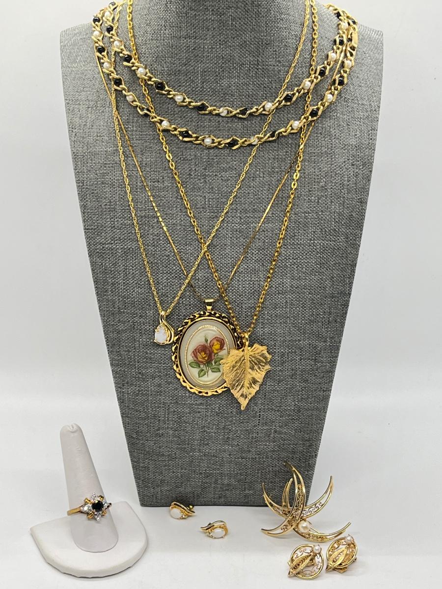 LOT 308J: Goldtone Necklaces, Earrings, Pin and Ring (Size 10)