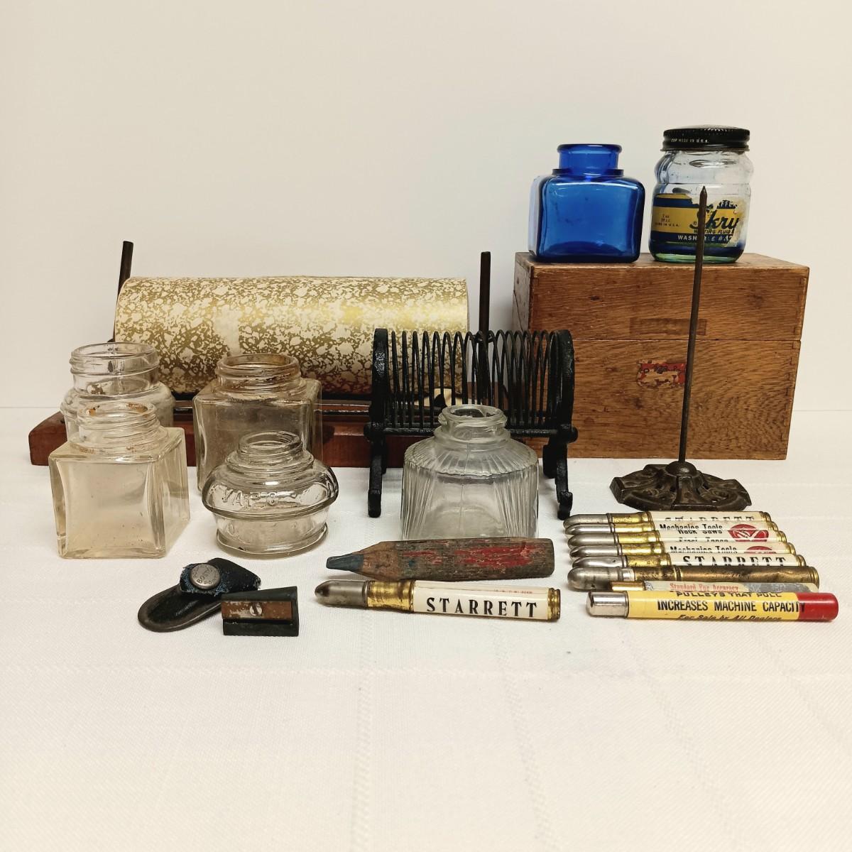 LOT:3: Vintage/Antique Office Supplies Including Ink Wells, Letter Holders. Bullet Pencils. Rolled Paper Dispenser and More