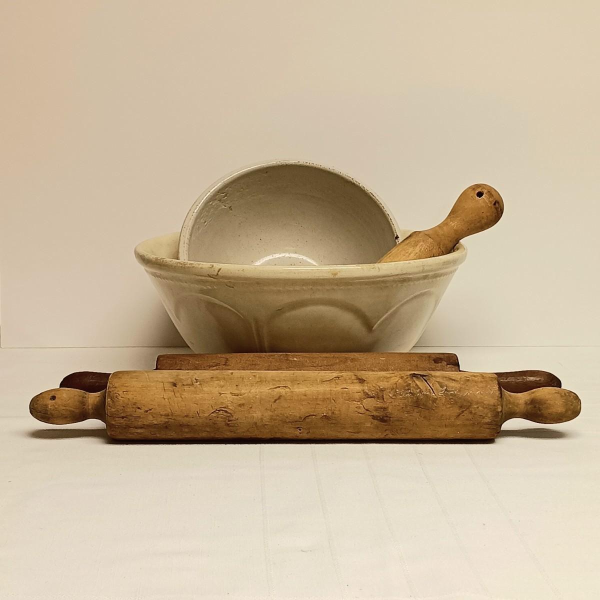 LOT:4: Vintage Rolling Pins, Pestal Ironstone Bowls