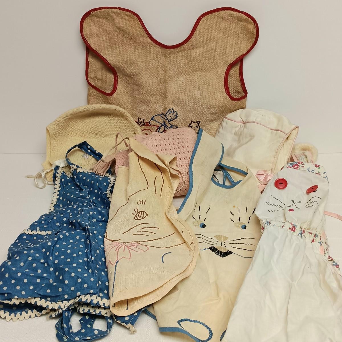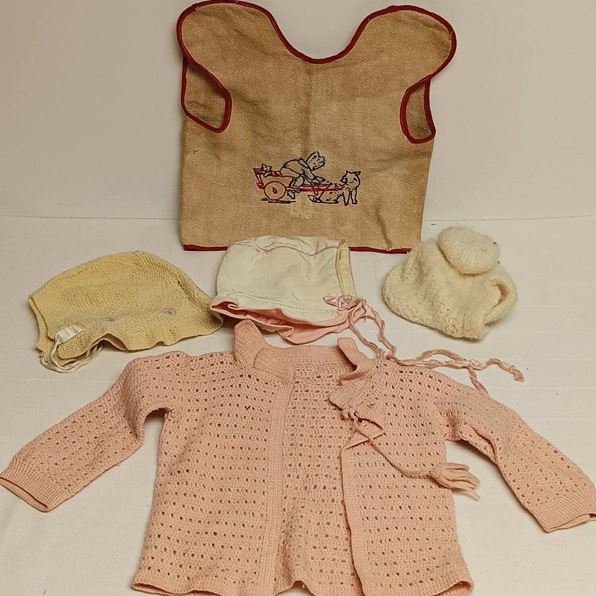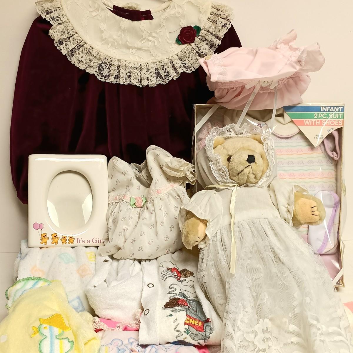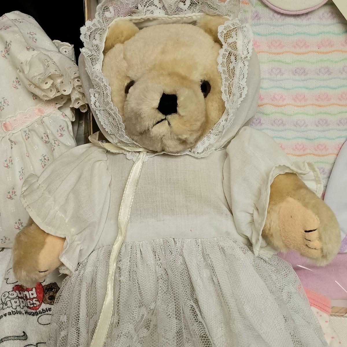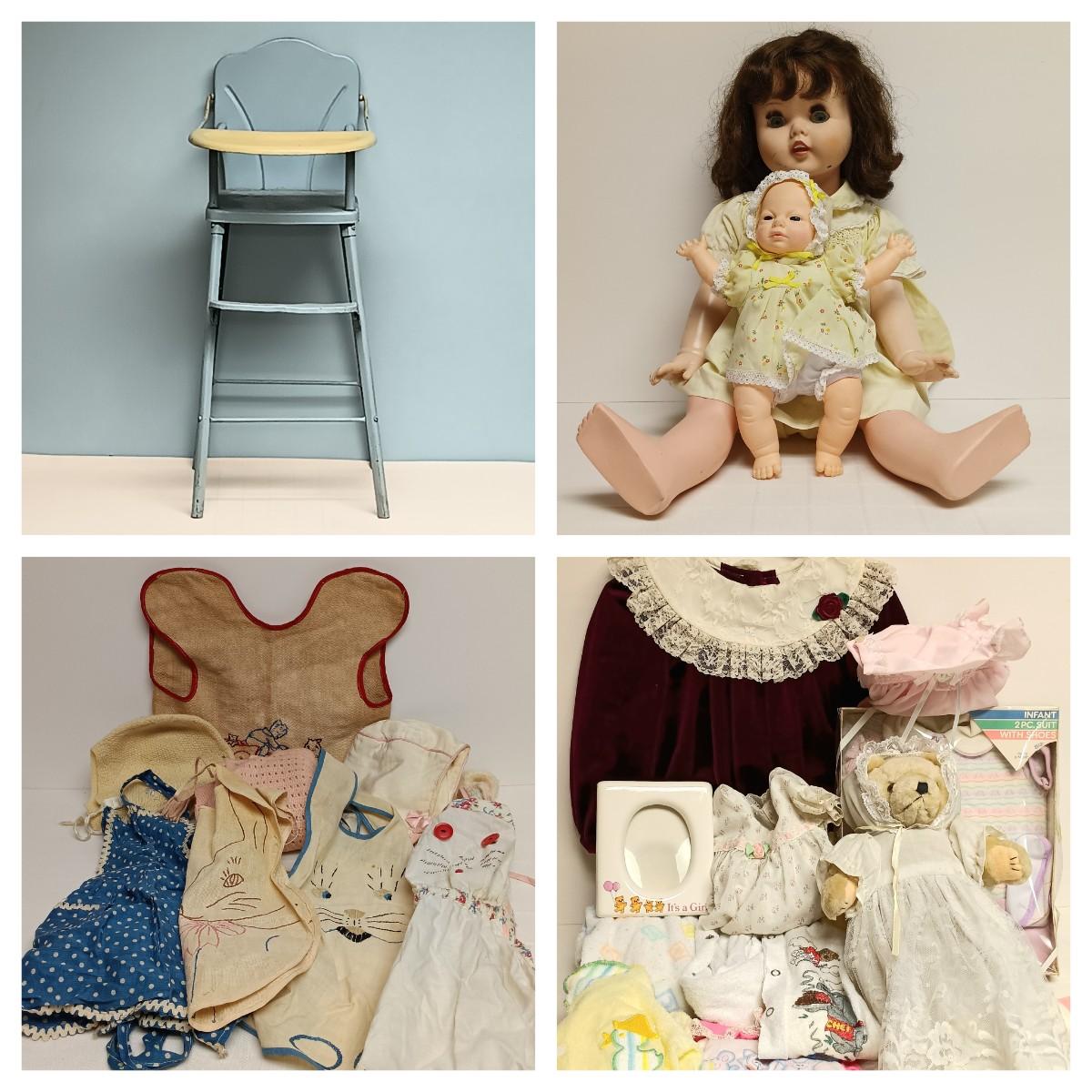 LOT:10: Vintage Baby Doll Collection with 2 Dolls, a Baby Bear, a Doll Highchair with Tray and Vintage Baby Clothing