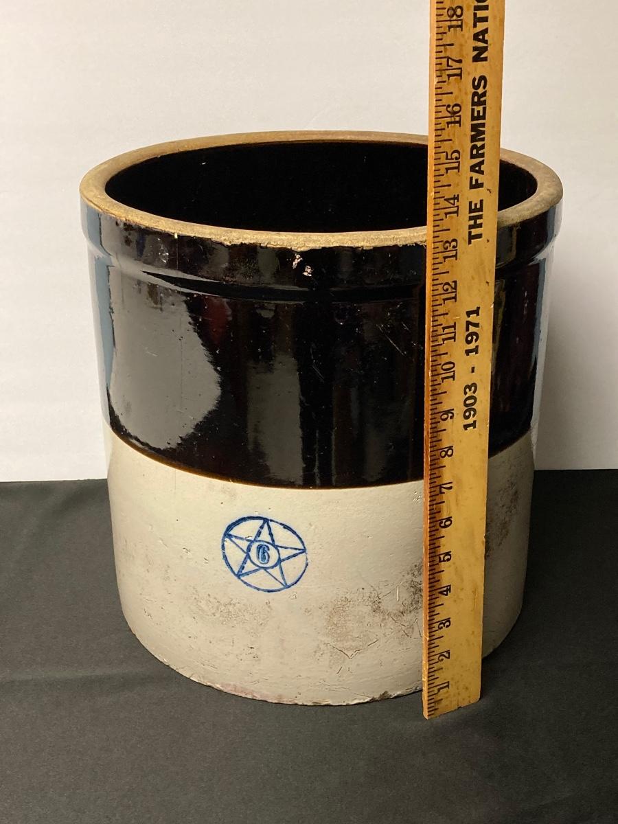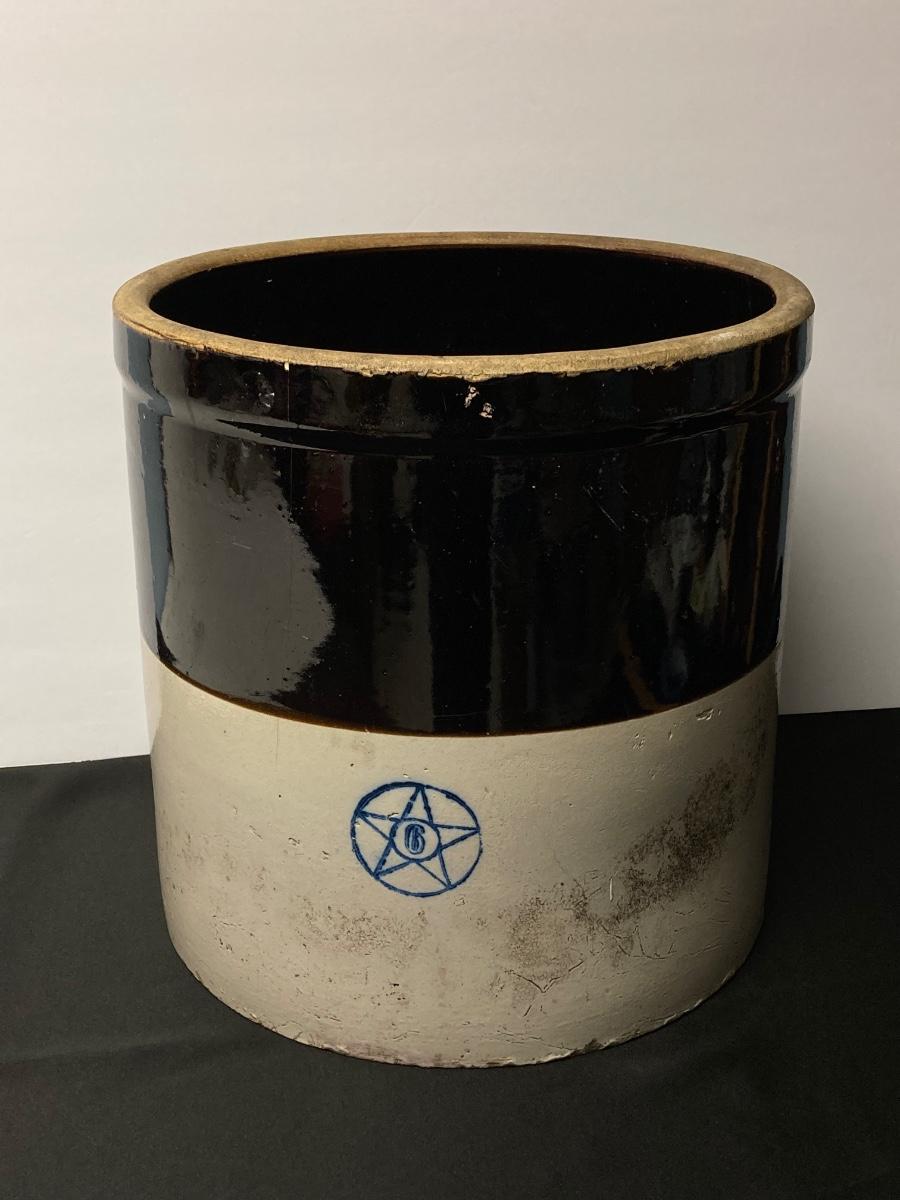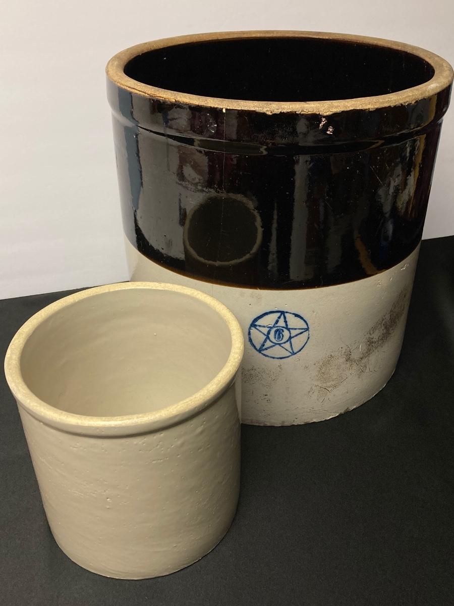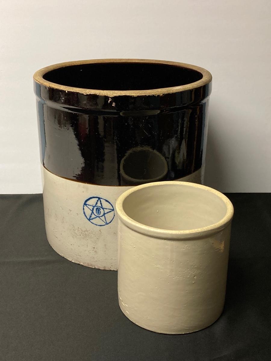 LOT 23: Large Salt Glaze Blue Star Stoneware 6 Gallon Crock and Stoneware Crock