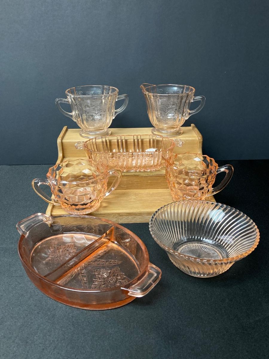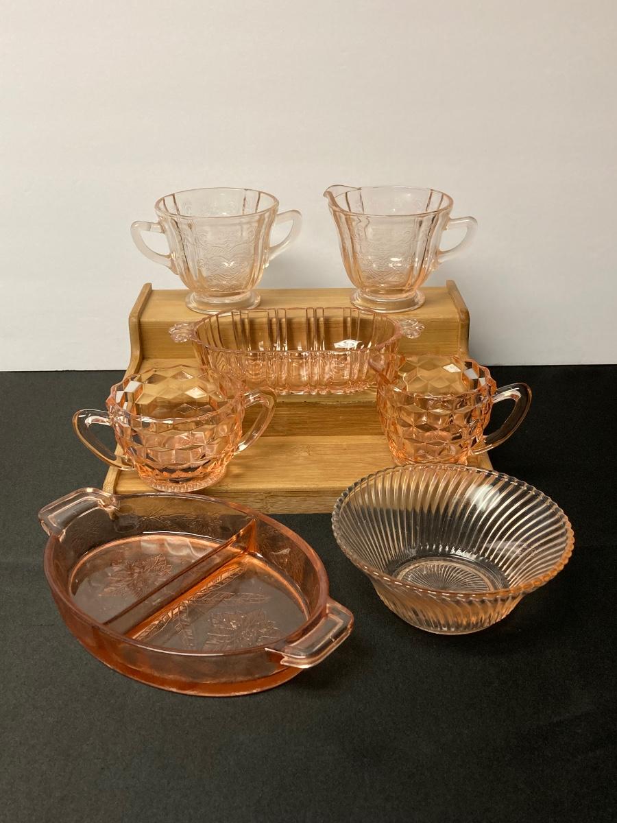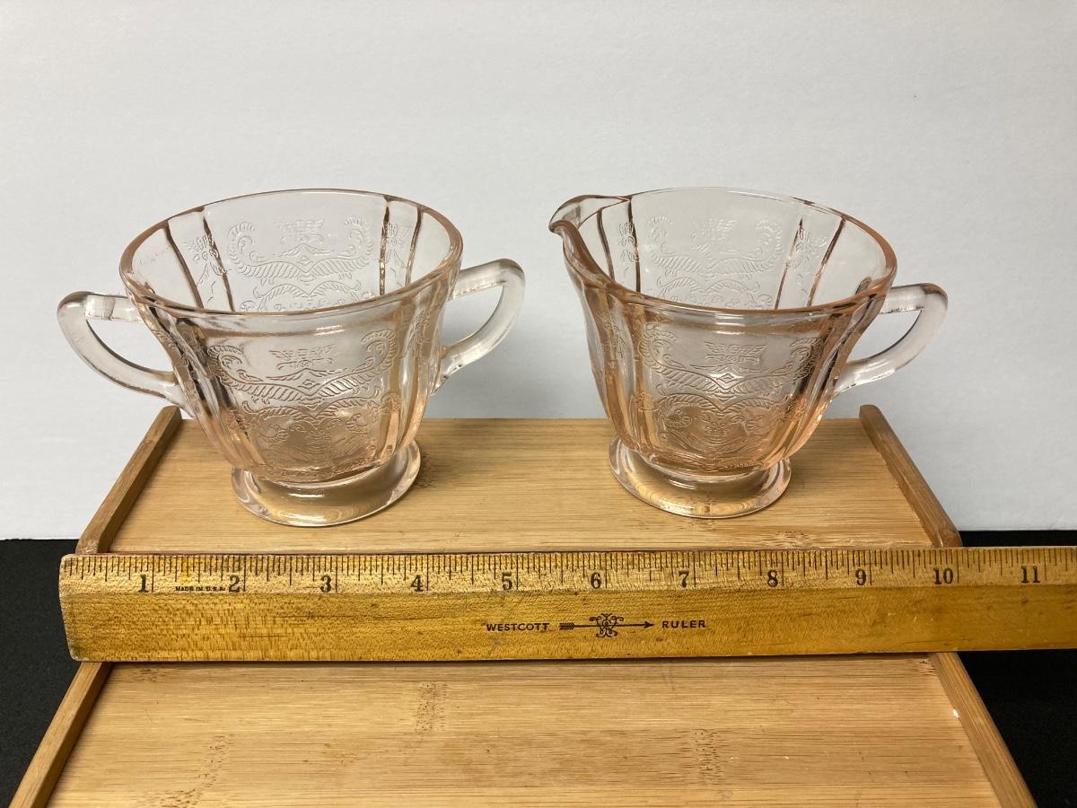 LOT 25: Collection of Pink Depression Glass - Cream & Sugar Bowls, "Old Cafe" and More