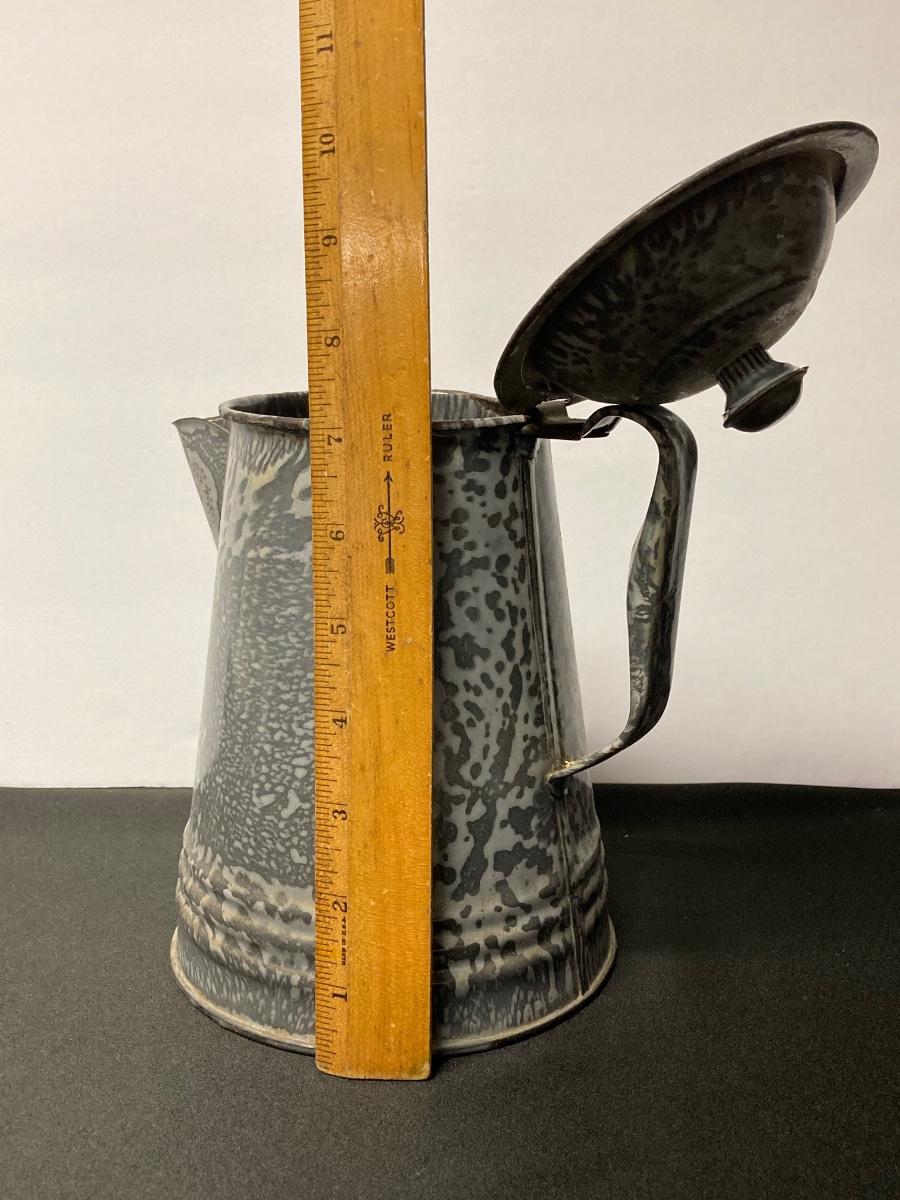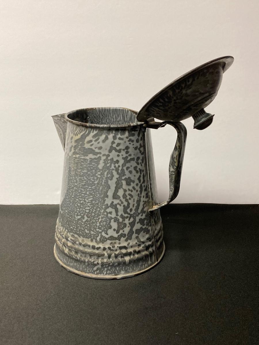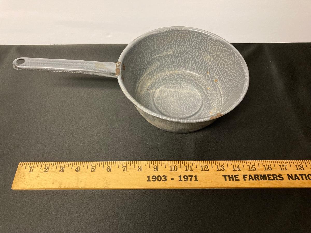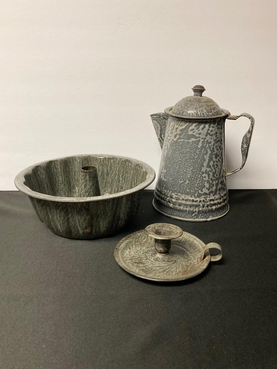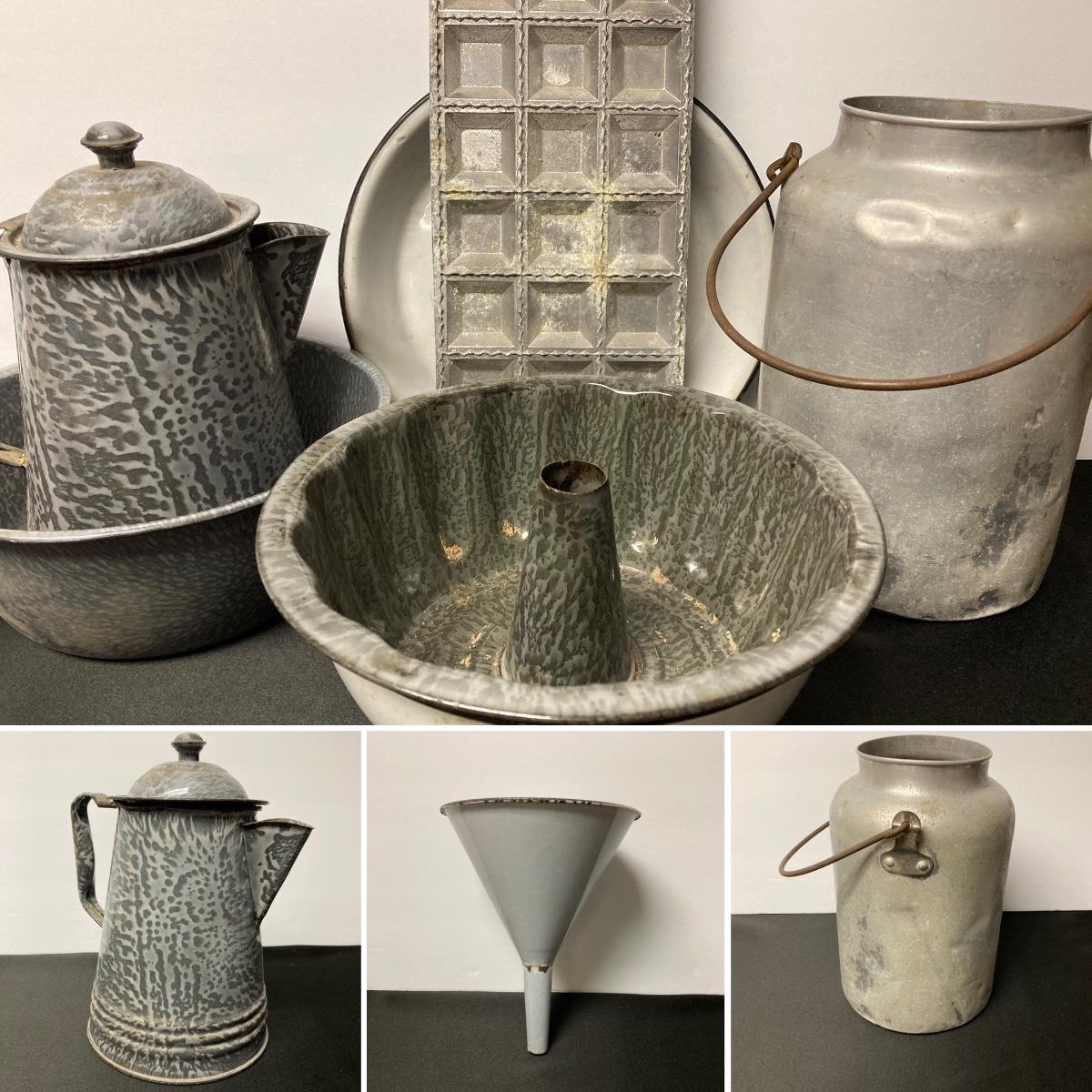 LOT 53: Vintage Coffee Pot & Baking Pans Granite Wear, White Enamel Ware Funnel, Metal Milk Pail, Pasta Mold & More