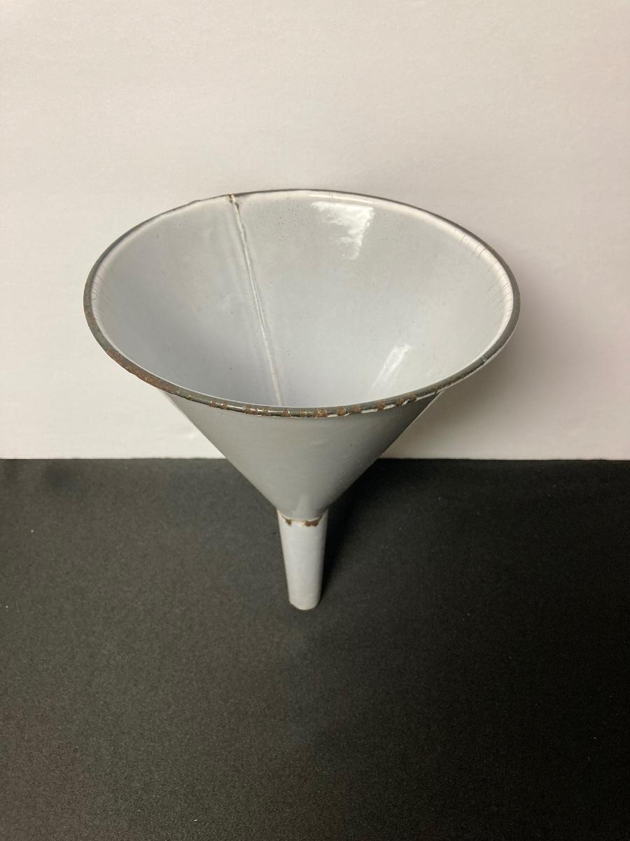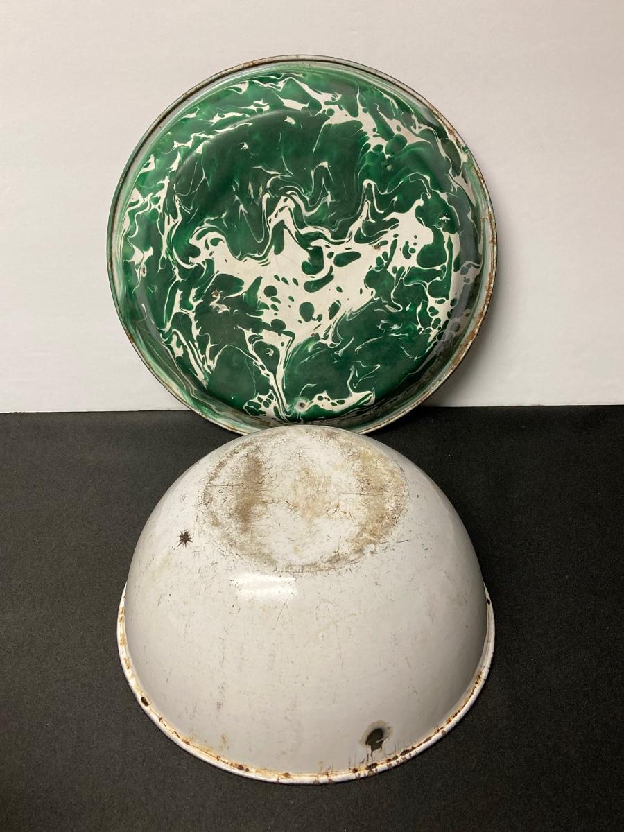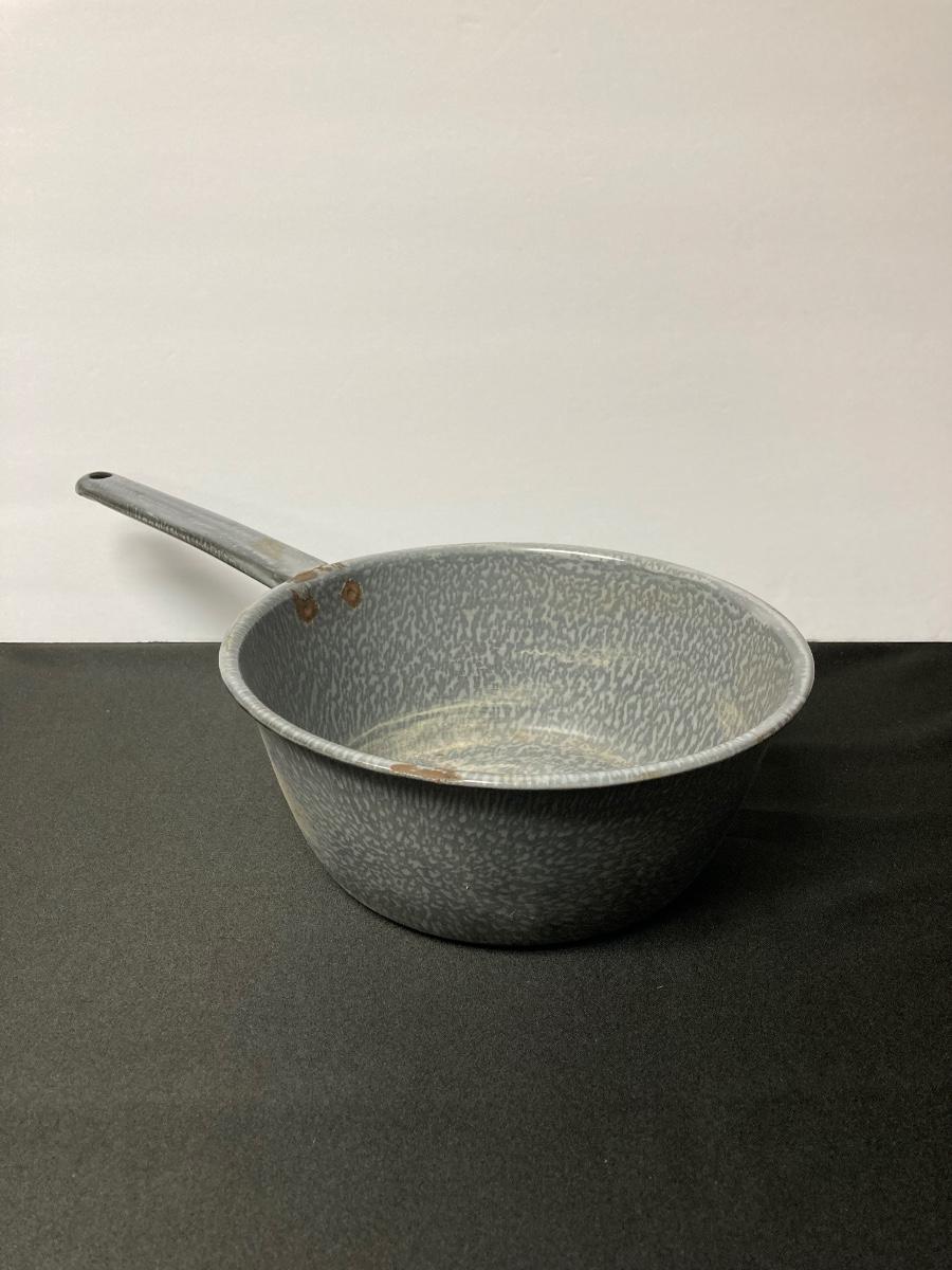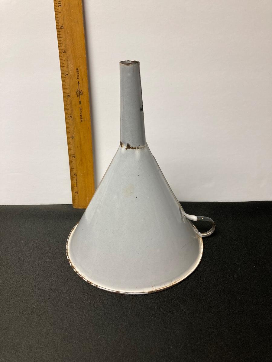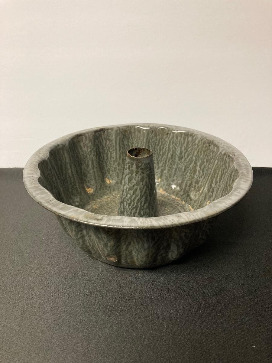 LOT 53: Vintage Coffee Pot & Baking Pans Granite Wear, White Enamel Ware Funnel, Metal Milk Pail, Pasta Mold & More