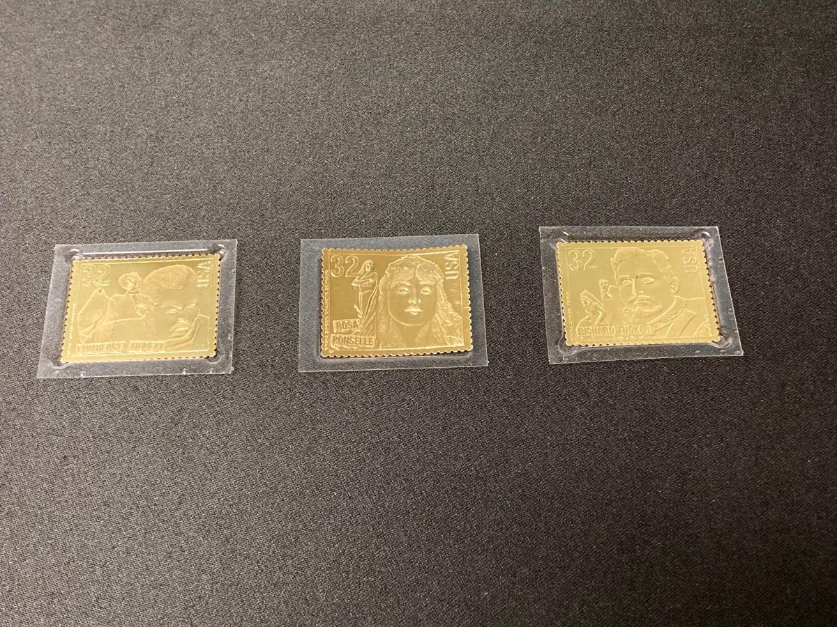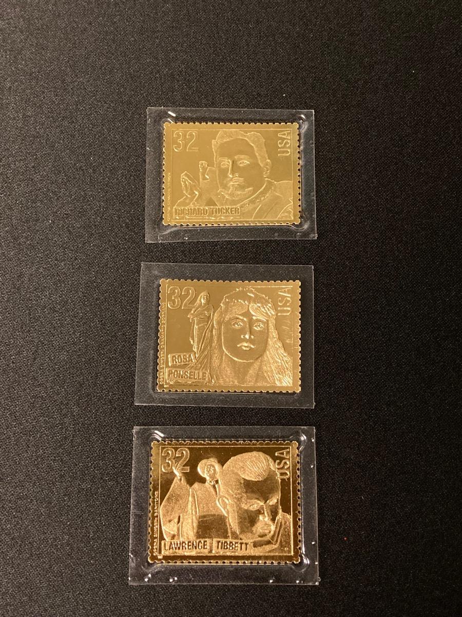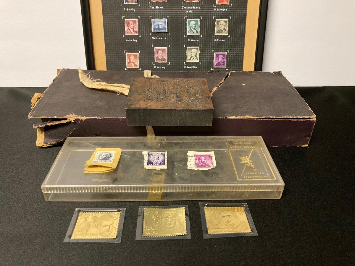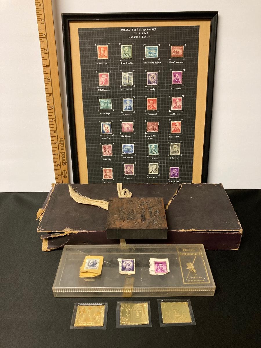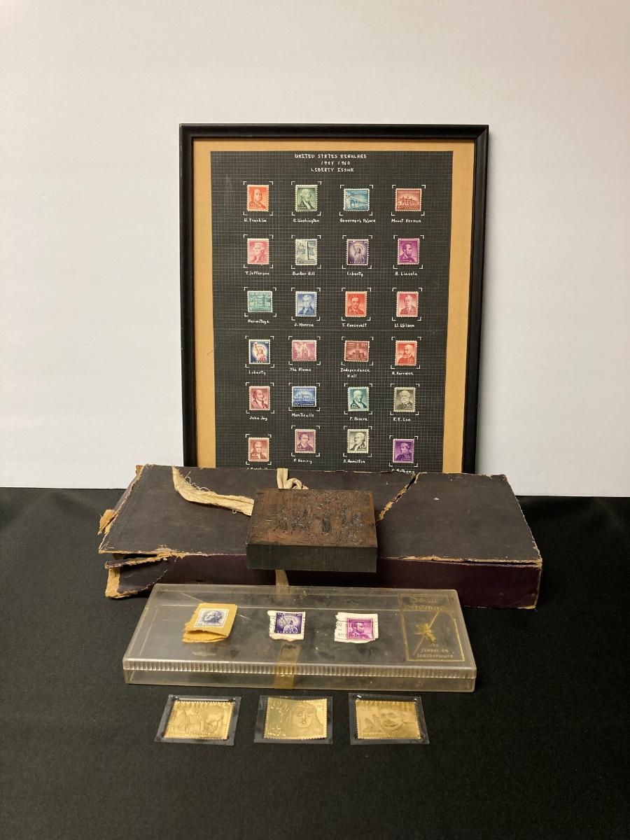 LOT 54: Antique Printer's Stamp Set & Block Stamp, Gold Foil Stamps: Richard Tucker, Rosa Ponselle, Lawerence Tibbet, Liberty Issue Stamps (in frame w/no glass)
