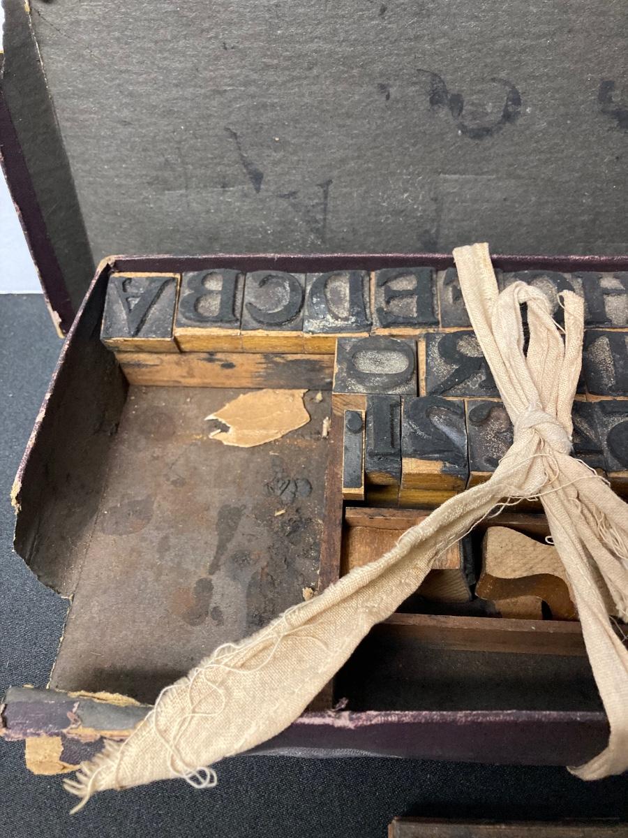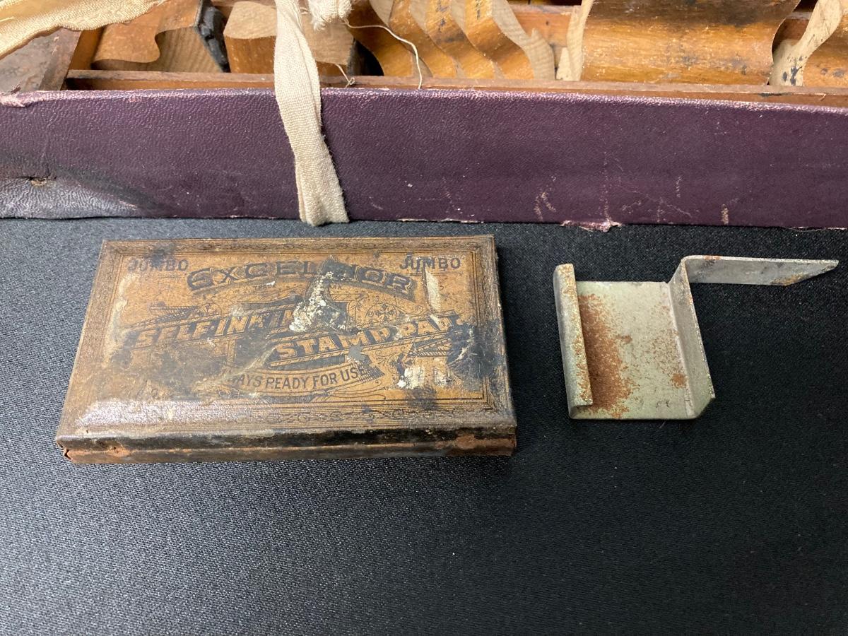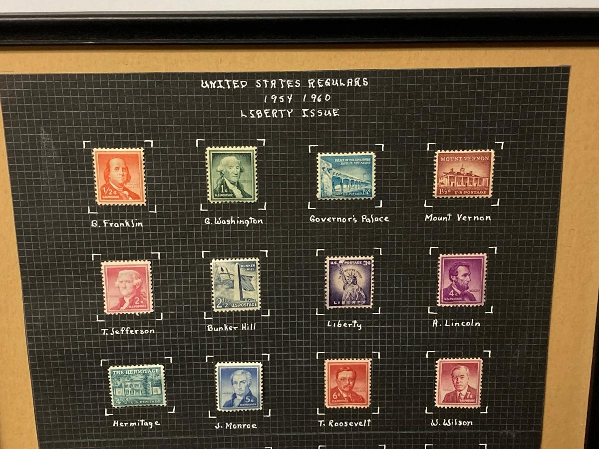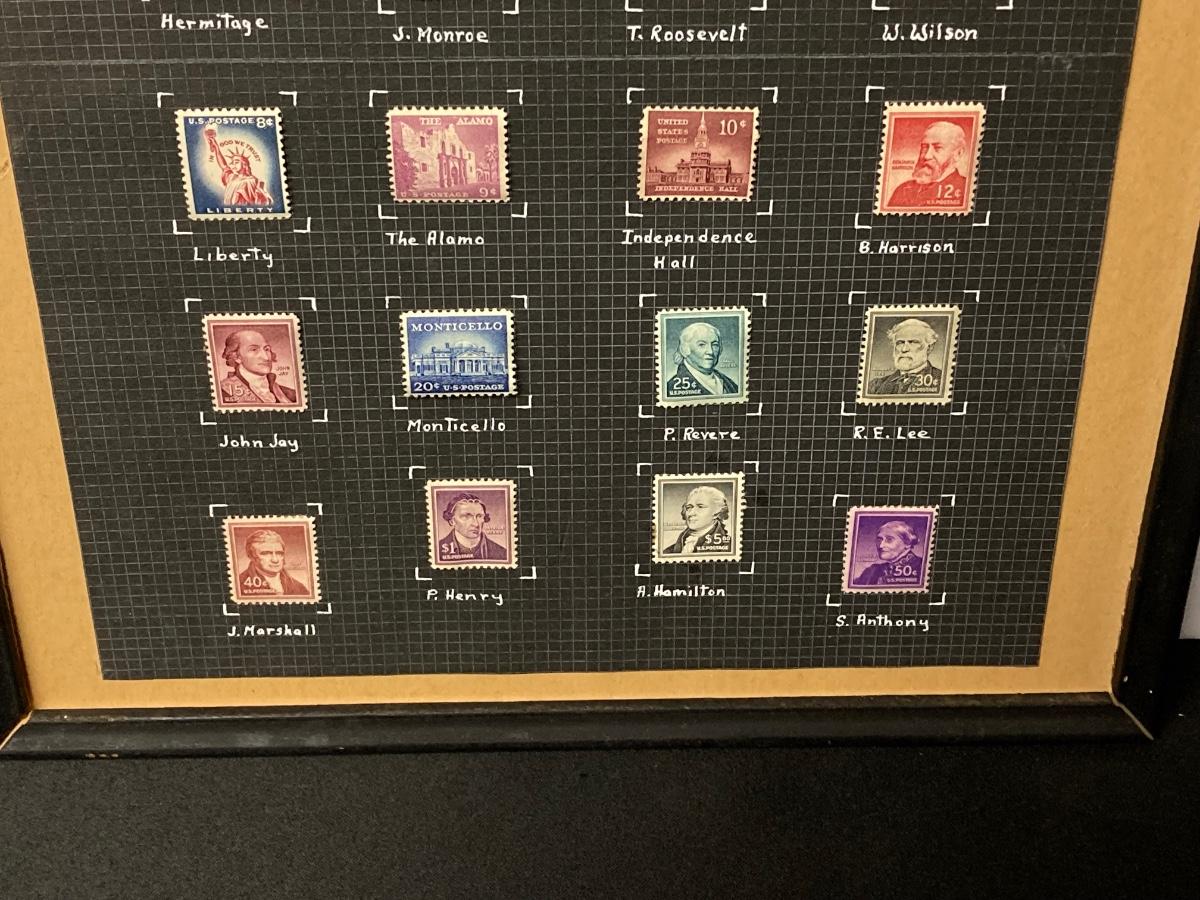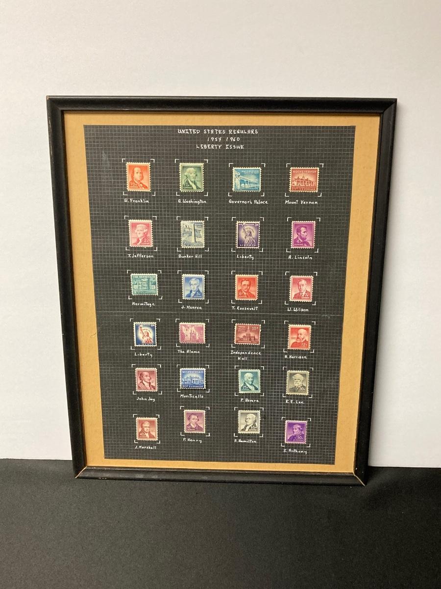 LOT 54: Antique Printer's Stamp Set & Block Stamp, Gold Foil Stamps: Richard Tucker, Rosa Ponselle, Lawerence Tibbet, Liberty Issue Stamps (in frame w/no glass)