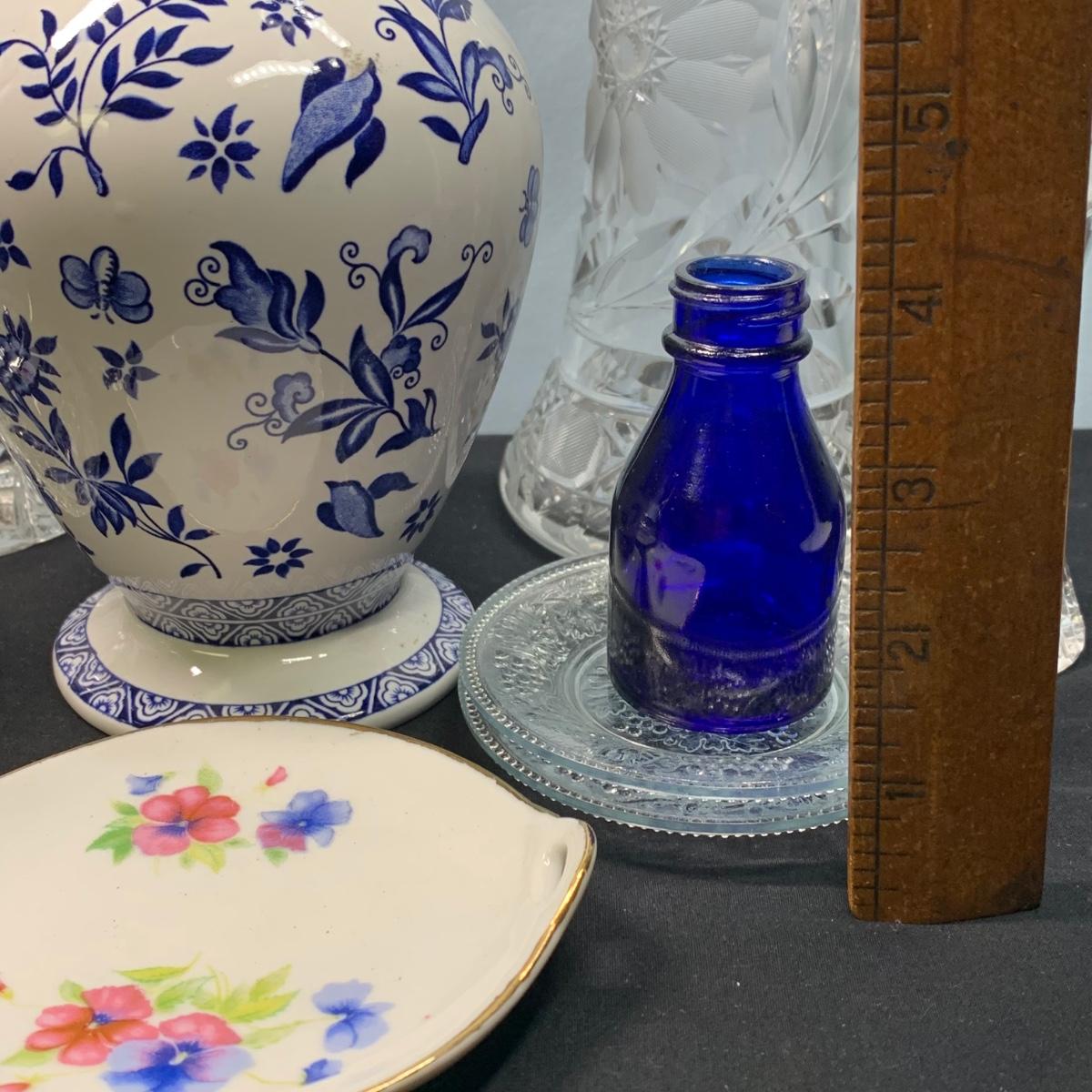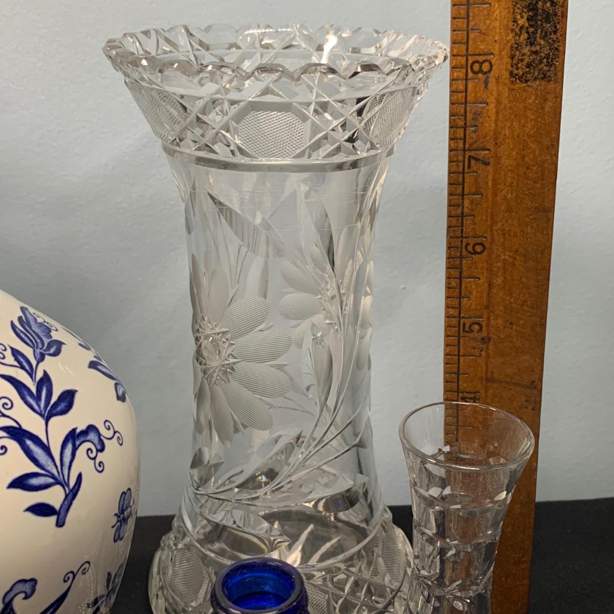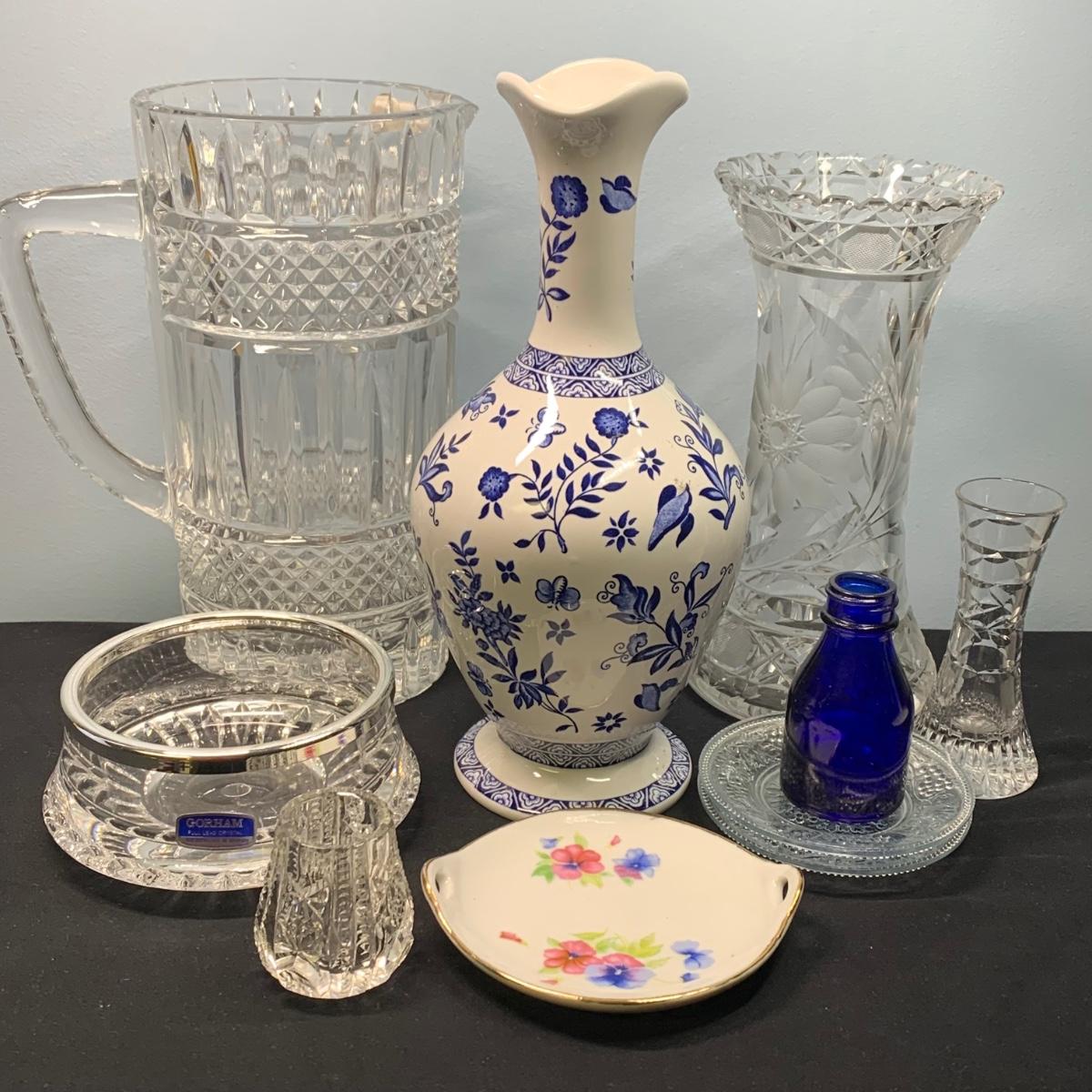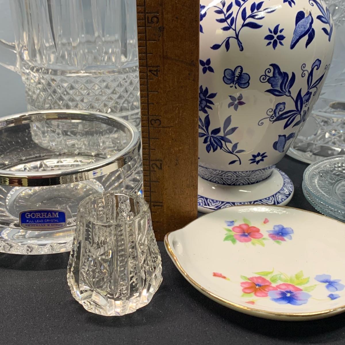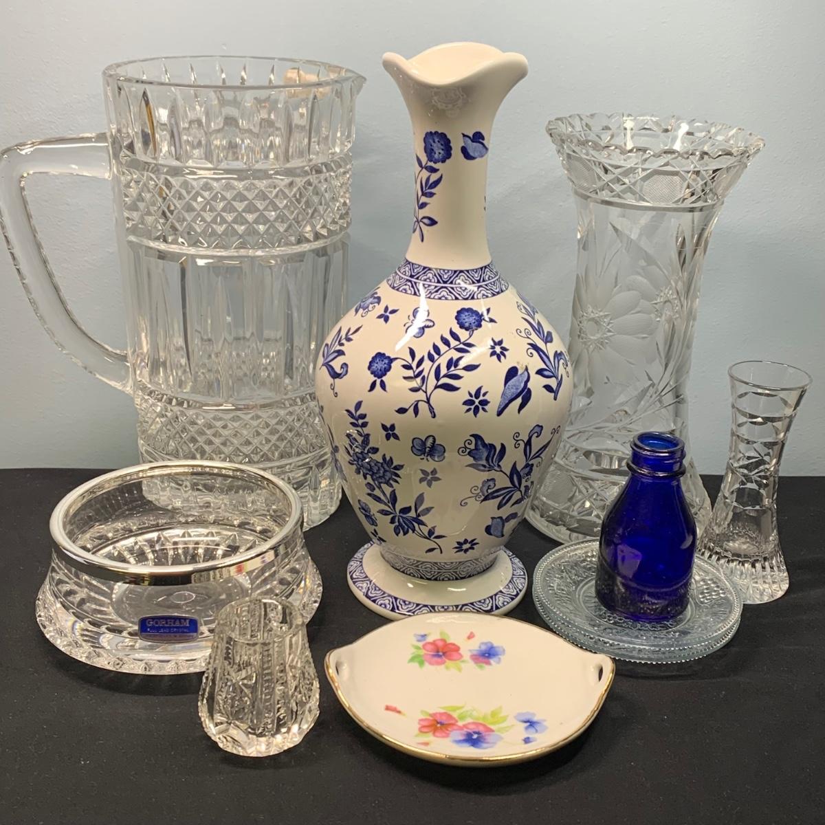 LOT 65: Blue Floral Coal Port Limited Edition Vase, Bohemia Crystal Pitcher, Gorham Cut Glass Bowl w/Silver Plate Rim & More