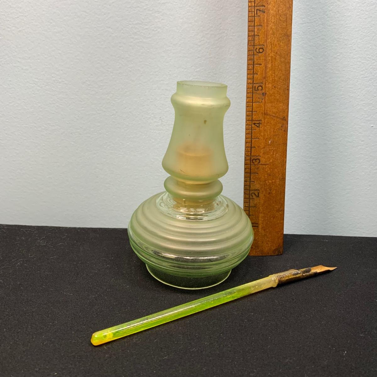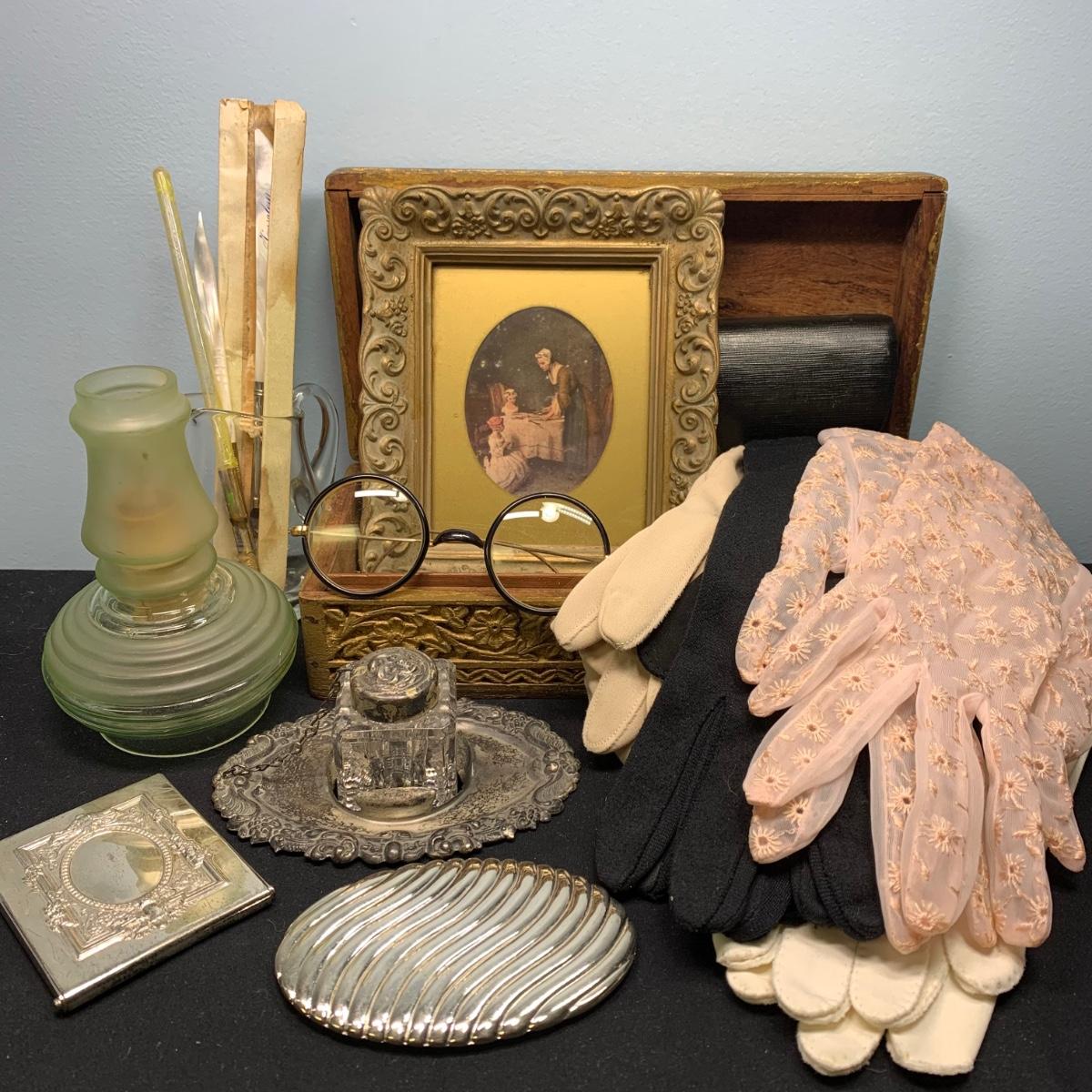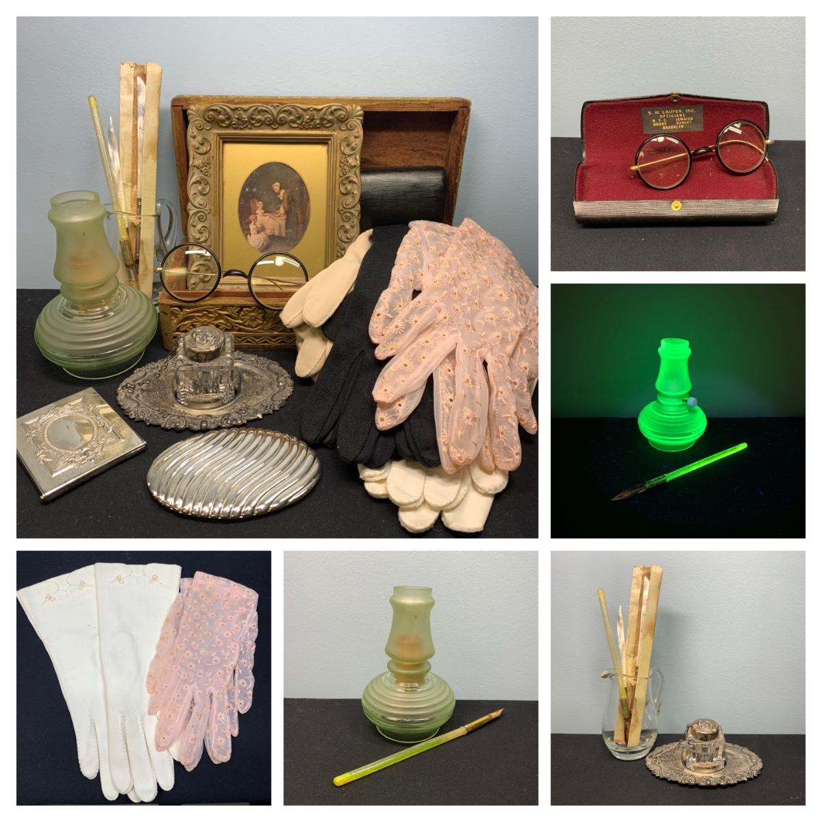 LOT 67: Unique Uranium Glass Light & Calligraphy Pen, Vintage Ladies Gloves, Calligraphy Pens, Glasses & More