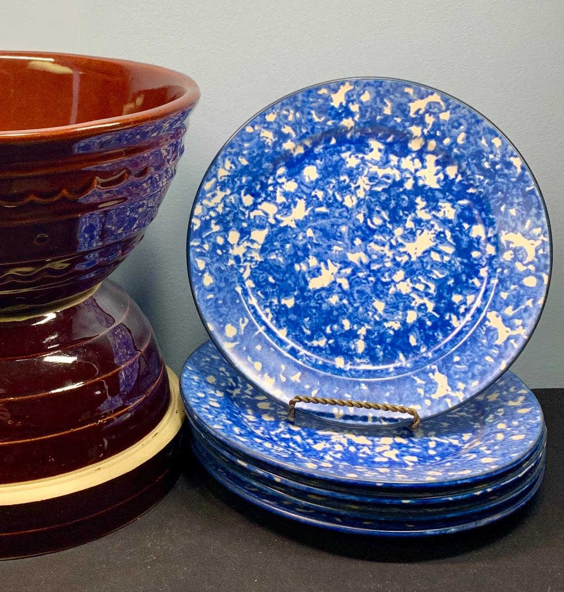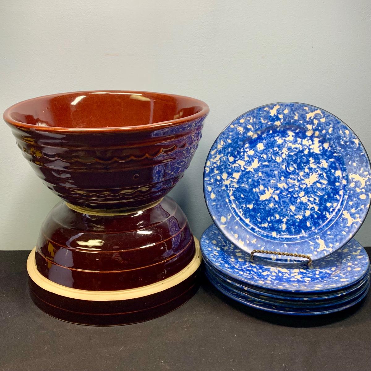 LOT 71: Stangl Spongeware Plates & Brown Glaze Pottery Mixing Bowls