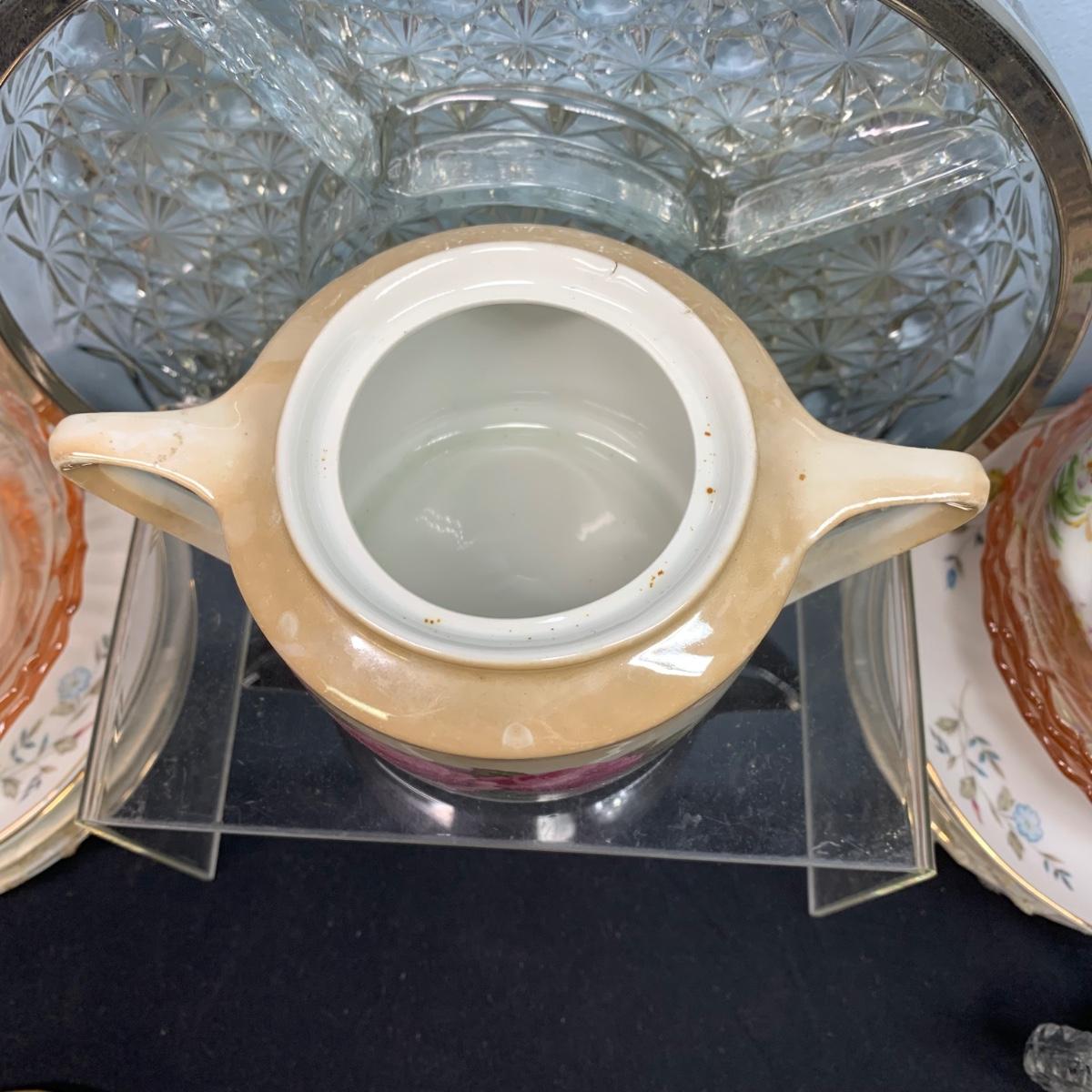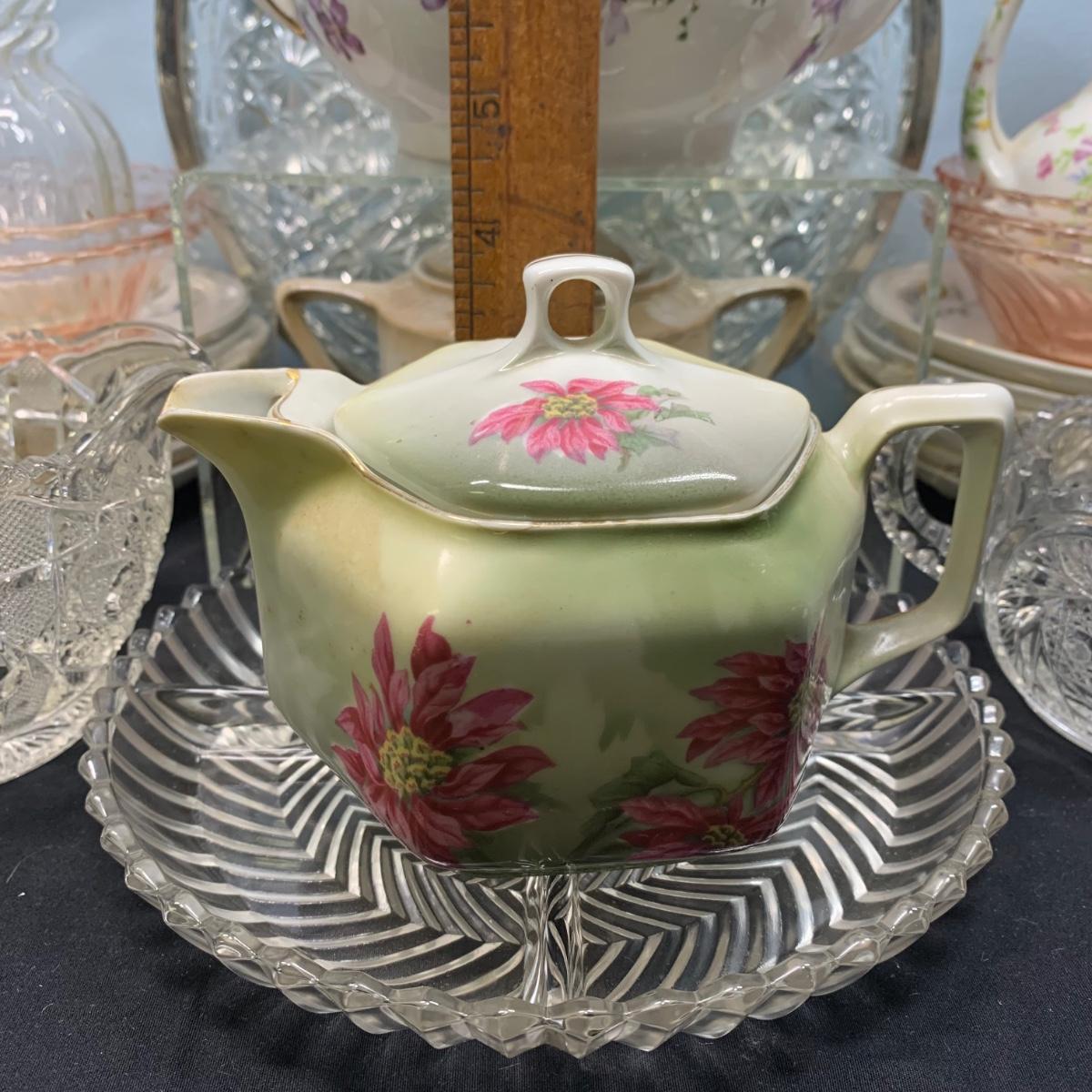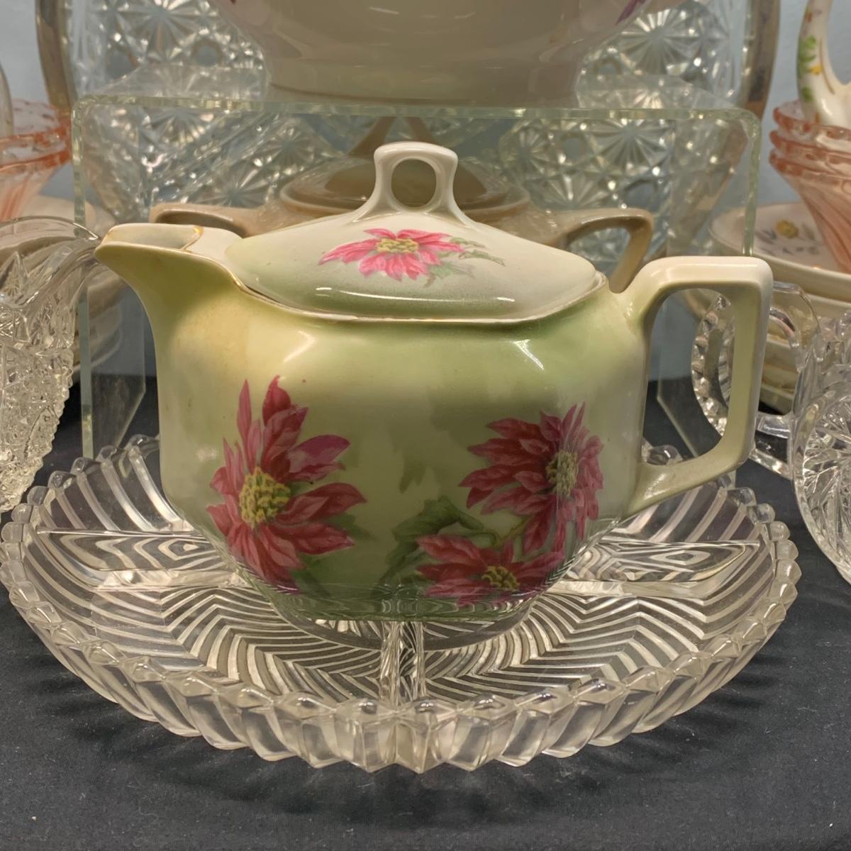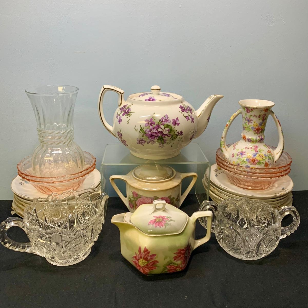 LOT 72: Teapots, Pink Squirl Bowls, Cut Crystal Sugar Bowl w/Creamer, Floral Vases & More