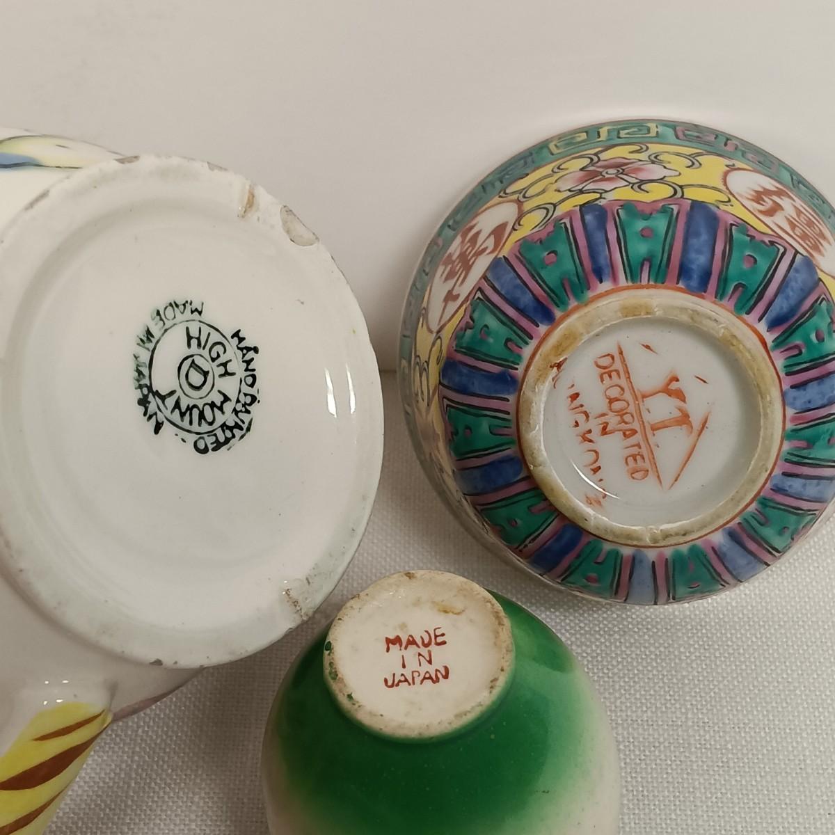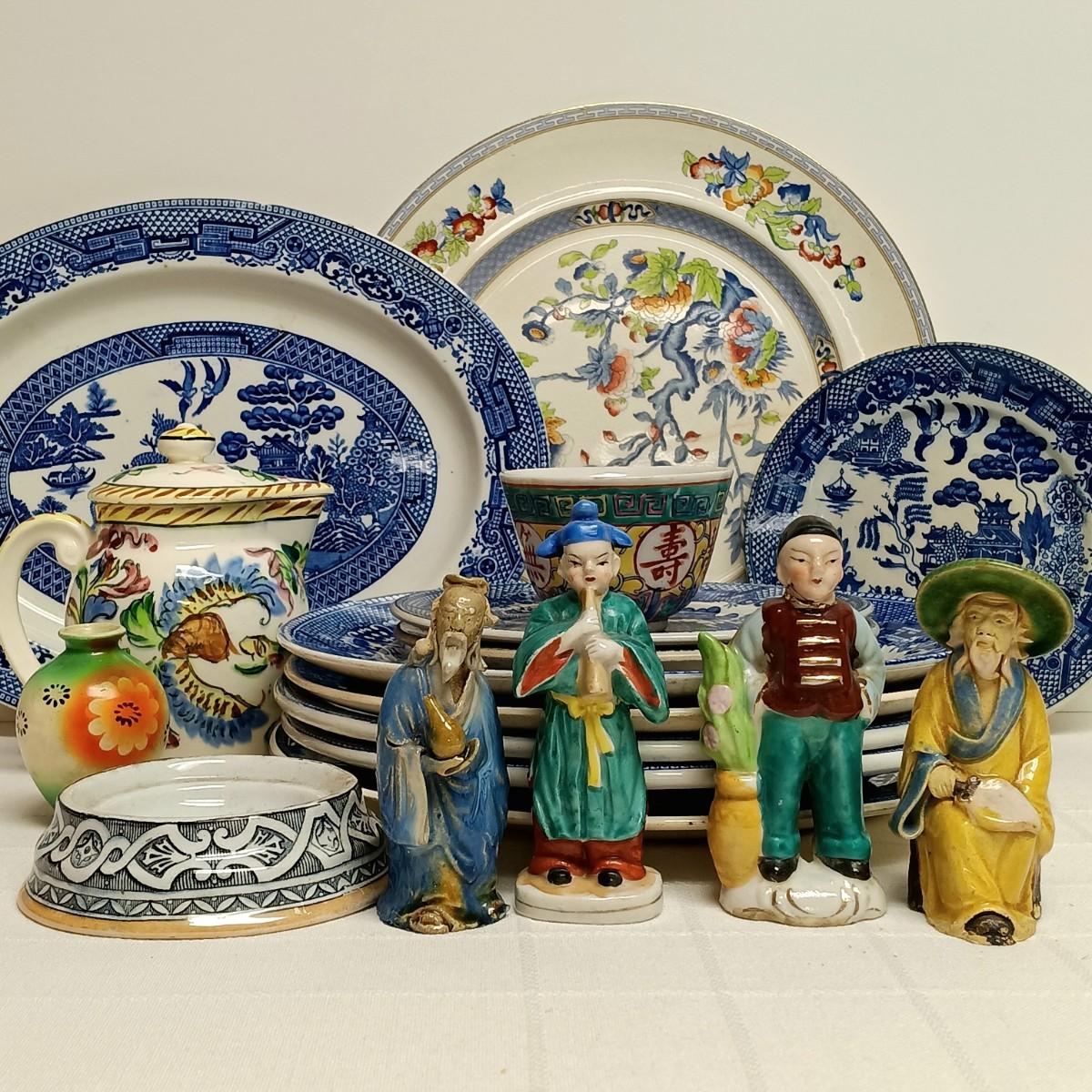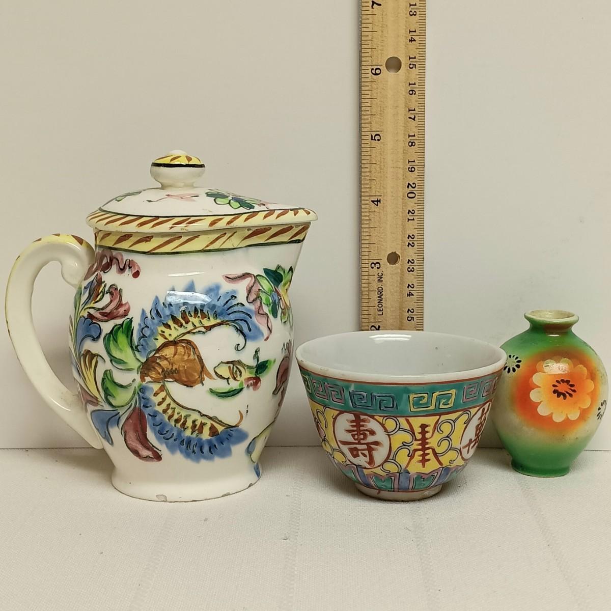 LOT 83B: Asian-Inspired Collection of China Dishes, High Mount Hand Painted Pitcher, Pottery Figurines & More