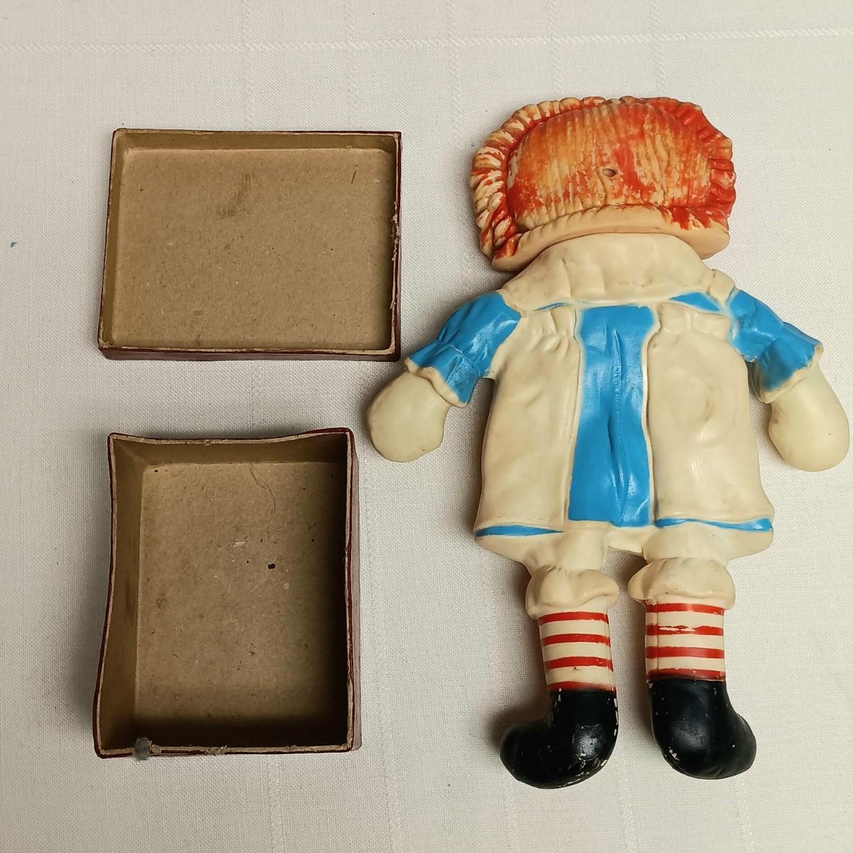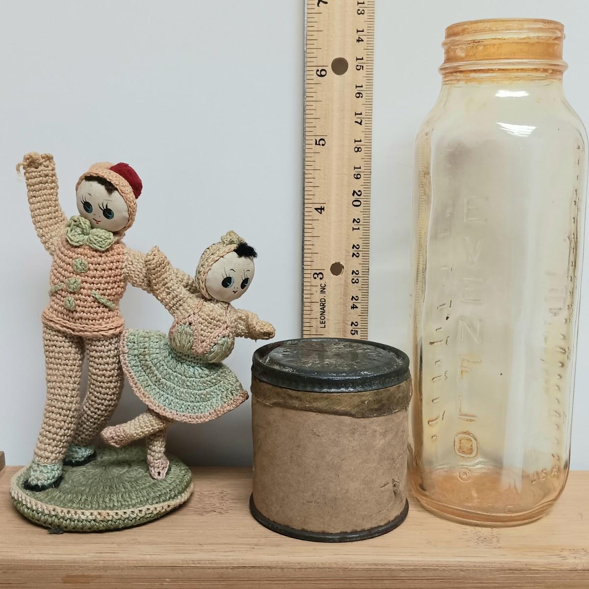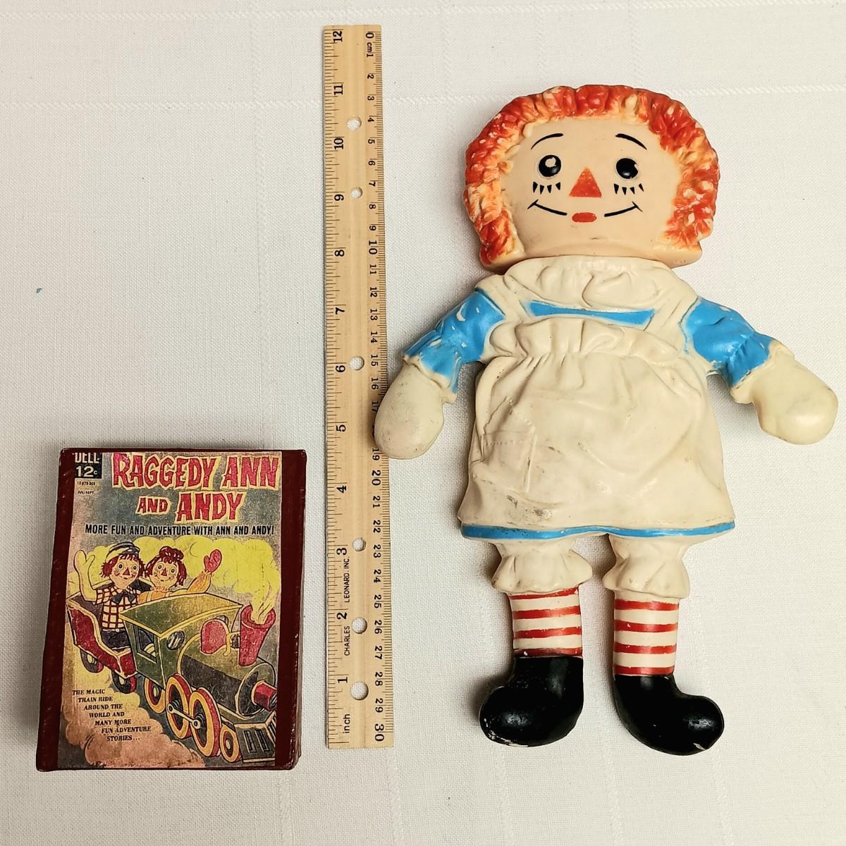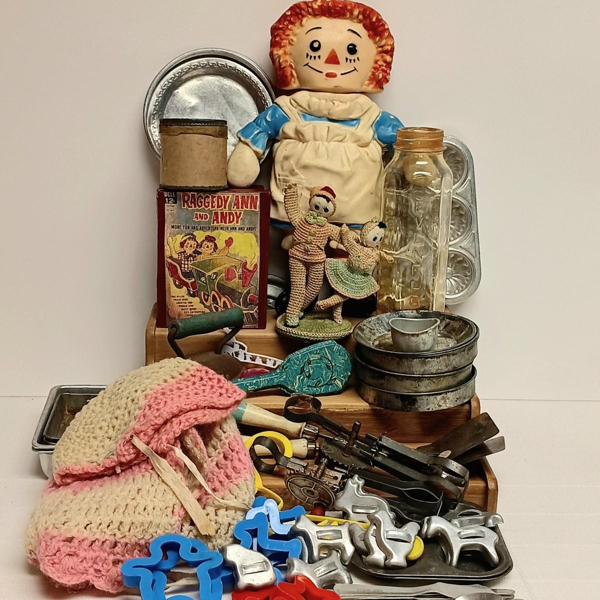 LOT 89B: Vintage Toy Collection- Raggedy Ann Squeaky Toy, Child-Sizw Cookie Cutters and Kitchenware, Crocheted Dolls & More