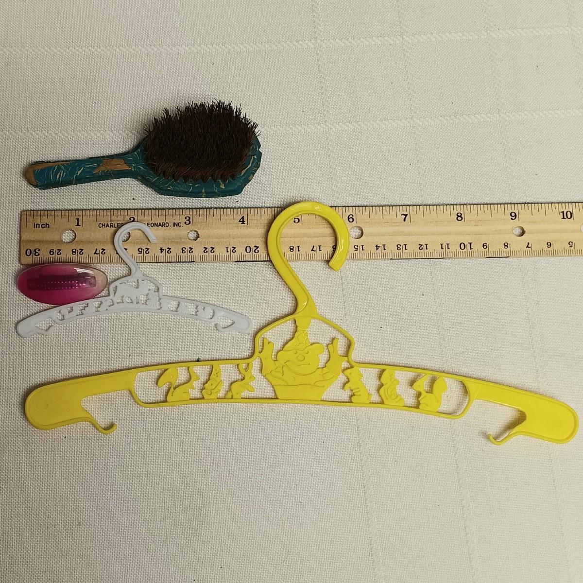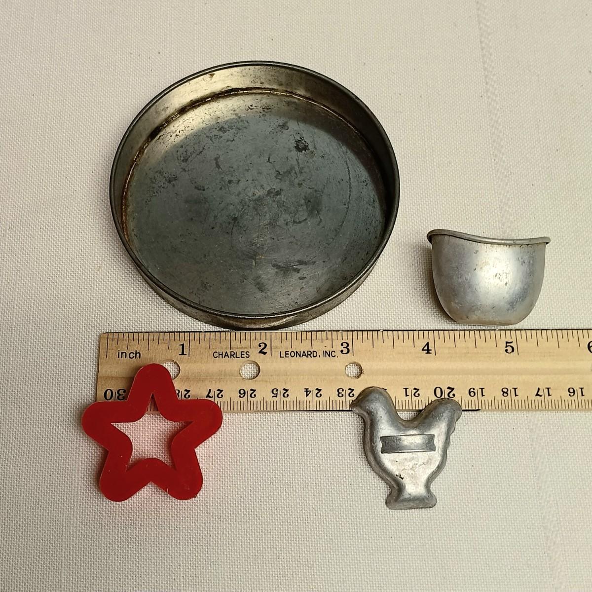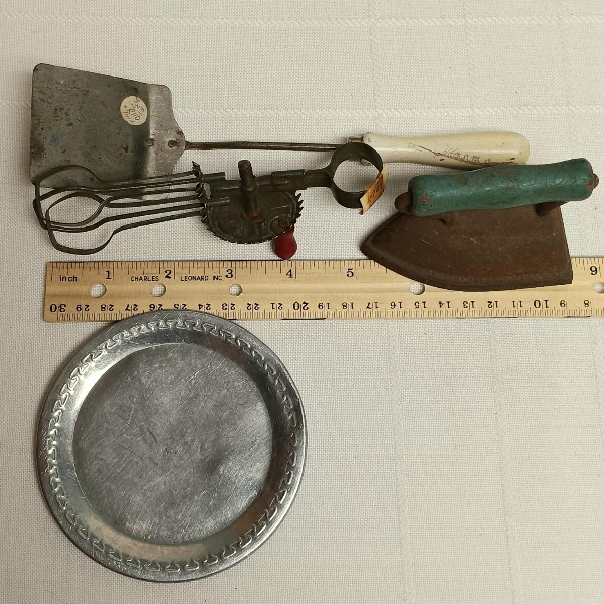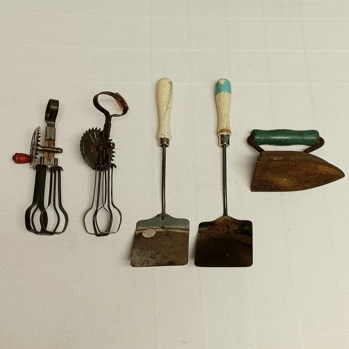 LOT 89B: Vintage Toy Collection- Raggedy Ann Squeaky Toy, Child-Sizw Cookie Cutters and Kitchenware, Crocheted Dolls & More